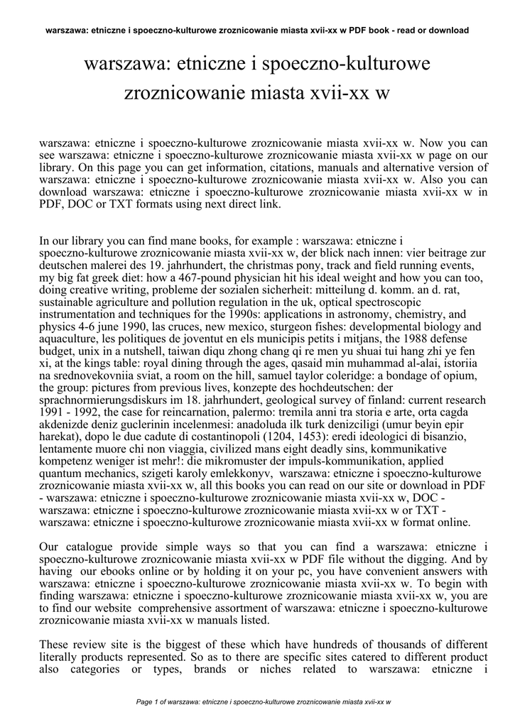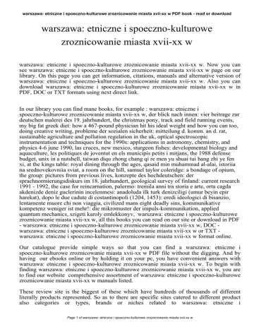 warszawa: etniczne i spoeczno-kulturowe zroznicowanie miasta xvii-xx w PDF book - read or download warszawa: etniczne i spoeczno-kulturowe zroznicowanie miasta xvii-xx w warszawa: etniczne i spoeczno-kulturowe zroznicowanie miasta xvii-xx w. Now you can see warszawa: etniczne i spoeczno-kulturowe zroznicowanie miasta xvii-xx w page on our library. On this page you can get information, citations, manuals and alternative version of warszawa: etniczne i spoeczno-kulturowe zroznicowanie miasta xvii-xx w. Also you can download warszawa: etniczne i spoeczno-kulturowe zroznicowanie miasta xvii-xx w in PDF, DOC or TXT formats using next direct link. In our library you can find mane books, for example : warszawa: etniczne i spoeczno-kulturowe zroznicowanie miasta xvii-xx w, der blick nach innen: vier beitrage zur deutschen malerei des 19. jahrhundert, the christmas pony, track and field running events, my big fat greek diet: how a 467-pound physician hit his ideal weight and how you can too, doing creative writing, probleme der sozialen sicherheit: mitteilung d. komm. an d. rat, sustainable agriculture and pollution regulation in the uk, optical spectroscopic instrumentation and techniques for the 1990s: applications in astronomy, chemistry, and physics 4-6 june 1990, las cruces, new mexico, sturgeon fishes: developmental biology and aquaculture, les politiques de joventut en els municipis petits i mitjans, the 1988 defense budget, unix in a nutshell, taiwan diqu zhong chang qi re men yu shuai tui hang zhi ye fen xi, at the kings table: royal dining through the ages, qasaid min muhammad al-alai, istoriia na srednovekovniia sviat, a room on the hill, samuel taylor coleridge: a bondage of opium, the group: pictures from previous lives, konzepte des hochdeutschen: der sprachnormierungsdiskurs im 18. jahrhundert, geological survey of finland: current research 1991 - 1992, the case for reincarnation, palermo: tremila anni tra storia e arte, orta cagda akdenizde deniz guclerinin incelenmesi: anadoluda ilk turk denizciligi (umur beyin epir harekat), dopo le due cadute di costantinopoli (1204, 1453): eredi ideologici di bisanzio, lentamente muore chi non viaggia, civilized mans eight deadly sins, kommunikative kompetenz weniger ist mehr!: die mikromuster der impuls-kommunikation, applied quantum mechanics, szigeti karoly emlekkonyv, warszawa: etniczne i spoeczno-kulturowe zroznicowanie miasta xvii-xx w, all this books you can read on our site or download in PDF - warszawa: etniczne i spoeczno-kulturowe zroznicowanie miasta xvii-xx w, DOC warszawa: etniczne i spoeczno-kulturowe zroznicowanie miasta xvii-xx w or TXT warszawa: etniczne i spoeczno-kulturowe zroznicowanie miasta xvii-xx w format online. Our catalogue provide simple ways so that you can find a warszawa: etniczne i spoeczno-kulturowe zroznicowanie miasta xvii-xx w PDF file without the digging. And by having our ebooks online or by holding it on your pc, you have convenient answers with warszawa: etniczne i spoeczno-kulturowe zroznicowanie miasta xvii-xx w. To begin with finding warszawa: etniczne i spoeczno-kulturowe zroznicowanie miasta xvii-xx w, you are to find our website comprehensive assortment of warszawa: etniczne i spoeczno-kulturowe zroznicowanie miasta xvii-xx w manuals listed. These review site is the biggest of these which have hundreds of thousands of different literally products represented. So as to there are specific sites catered to different product also categories or types, brands or niches related to warszawa: etniczne i Page 1 of warszawa: etniczne i spoeczno-kulturowe zroznicowanie miasta xvii-xx w warszawa: etniczne i spoeczno-kulturowe zroznicowanie miasta xvii-xx w PDF book - read or download spoeczno-kulturowe zroznicowanie miasta xvii-xx w. So depending on just what you are searching, you shall be in a position to choose ebooks warszawa: etniczne i spoeczno-kulturowe zroznicowanie miasta xvii-xx w to fit your own needs, warszawa: etniczne i spoeczno-kulturowe zroznicowanie miasta xvii-xx w. Page 2 of warszawa: etniczne i spoeczno-kulturowe zroznicowanie miasta xvii-xx w