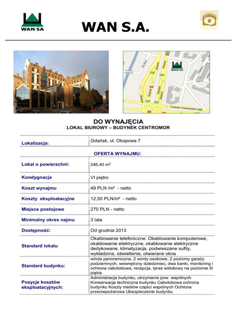 WAN S.A. DO WYNAJĘCIA LOKAL BIUROWY – BUDYNEK CENTROMOR Lokalizacja: Gdańsk, ul. Okopowa 7 OFERTA WYNAJMU: Lokal o powierzchni: 246,40 m² Kondygnacja VI piętro Koszt wynajmu 49 PLN /m² - netto Koszty eksploatacyjne 12,50 PLN/m² - netto Miejsce postojowe 270 PLN - netto Minimalny okres najmu 3 lata Dostępność: Od grudnia 2013 Standard lokalu Okablowanie telefoniczne. Okablowanie komputerowe, okablowanie elektryczne, okablowanie elektryczne dedykowane, klimatyzacja, podwieszane sufity, wykładzina, oświetlenie, otwierane okna Standard budynku: Pozycje kosztów eksploatacyjnych: winda panoramiczna, 2 windy osobowe, 2 poziomy garaży podziemnych, wewnętrzny dziedziniec, dwa banki, monitoring i ochrona całodobowa, recepcja, taras widokowy na poziomie III piętra. Administracja budynku, utrzymanie pow. wspólnych Konserwacja techniczna budynku Całodobowa ochrona budynku Koszty mediów części wspólnych Ochrona przeciwpożarowa Ubezpieczenie budynku RZUT LOKALU WAN S.A. ul Okopowa 7,Gdańsk, Centromor tel. 602 250 018, 58 308 10 57;