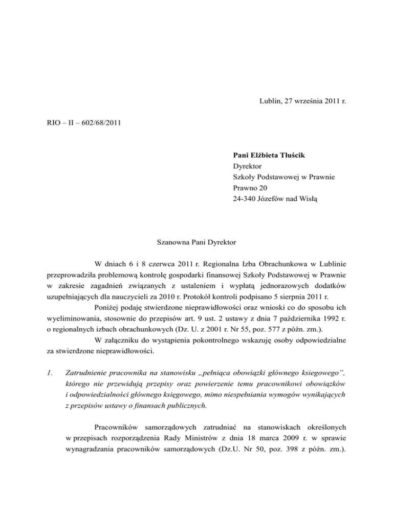 Lublin, 27 września 2011 r. RIO – II – 602/68/2011 Pani Elżbieta Tłuścik Dyrektor Szkoły Podstawowej w Prawnie Prawno 20 24-340 Józefów nad Wisłą Szanowna Pani Dyrektor W dniach 6 i 8 czerwca 2011 r. Regionalna Izba Obrachunkowa w Lublinie przeprowadziła problemową kontrolę gospodarki finansowej Szkoły Podstawowej w Prawnie w zakresie zagadnień związanych z ustaleniem i wypłatą jednorazowych dodatków uzupełniających dla nauczycieli za 2010 r. Protokół kontroli podpisano 5 sierpnia 2011 r. Poniżej podaję stwierdzone nieprawidłowości oraz wnioski co do sposobu ich wyeliminowania, stosownie do przepisów art. 9 ust. 2 ustawy z dnia 7 października 1992 r. o regionalnych izbach obrachunkowych (Dz. U. z 2001 r. Nr 55, poz. 577 z późn. zm.). W załączniku do wystąpienia pokontrolnego wskazuję osoby odpowiedzialne za stwierdzone nieprawidłowości. 1. Zatrudnienie pracownika na stanowisku „pełniąca obowiązki głównego ksiegowego”, którego nie przewidują przepisy oraz powierzenie temu pracownikowi obowiązków i odpowiedzialności głównego księgowego, mimo niespełniania wymogów wynikających z przepisów ustawy o finansach publicznych. Pracowników samorządowych zatrudniać na stanowiskach określonych w przepisach rozporządzenia Rady Ministrów z dnia 18 marca 2009 r. w sprawie wynagradzania pracowników samorządowych (Dz.U. Nr 50, poz. 398 z późn. zm.). 2 Przepisy te nie przewidują stanowiska „pełniący obowiązki”. Obowiązki i odpowiedzialność w zakresie określonym w przepisach art. 54 ust. 1 ustawy z dnia 27 sierpnia 2009 r. o finansach publicznych (Dz. U. Nr 157, poz. 1240 z późn. zm.) powierzać pracownikowi, zatrudnionemu na stanowisku głównego księgowego, mając na uwadze że osoba zatrudniona na tym stanowisku winna spełniać w zakresie kwalifikacji zawodowych – jeden z warunków określonych w przepisach art. 54 ust. 2 pkt 5 tej ustawy – str. 1 protokołu. 2. Nieprawidłowe ustalenie średniorocznej struktury zatrudnienia nauczycieli kontraktowych i stażystów, w wyniku : - zaliczenia w okresie styczeń – sierpień 2010 r. nauczyciela stażysty do grupy nauczycieli kontraktowych, co skutkowało nieprawidłowym ustaleniem wydatków poniesionych na wynagrodzenia nauczycieli kontraktowych (zawyżono) i stażystów (zaniżono), - zaniżenia jej o część etatu (2/18), - przyjmowania do obliczeń, w miesiącu, w którym nauczyciel pobierał zasiłek lub inne świadczenia z ZUS - ilości dni roboczych w danym miesiącu. Średnioroczną strukturę zatrudnienia nauczycieli ustalać na podstawie średniorocznej liczby etatów na poszczególnych stopniach awansu zawodowego, z uwzględnieniem uzyskania kolejnych stopni awansu zawodowego w danym roku, stosownie do przepisów § 3 ust. 1 rozporządzenia Ministra Edukacji Narodowej z dnia 13 stycznia 2010 r. w sprawie sposobu opracowywania sprawozdania z wysokości średnich wynagrodzeń nauczycieli na poszczególnych stopniach awansu zawodowego w szkołach prowadzonych przez jednostki samorządu terytorialnego (Dz. U. Nr 6, poz. 35 z późn. zm.). Przy ustalaniu średniorocznej struktury zatrudnienia: - nauczycieli, którzy w danym roku uzyskali kolejny stopień awansu zawodowego uwzględniać proporcjonalnie do okresu pobierania wynagrodzenia na danym stopniu awansu zawodowego, zgodnie z przepisami § 3 ust. 3 rozporządzenia, - uwzględniać liczbę etatów nauczycieli w okresach, w których wypłacono im wynagrodzenie ze środków ujętych w planie finansowym szkoły, zgodnie z wymiarem zatrudnienia określonym w umowie o pracę lub w akcie mianowania, stosownie do przepisów § 3 ust. 6 rozporządzenia; - nie uwzględniać liczby etatów proporcjonalnie do okresów, w których nauczyciele pobierali zasiłek chorobowy, świadczenie rehabilitacyjne lub zasiłek opiekuńczy, stosownie do przepisów § 3 ust. 7 rozporządzenia. Ustalając okres zatrudnienia nauczyciela, który przez część miesiąca pobierał 3 zasiłek lub inne świadczenie z Zakładu Ubezpieczeń Społecznych, za miesiąc przyjmować 30 dni, stosownie do objaśnień zawartych w pkt 1 załącznika Nr 1 do cytowanego rozporządzenia. Przy ustalaniu wysokości wydatków poniesionych na wynagrodzenia nauczycieli uwzględniać wydatki poniesione z budżetu jednostki samorządu terytorialnego na wynagrodzenia w składnikach wskazanych w art. 30 ust. 1 ustawy z dnia 26 stycznia 1982 r. Karta Nauczyciela (Dz. U. z 2006 r. Nr 97, poz. 674 z późn. zm.), z uwzględnieniem wynagrodzenia uzyskanego w danej grupie awansu zawodowego, stosownie do pkt I.4 objaśnień zawartych w załączniku Nr 2 do rozporządzenia i w związku z przepisami art. 39 ust. 1 cytowanej ustawy – str. 3-5 protokołu. Jeżeli uważa Pani, że wnioski zawarte w tym wystąpieniu naruszają prawo przez błędną jego wykładnię lub niewłaściwe zastosowanie, przysługuje Pani – zgodnie z art. 9 ust. 3 i 4 ustawy o regionalnych izbach obrachunkowych – prawo zgłoszenia zastrzeżeń do Kolegium Regionalnej Izby Obrachunkowej w Lublinie w ciągu 14 dni od otrzymania tego wystąpienia. Jednocześnie informuję, że – stosownie do przepisu art. 9 ust. 3 ustawy o regionalnych izbach obrachunkowych – jest Pani zobowiązana zawiadomić Izbę o wykonaniu wniosków pokontrolnych lub o przyczynach ich niewykonania – w formie pisemnej i elektronicznej (plik w formacie Microsoft Word (*.doc) lub Rich Tekst Format (*.rtf) na adres: [email protected]) – w terminie 30 dni od daty doręczenia Pani tego wystąpienia, mając na uwadze przepisy art. 27 tej ustawy. Jacek Grządka Do wiadomości: Wójt Gminy Józefów nad Wisłą ul. Opolska 33 F 24 - 340 Józefów nad Wisłą