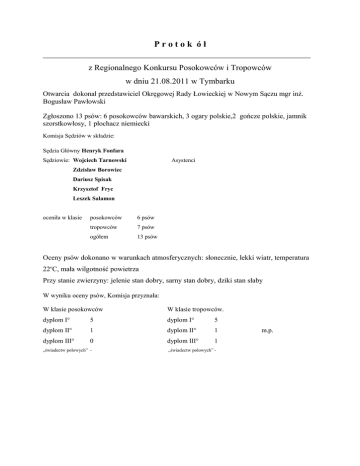 Protok ół ___________________________________________________________ z Regionalnego Konkursu Posokowców i Tropowców w dniu 21.08.2011 w Tymbarku Otwarcia dokonał przedstawiciel Okręgowej Rady Łowieckiej w Nowym Sączu mgr inż. Bogusław Pawłowski Zgłoszono 13 psów: 6 posokowców bawarskich, 3 ogary polskie,2 gończe polskie, jamnik szorstkowłosy, 1 płochacz niemiecki Komisja Sędziów w składzie: Sędzia Główny Henryk Fonfara Sędziowie: Wojciech Tarnowski Asystenci Zdzisław Borowiec Dariusz Spisak Krzysztof Fryc Leszek Salamon oceniła w klasie posokowców 6 psów tropowców 7 psów ogółem 13 psów Oceny psów dokonano w warunkach atmosferycznych: słonecznie, lekki wiatr, temperatura 22oC, mała wilgotność powietrza Przy stanie zwierzyny: jelenie stan dobry, sarny stan dobry, dziki stan słaby W wyniku oceny psów, Komisja przyznała: W klasie posokowców W klasie tropowców. dyplom I° 5 dyplom I° 5 dyplom II° 1 dyplom II° 1 dyplom III° 0 dyplom III° 1 „świadectw polowych” - „świadectw polowych” - m.p. W klasie: posokowców dyplom I°, lok. 1, oraz nagrodę ZG PZŁ (ZW PZŁ) przyznano DINA z Hubertowej Psiarni, VI-12935 dyplom I °, lok. 2, oraz nagrodę ZG PZŁ (ZW PZŁ) przyznano DUNAJ z Tymbarskiej Kniei, VI-14187 dyplom I °, lok. 3, oraz nagrodę ZG PZŁ (ZW PZŁ) przyznano CYRUS z Tymbarskiej Kniei, VI-12441 W klasie: tropowców Dyplom I °, lok. 1, oraz nagrodę ZG PZŁ (ZW PZŁ) przyznano IDOL Goniec Pomorski, VI-10489 dyplom I °, lok. 2, oraz nagrodę ZG PZŁ (ZW PZŁ) przyznano TAO Goniec Małopolski, WU.VI-13648 dyplom I °, lok. 3, oraz nagrodę ZG PZŁ (ZW PZŁ) przyznano ENIGMA z Południowej Kniei, VI-11427 Podsumowania i wręczenia dyplomów oraz nagród dokonał: Sędzia główny Henryk Fonfara, Członek Zarządu Okręgowego PZŁ w Nowym Sączu Michał Zapała. Zamknięcia imprezy dokonał Przewodniczący Komisji Kynologicznej w Nowym Sączu Bogusław Pawłowski. Na tym protokół zakończono: Sędzia główny Załączniki: 1. Karty ocen pracy psa (2 kpl.). 2. Rozliczenie finansowe imprezy (2 kpl.) Henryk Fonfara (miejscowość, data i podpis)