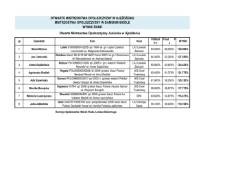 OTWARTE MISTRZOSTWA OPOLSZCZYZNY W UJEŻDŻENIU MISTRZOSTWA OPOLSZCZYZNY W DAMSKIM SIODLE WYNIKI RUND Otwarte Mistrzostwa Opolszczyzny Juniorów w Ujeżdżeniu Lp Zawodnik 1 Maria Michna 2 Jan Limburski 3 Aneta Gajdzińska 4 Agnieszka Siedlak 5 Ada Szewińska 6 Monika Borzęcka 7 Wiktoria Łuszczyńska 8 Julia Jabłońska Koń Klub Lelek/ 616009690142295/ sp/ 1994/ sk. gn./ ogier/ Libellus/ Lemoniada/ wł. Malgorzata Kaliszewska Rainbow/ klacz/ DE 431316614607/ hann/ 2007/ sk.gn./ Romancero H/ Wenzelskrone/ wł. Andrzej Sałacki Nobius/ Pol 009660213008/ sp/ 2008/ c. gn./ wałach/ Wieland/ Nescafe/ wł. Aneta Gajdzińska Regata/ POL008590050208/ śl/ 2008/ gniada/ klacz/ Polska/ Berdysz/ Rewia/ wł. Anna Siedlak Garson/ POL009660042001/ sp/ 2003/ c. gniady/ wałach/ Polska/ Gawor/ Gracja/ wł. Aneta Szewińska Sagiwara/ 18784/ sp/ 2009/ gniada/ klacz/ Polska/ Asceta/ Sarisa/ wł. Wojciech Borzęcki Mewolta/ 009680049405/ sp/ 2005/ gniada/ klacz/ Polska/ Le Voltaire/ Melodi/ wł. Anna Łuszczyńska Goia/ 040018710006706/ aust. gorącokrwista/ 2006/ kara/ klacz/ Polska/ Garibaldi/ Arosa/ wł. Kamilla Polednia-Jabłońska LKJ Lewada Zakrzów LKJ Lewada Zakrzów LKJ Lewada Zakrzów JKS Cwał Truskolasy JKS Cwał Truskolasy JKS Cwał Truskolasy Komisja Sędziowska: Marek Ruda, Łukasz Dziarmaga Półfinał P-1 Finał P3 WYNIK 64,000% 66,000% 130,000% 64,300% 63,250% 127,550% 60,800% 63,625% 124,425% 60,400% 61,375% 121,775% 61,900% 58,250% 120,150% 58,900% 58,875% 117,775% BPK 60,600% 54,875% 115,475% LKJ Ostroga Opole 55,100% 55,000% 110,100% Otwarte Mistrzostwa Opolszczyzny Seniorów w Ujeżdżeniu Lp Zawodnik 1 Jagoda Dąbrowska 2 Natalia Stodoła 3 Nikola Marczak 4 Aleksandra Pośpiech 5 Izabela Szlosarek 6 Paulina Lis Koń Klub Why Not/ k/ DE 431316769203/ Hannover/ 2003/ kasztan/ Weltregent H/ Claerchen po Cordoba/ wł. Andrzej Sałacki Drakar/ wałach/ POL009690009405/ SP/ 2005/ gniada/ Landjonker S/ Dexstera / Uskudar Des Malais/ wł. Witold Stodoła Miss You/ DE431316705308/ han./ 2008/ gniada/ klacz/ Margue H/ Wie Donna/ wł. Andrzej Sałacki Hun I/ wałach/ POL009670007800/ sp/ 2000/ gniada/ Niels/ Hura I/ Hipovit/ wł. Roman Pośpiech Wagner/ DE431315129005/ han./ 2005/ kasztan/ wałach/ Worldly/ Lara/ wł. Wł. Andrzej Sałacki Haiti / klacz/ POL009540059608/ SP/ 2008/ gniada/ Polska/ Aron/ Hańcza po Grey/ wł. Bogusław Lis LKJ Lewada Zakrzów LKJ Lewada Zakrzów LKJ Lewada Zakrzów LKJ Lewada Zakrzów LKJ Lewada Zakrzów JKS Cwał Truskolasy Komisja Sędziowska: Marek Ruda, Łukasz Dziarmaga Półfinał C-2 Finał C3 WYNIK NAGRODA 65,136% 66,711% 131,847% 700 zł 65,608% 65,790% 131,398% 500 zł 63,514% 63,684% 127,198% 300 zł 62,703% 62,829% 125,532% - 59,730% 63,026% 122,756% - 58,446% 61,645% 120,091% - Mistrzostwa Opolszczyzny w Ujeżdżeniu w Damskim Siodle Klub Półfinał L Staj Lagamon 66,156% 69,815% 135,971% BPK 66,346% 67,593% 133,939% BPK 66,923% 66,667% 133,590% 62,500% 70,556% 133,056% 66,538% 66,296% 132,834% IV Pułk Ułanów Zaniemeńskich 64,038% 65,741% 129,779% Bajka/ klacz/ gniada/ mały koń/ NN/ NN/ wł. LKJ Lewada BPK 61,923% 61,667% 123,590% Karmazyn/ wałach/ SP/ gniady/ NN/ NN/ wł. LKJ Lewada BPK 59,423% 61,852% 121,275% Lp Zawodnik Koń 1 Iva Lasakova 2 Katarzyna Fert 3 Olivia Ribol 4 Karolina Frankelova 5 Asenata Adamus 6 Karolina Rej Omega/ sp/ gniada/ klacz/ NN/ NN/ wł. LKJ Lewada 7 Aleksandra Gilarska 8 Sonia Schwalbe Lagged Dreams/ 203011227203306/ wałach/ gniada/ 2006/ All My Dreams/ Verisa/ wł. Iva Lasakova Boliwia/ klacz/ skarogniada/ sp/ 2006/ Alkad/ Basia/ wł. Katarzyna Fert Nomad/ / 1997/ gniada/ wałach/ Polska/ Carpaccio/ Normandia/ wł. Edward Gondecki Solo Famara XXI-5/ 203006447501907/ kladruber/ wałach/ kara/ 2007/Solo Mirha XXI/ Famata -16/ wł. Karolina Frankelova Nomad/ / 1997/ gniada/ wałach/ Polska/ Carpaccio/ Normandia/ wł. Edward Gondecki Ramik Sidesaddle Team BPK Komisja sędziowska: Monika Krausova, Marek Ruda i Łukasz Dziarmaga Finał P WYNIK