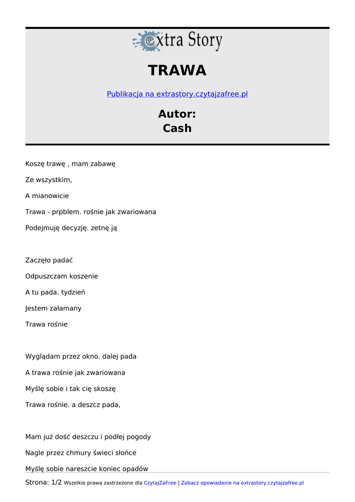 TRAWA Publikacja na extrastory.czytajzafree.pl Autor: Cash Koszę trawę , mam zabawę Ze wszystkim, A mianowicie Trawa - prpblem. rośnie jak zwariowana Podejmuję decyzję. zetnę ją Zaczęło padać Odpuszczam koszenie A tu pada. tydzień Jestem załamany Trawa rośnie Wyglądam przez okno. dalej pada A trawa rośnie jak zwariowana Myślę sobie i tak cię skoszę Trawa rośnie. a deszcz pada, Mam już dość deszczu i podłej pogody Nagle przez chmury świeci słońce Myślę sobie nareszcie koniec opadów Strona: 1/2 Wszelkie prawa zastrzeżone dla CzytajZaFree | Zobacz opowiadanie na extrastory.czytajzafree.pl I tak się stało, mamy piękną pogodę. Teraz trzeba poczekać, aż trawa wyschnie Jeden dzień słonecznej pogody sprawił Trawa sucha, tylko kosić Ale jaka wielka wyrosła! Odpalam koxiarkę i koszę. koszę Już nie mam siły A trawa rośnie. Ale jak pachnie-------- . Tego się nie da opisać. Strona: 2/2 Wszelkie prawa zastrzeżone dla CzytajZaFree | Zobacz opowiadanie na extrastory.czytajzafree.pl