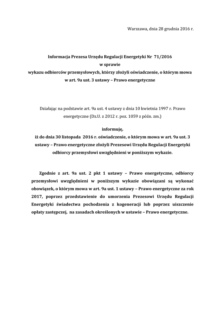 Informacja Prezesa URE nr 71/2016 w sprawie wykazu