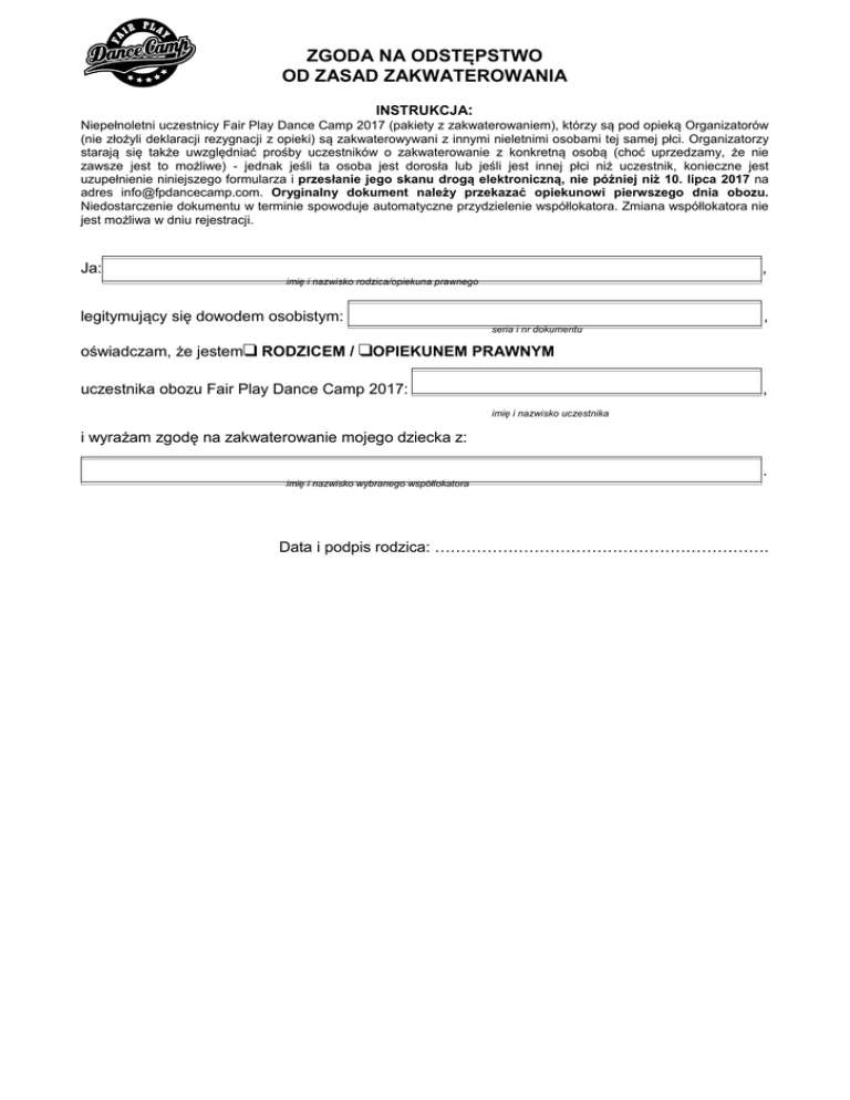 ZGODA NA ODSTĘPSTWO OD ZASAD ZAKWATEROWANIA INSTRUKCJA: Niepełnoletni uczestnicy Fair Play Dance Camp 2017 (pakiety z zakwaterowaniem), którzy są pod opieką Organizatorów (nie złożyli deklaracji rezygnacji z opieki) są zakwaterowywani z innymi nieletnimi osobami tej samej płci. Organizatorzy starają się także uwzględniać prośby uczestników o zakwaterowanie z konkretną osobą (choć uprzedzamy, że nie zawsze jest to możliwe) - jednak jeśli ta osoba jest dorosła lub jeśli jest innej płci niż uczestnik, konieczne jest uzupełnienie niniejszego formularza i przesłanie jego skanu drogą elektroniczną, nie później niż 10. lipca 2017 na adres [email protected]. Oryginalny dokument należy przekazać opiekunowi pierwszego dnia obozu. Niedostarczenie dokumentu w terminie spowoduje automatyczne przydzielenie współlokatora. Zmiana współlokatora nie jest możliwa w dniu rejestracji. Ja: , imię i nazwisko rodzica/opiekuna prawnego legitymujący się dowodem osobistym: , seria i nr dokumentu oświadczam, że jestem❑ RODZICEM / ❑OPIEKUNEM PRAWNYM uczestnika obozu Fair Play Dance Camp 2017: , imię i nazwisko uczestnika i wyrażam zgodę na zakwaterowanie mojego dziecka z: . imię i nazwisko wybranego współlokatora Data i podpis rodzica: ……………………………………………………….