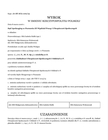 Sygn. akt III AUa 1101/15 WYROK W IMIENIU RZECZYPOSPOLITEJ POLSKIEJ Dnia 8 marca 2016 r. Sąd Apelacyjny w Poznaniu III Wydział Pracy i Ubezpieczeń Społecznych w składzie: Przewodniczący: SSA Izabela Halik (spr.) Sędziowie: SSA Katarzyna Wołoszczak del. SSO Małgorzata Aleksandrowicz Protokolant: st.sekr.sąd. Emilia Wielgus po rozpoznaniu w dniu 23 lutego 2016 r. w Poznaniu sprawy (...) A. N., M. N. Sp. j. z siedzibą w O. przeciwko Zakładowi Ubezpieczeń Społecznych I Oddział w P. przy udziale zainteresowanego P. A. o podstawę wymiaru składek na skutek apelacji Zakładu Ubezpieczeń Społecznych I Oddział w P. od wyroku Sądu Okręgowego w Poznaniu z dnia 27 lutego 2015 r. sygn. akt VIII U 2114/13 1. zmienia zaskarżony wyrok w punkcie 1 i oddala odwołanie; 2. zmienia zaskarżony wyrok w punkcie 2 i zasądza od odwołującej spółki na rzecz pozwanego kwotę 60 zł tytułem kosztów zastępstwa procesowego; 3. zasądza od odwołującej spółki na rzecz pozwanego kwotę 120 zł tytułem kosztów zastępstwa procesowego w instancji odwoławczej. del. SSO Małgorzata Aleksandrowicz SSA Izabela Halik SSA Katarzyna Wołoszczak UZASADNIENIE Decyzją z dnia 27 marca 2013 r., znak (...)- (...), adresowaną do (...) A. N., M. N. s. j. z siedzibą w O. oraz P. A., Zakład Ubezpieczeń Społecznych I Oddział w P., stwierdził, iż podstawę wymiaru składek dla P. A. z tytułu zatrudnienia u płatnika składek (...) sp. j. A. N. i M. N. stanowi kwota: data realizacji równowartości lojalnościowego rrrr) 10/2010 wypłaty znaczka (mm/ kod tytułu ubezpieczenia podstawa wymiaru składek na ubezpieczenia społeczne podstawa wymiaru składek na ubezpieczenie zdrowotne 300000 1.335,49 zł 1.152,40 zł – po ubezpieczenia ustaniu Odwołanie od powyżej decyzji wywiódł płatnik składek (...) sp. j. A. N. i M. N., wnosząc o jej zmianę w całości poprzez stwierdzenie, iż do podstawy wymiaru składek na ubezpieczenia społeczne i ubezpieczenie zdrowotne nie wlicza się kwot wskazanych w decyzji (przy przyjęciu za podstawę ustalenia składki wartości przekazanych ubezpieczonemu znaczków lojalnościowych na Fundusz Zabezpieczenia Bytu Pracowników) oraz o zasądzenie na rzecz Spółki kosztów postępowania, w tym kosztów zastępstwa procesowego według norm przepisanych. W odpowiedzi na odwołanie pozwany organ rentowy wniósł o jego oddalenie oraz o zasądzenie od odwołującej spółki zwrotu kosztów postępowania według norm przepisanych. Organ rentowy powtórzył argumentację zawartą w uzasadnieniu decyzji wskazując dodatkowo, iż znaczki lojalnościowe były wypłacane przez Fundusz z części składek w wysokości 9,12 % kwoty wynagrodzeń pracowników w minionym kwartale, uiszczanych przez odwołującego do belgijskiej organizacji (...) ( (...)) z siedzibą w B.. Sąd nie wzywał P. A. do udziału w postępowaniu odrębnym postanowieniem, bowiem był on już stroną postępowania administracyjnego przed organem rentowym i adresatem decyzji, stając się automatycznie stroną postępowania odwoławczego. Sąd Okręgowy w Poznaniu wyrokiem z dnia 27 lutego 2015 r. w sprawie VIII U 2114/13 zmienił zaskarżoną decyzje i nie doliczył do podstawy wymiaru składek na ubezpieczenia: emerytalne i rentowe, chorobowe, wypadkowe oraz ubezpieczenie zdrowotne P. A. z tytułu zatrudnienia na podstawie umowy o pracę u płatnika składek A. A. N., M. N. sp. j. z siedzibą w O. kwoty 1335,49 zł w październiku 2010r. (pkt 1) i zasądził od pozwanego na rzecz odwołującej spółki kwotę 60 zł tytułem zwrotu kosztów procesu (pkt.2) Podstawą rozstrzygnięcia Sądu były następujące ustalenia : (...) A. N., M. N. sp. j. w O. powstała w 2008 r. i została wpisana do Krajowego Rejestru Sądowego pod numerem (...). Przedmiotem działalności spółki jest m.in. działalność budowlana. Odwołująca spółka prowadziła działalność budowlaną m. in. w Belgii, w ramach której oddelegowywała pracowników budowlanych do pracy w sektorze budownictwa w Belgii. Delegowanie pracowników następowało na podstawie aneksów do umów o pracę zmieniających miejsce świadczenia pracy na miejscowość w Belgii. Dla delegowanych pracowników Spółka uzyskiwała zaświadczenia o podleganiu przez nich polskiemu ustawodawstwu w zakresie ubezpieczeń społecznych. Sąd ustalił, że zgodnie z obowiązkiem wynikającym z ustawodawstwa belgijskiego odwołująca spółka raz na kwartał uiszczała na rzecz belgijskiej organizacji Biura (...) ds. Organizacji i (...) ((...), dalej (...)) z siedzibą w B. składkę. Wysokość tej składki obliczała (...) na podstawie przesyłanych przez odwołującą spółkę list wynagrodzeń. Wysokość składki wynosiła 9,12 % kwoty wynagrodzeń pracowników w minionym kwartale. Odwołująca podawała w (...) również dane socjalno – bytowe zatrudnionych pracowników. Część składki (...) przeznaczał na własną działalność, natomiast z pozostałej części, w ramach Funduszu Zabezpieczenia Bytu (...), finansował tzw. znaczki lojalnościowe dla pracowników, stanowiące premię dla pracowników za wkład w rozwój sektora budowlanego. Wydanie znaczków było uregulowane w regulaminie (...), zgodnie z którym jako data wydania znaczków został ustalony październik danego roku. Pracownicy otrzymywali znaczki lojalnościowe w cyklu rocznym, tj. za okres od lipca roku poprzedniego do czerwca następnego roku (uwzględniano II ostatnie kwartały roku poprzedzającego przyznanie znaczków i II pierwsze kwartały roku, w którym przyznawano znaczki). Wartość znaczka lojalnościowego uzależniona była od sytuacji materialnej pracownika i ustalana przez (...). Odwołująca nie wypłacała pracownikom z tytułu znaczków lojalnościowych żadnych należności. Wypłata pracownikom należności z tytułu znaczków lojalnościowych następowała w ten sposób, iż z (...) do odwołującej lub pośrednika odwołującej przysyłano karty (znaczki)