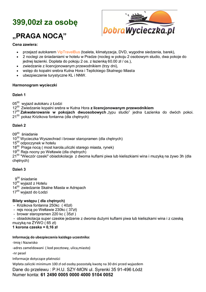 399,00zł za osobę „PRAGA NOCĄ” Cena zawiera: przejazd autokarem VipTravelBus (toaleta, klimatyzacja, DVD, wygodne siedzenia, barek), 2 noclegi ze śniadaniami w hotelu w Pradze (nocleg w pokoju 2 osobowym studio, dwa pokoje do jednej łazienki. Dopłata do pokoju 2 os. z łazienką 60.00 zł / os.), zwiedzanie z licencjonowanym przewodnikiem (trzy dni), wstęp do kopalni srebra Kutna Hora i Teplickiego Skalnego Miasta ubezpieczenie turystyczne KL i NNW. Harmonogram wycieczki Dzień 1 0500 wyjazd autokaru z Łodzi 1200 Zwiedzanie kopalni srebra w Kutna Hora z licencjonowanym przewodnikiem 1700 Zakwaterowanie w pokojach dwuosobowych „typu studio” jedna Łazienka do dwóch pokoi. 2100 pokaz Krizikova fontanna (dla chętnych) Dzień 2 0900 śniadanie 1030 Wycieczka Wyszechrad i browar staropramen (dla chętnych) 1500 odpoczynek w hotelu 1800 Praga nocą ( most karola,uliczki starego miasta, rynek) 1900 Rejs nocny po Wełtawie (dla chętnych) 2100 "Wieczór czeski" obiadokolacja z dwoma kuflami piwa lub kieliszkiami wina i muzyką na żywo 3h (dla chętnych) Dzień 3 900 śniadanie 1000 wyjazd z Hotelu 1400 zwiedzanie Skalne Miasta w Adrspach 1700 wyjazd do Łodzi Bilety wstępu ( dla chętnych) - Krizikova fontanna 250kc ( 40zł) - rejs nocą po Wełtawie 230kc ( 37zł) - browar staropramen 220 kc ( 35zł ) - obiadokolacja super czeskie jedzenie z dwoma dużymi kuflami piwa lub kieliszkami wina i z czeską muzyką na ŻYWO ( 65 zł) 1 korona czeska = 0,16 zł Informację do ubezpieczenia każdego uczestnika: -Imię i Nazwisko -adres zameldowani ( kod pocztowy, ulica,miasto) -nr pesel Informacje dotyczące płatności Wpłata zaliczki minimum 100 zł od osoby pozostałą kwotę na 30 dni przed wyjazdem Dane do przelewu : P.H.U. SZY-MON ul. Syrenki 35 91-496 Łódź Numer konta: 61 2490 0005 0000 4000 5104 0052