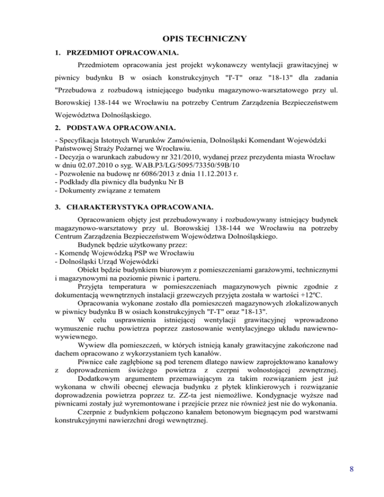 OPIS TECHNICZNY 1. PRZEDMIOT OPRACOWANIA. Przedmiotem opracowania jest projekt wykonawczy wentylacji grawitacyjnej w piwnicy budynku B w osiach konstrukcyjnych "I'-T" oraz "18-13" dla zadania "Przebudowa z rozbudową istniejącego budynku magazynowo-warsztatowego przy ul. Borowskiej 138-144 we Wrocławiu na potrzeby Centrum Zarządzenia Bezpieczeństwem Województwa Dolnośląskiego. 2. PODSTAWA OPRACOWANIA. - Specyfikacja Istotnych Warunków Zamówienia, Dolnośląski Komendant Wojewódzki Państwowej Straży Pożarnej we Wrocławiu. - Decyzja o warunkach zabudowy nr 321/2010, wydanej przez prezydenta miasta Wrocław w dniu 02.07.2010 o syg. WAB.P3/LG/5095/73350/59B/10 - Pozwolenie na budowę nr 6086/2013 z dnia 11.12.2013 r. - Podkłady dla piwnicy dla budynku Nr B - Dokumenty związane z tematem 3. CHARAKTERYSTYKA OPRACOWANIA. Opracowaniem objęty jest przebudowywany i rozbudowywany istniejący budynek magazynowo-warsztatowy przy ul. Borowskiej 138-144 we Wrocławiu na potrzeby Centrum Zarządzenia Bezpieczeństwem Województwa Dolnośląskiego. Budynek będzie użytkowany przez: - Komendę Wojewódzką PSP we Wrocławiu - Dolnośląski Urząd Wojewódzki Obiekt będzie budynkiem biurowym z pomieszczeniami garażowymi, technicznymi i magazynowymi na poziomie piwnic i parteru. Przyjęta temperatura w pomieszczeniach magazynowych piwnic zgodnie z dokumentacją wewnętrznych instalacji grzewczych przyjęta została w wartości +12ºC. Opracowania wykonane zostało dla pomieszczeń magazynowych zlokalizowanych w piwnicy budynku B w osiach konstrukcyjnych "I'-T" oraz "18-13". W celu usprawnienia istniejącej wentylacji grawitacyjnej wprowadzono wymuszenie ruchu powietrza poprzez zastosowanie wentylacyjnego układu nawiewnowywiewnego. Wywiew dla pomieszczeń, w których istnieją kanały grawitacyjne zakończone nad dachem opracowano z wykorzystaniem tych kanałów. Piwnice całe zagłębione są pod terenem dlatego nawiew zaprojektowano kanałowy z doprowadzeniem świeżego powietrza z czerpni wolnostojącej zewnętrznej. Dodatkowym argumentem przemawiającym za takim rozwiązaniem jest już wykonana w chwili obecnej elewacja budynku z płytek klinkierowych i rozwiązanie doprowadzenia powietrza poprzez tz. ZZ-ta jest niemożliwe. Kondygnacje wyższe nad piwnicami zostały już wyremontowane i przejście przez nie również jest nie do wykonania. Czerpnie z budynkiem połączono kanałem betonowym biegnącym pod warstwami konstrukcyjnymi nawierzchni drogi wewnętrznej. 8 Czerpnie przewidziano wolnostojącą z wlotem powietrza żaluzjowym, posadowionym (dolna krawędź czerpni ) nim. 2,0m nad terenem. Lokalizację przedstawiono na mapie z rozprowadzeniem infrastruktury technicznej rys. Nr 01B stanowiący zawartość niniejszej dokumentacji. Dla doprowadzenia powietrza do budynku B kanał zaprojektowano pod przewodem kanalizacji deszczowej o średnicy 300mm. Dno kanału należy posadowić na rzędnej 123,80m npm. Dla budynku B kanał poprowadzono pod mur oporowy i czernie zlokalizowano przy murze. Na trasie kanału przebiega kanalizacja deszczowa aby ją ominąć należy kanał doprowadzający świeże powietrze na potrzeby pomieszczeń w piwnicy budynku B prowadzić pod przewodem kanalizacyjnym. Wentylacja grawitacyjna nawiewno-wywiewna 4. Ogólna charakterystyka wentylacji pomieszczeń Projekt swym zakresem obejmuje wyłącznie wentylację pomieszczeń piwnicznych usytuowanych pomiędzy osiami konstrukcyjnymi "I'-T" oraz "18-13" w części B istniejącego budynku magazynowo-warsztatowego. Obliczeniowa ilość powietrza – założenia. - strefa klimatyczna II (Wrocław) – przyjęto temperaturę powietrza zewnętrznego dla zimy minus 18°C, - ilość wymian powietrza dla pomieszczeń magazynowych zlokalizowanych w piwnicy – 1,0W/h - nawiew świeżego powietrza 0,95% obliczeniowej wartości powietrza wywiewanego Wszystkie pomieszczenia będące w zakresie niniejszego opracowania zlokalizowane są w piwnicy. Pomieszczenia o wysokości c.a. 2,81m. Pomieszczenia nie posiadające dostępu do oświetlenia dziennego - brak okien. Piwnice na całej wysokości zagłębione w gruncie. 5. Instalacja wentylacji nawiewnej i wywiewnej. Lokalizacja kanałów wywiewnych i nawiewnych pokazano na rzucie kondygnacji. Wyliczenia ilości powietrza wykonano w odniesieniu do kubatury pomieszczenia przy założeniu jednej wymiany powietrza do uzyskania w ciągu godziny. Zastosowano dla wentylacji układ wymuszony zarówno w odniesieniu do ilości powietrza usuwanego jak i dostarczanego do pomieszczeń. Dla pomieszczeń magazynowych zlokalizowanych w piwnicy w projekcie instalacji grzewczych przyjęto utrzymanie temperatury 12ºC. Wentylacja grawitacyjna o naturalnym ruchu przepływu przez pomieszczenie z usuwaniem go na zewnętrz uzależniona jest od temperatur w pomieszczeniu i zewnętrznych. Różnica temperatur wpływa na ciśnienie, które powoduje grawitacyjny ruch powietrza. Dla określenia ilości powietrza grawitacyjnego, które może być usuwane przez kanał grawitacyjny używane są wykresy określające w zależności od wielkości, materiału i wysokości kanału grawitacyjnego ilość usuwanego powietrza. Dodatkowo ilość usuwanego powietrza zależna jest od różnicy temperatur pomiędzy pomieszczeniem i powietrzem zewnętrznym. Różnica ta nie może wynosić "0". Odczytane wartości odnoszą się do okresu jesieni i wiosny kiedy temperatury się wyrównują. Do odczytu ilości powietrza przyjmuje się wartość temperatury zewnętrznej dla w/w okresów (jesień i wiosna) równą Tz=12C. Wiosną i jesienią temperatura powietrza zewnętrznego i wewnętrznego są bardzo zbliżone i wówczas wentylacja grawitacyjna jest 9 najmniej skuteczna. Dla pomieszczeń piwnicznych ogrzewanych do temperatury wewnętrznej na poziomie 12C wentylacja grawitacyjna nie będzie działała. Skuteczna wentylacja oparta musi być w tym przypadku o ruch wymuszony. Budynek B W części B budynku na potrzeby wentylacji