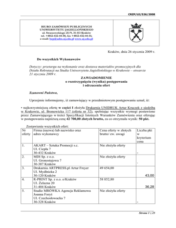 CRZP/UJ/526/2008 BIURO ZAMÓWIEŃ PUBLICZNYCH UNIWERSYTETU JAGIELLOŃSKIEGO ul. Straszewskiego 25/9, 31-113 Kraków tel. +4812-432-44-50, fax +4812-432-44-51; e-mail: [email protected] www.uj.edu.pl Kraków, dnia 26 stycznia 2009 r. Do wszystkich Wykonawców Dotyczy: przetargu na wykonanie oraz dostawa materiałów promocyjnych dla Działu Rekrutacji na Studia Uniwersytetu Jagiellońskiego w Krakowie – otwarcie 21 stycznia 2009 r. ZAWIADOMIENIE o rozstrzygnięciu (wyniku) postępowania i odrzuceniu ofert Szanowni Państwo, Uprzejmie informujemy, iż zamawiający w przedmiotowym postępowaniu uznał, iż: • najkorzystniejszą ofertę w części I złożyła Drukarnia UNIDRUK Artur Kruczek z siedzibą w Krakowie, ul. Bronowicka 117 (oferta nr 32), spełniając wszystkie wymogi postawione przez Zamawiającego w treści Specyfikacji Istotnych Warunków Zamówienia oraz oferując w postępowaniu najniższą cenę 42 700,00 złotych brutto, za co otrzymała wynik: 50 pkt. Zestawienie wszystkich ofert: Nr Firma (nazwa) lub nazwisko oraz oferty adres wykonawcy Cena oferty w złotych brutto/ ew. uwagi 1. Nie złożyła oferty 2. 3. 4. 5. AKART – Sztuka Promocji s.c. Ul. Ciepła 7 30-432 Kraków MDI Sp. z o.o. Ul. Gronostajowa 7 30-387 Kraków Drukarnia ARTPRESS.pl Artur Freyer Ul. Mydlnicka 2 30-120 Kraków R-PRINT Sp. z o.o. o/Kraków Ul. Żelazna 20 31-404 Kraków Studio MRÓWKA Agencja Reklamowa Joanna Foryś Ul. Czechosłowacka 7 30-328 Kraków Liczba pkt w kryterium cena Nie złożyła oferty ` 49 654,00 43,00 58 852,80 36,28 Nie złożyła oferty - __________________________________________________________________________________________ Strona 1 z 25 CRZP/UJ/526/2008 6. 7. 8. 9. 10. 11. 12. 13. 14. 15. 16. 17. 18. 19. Drukarnia LEYKO Sp. z o.o. Ul. Romanowicza 11 30-702 Kraków Drukarnia LEGRA Sp. z o.o. Ul. Rybitwy 15 30-716 Kraków Pracownia Reklamy AD Halina Zaleńska Ul. Kącik 9 30-549 Kraków AUH ELWIRA Ul. Szara 14 00-420 Warszawa CZWÓRKA Sp. z .o.o Ul. Gen M. Bołtucia 26 05-092 Łomianki Agencja Reklamowa AKWA Wojciech Wasiak Os. Krakowskie Przedmieście 6 32-085 Modlnica Agencja Reklamowa TWIST Krzysztof Jaszczewski Ul. Garbarska 16 20-340 Lublin ARPRO Sp. z o.o. Ul. Prosta 36 53-508 Wrocław PPH ZAPOL Dmochowski, Sobczyk Sp.j. Ul. Piastów 42 71-062 Szczecin AUTENTIC Jacek Ślebzak Skibniew Podawce Ul. Wiśniowa 4 08-300 Sokołów Podlaski Agencja Reklamowa DORMINGTON Piotr Ekwiński Ul. Energetyków ¾ 70-952 Szczecin BUTTERFLY Agnieszka Borowy Ul. Myśliwska 8/1 71-662 Szczecin 3 LINE PROMOTION Sp. z o.o. Ul. Wadowicka 6E 30-415 Kraków GALANTA s.c. Anna Nowińska i Tadeusz Nowiński Ul. Drożyna 9 30-209 Kraków 47 343,32 45,10 51 850,00 41,18 50 386,00 42,37 Nie złożyła oferty Nie złożył oferty Nie złożyła oferty 84 114,12 Oferta odrzucona, uwagi poniżej Nie złożyła oferty 46 970,00 45,45 Nie złożył oferty Nie złożyła oferty Nie złożył oferty Nie złożyło oferty Nie złożyła oferty - __________________________________________________________________________________________ Strona 2 z 25 CRZP/UJ/526/2008 20. 21. 22. 23. 24. 25. 26. 27. 28. 29. 30. 31. 32. 33. Agencja Promocyjna STYLLE s.c. Iwona Kosakowska, Agata Kasprzak Ul. M. Garsteckiego 10 60-682 Poznań Chroma Drukarnia Raczkowski Krzysztof Ul. Przemysłowa 5 68-200 Żary QUEBEC Group Sławomir Wrona Ul. Sandomierska 260 25-330 Kielce PHU MAGOT Jan Bożek Leśna 71 42-297 Poraj TAURUS Doradztwo i Reklama Adam Widoch Ul. Wincentego Pola 16 44-100 Gliwice MEDIA Sp. z o.o. Ul. Wł. Raginisa 73 15-161 Białystok A&P Anna Chabowska Ul. Poprzeczna 16 B/36 10-282 Olsztyn JOCKER Studio Sp.j. T. Maksym, J. Trompeter-Maksym Ul. Darasza 5 30-826 Kraków MASTERGRAF s.c. Ul. Malborska 12/38 03-286 Warszawa FHU Fischer – Poligrafia Ul. Zabrzańska 7e 41-907 Bytom Firma AB Agata Batko Ul. Sołtysowska 22A 31-589 Kraków Agencja Reklamowa CIEŚLIK- STUDIO L Sp.j. Ul. Makuszyńskiego 17 31-752 Kraków Drukarnia UNIDRUK Artur Kruczek Ul. Bronowicka 117 30-121 Kraków Agencja C4 Al. Jana Pawła II 61/217 01-031 Warszawa Nie złożyła oferty 50 532,40 42,25 67 344,00 31,70 Nie złożył oferty Nie złożył oferty Nie złożyła oferty Nie złożyła oferty 51 435,20 41,51 82 130,40 26,00 79 544,00 Oferta odrzucona, uwagi poniżej 50 386,00 42,37 60 146,00 35,50 42 700,00 50,00 53 094,40 40,21 __________________________________________________________________________________________ Strona 3 z 25 CRZP/UJ/526/2008 34. 35. 36. 37. 38. 39. 40. 41. 42. 43. 44, 45. MODART Marcin Komadowski Ul. Romera 15 20-487 Lublin BASE Promotion Service Sp. z o.o. Koszwały, ul. Spacerowa 29 83-020 Cedry Wielkie CZESZYK Sp. z o.o. Ul. Najdałówka 17 33-112 Tarnowiec TOP DIVISION s.c. Ul. Friedleina 4/219 30-009 Kraków Przedsiębiorstwo Wielobranżowe UNIMAR Ul. Jędrzejowska 81 29-100 Włoszczowa MELLOW Sp. z o.o. Ul. Zawiła 61 30-390 Kraków MAX – DRUK Tadeusz Mrowca Ul. Na Polach 5 31-344 Kraków BTL Service Marek Pełka Ul. Mogilska 17a/4 31-542 Kraków Firma Poligraficzno – Introligatorska UDZIAŁOWIEC Sp. z o.o. Ul. Narcyzowa 2 42-256 Olsztyn PASAŻ Sp. z o.o. Ul. Rydlówka 24 30-363 Kraków M7 Marketing Services Michał Zdzienicki Ul. Grochowska 306/310 03-840 Warszawa GIFT Serwis Piotr Milewski Ul. Bieszczadzka 31 71-042 Szczecin Nie złożył oferty Nie złożyła oferty 83 789,60 25,48 Nie złożył oferty Nie złożyło oferty 57 340,00 Oferta odrzucona, uwagi poniżej Nie złożył oferty 51 240,00 Oferta odrzucona, uwagi poniżej 78 397,20 27,23 50 752,00 Oferta odrzucona, uwagi poniżej Nie złożył oferty 47 323,80 45,11 __________________________________________________________________________________________ Strona 4 z 25 CRZP/UJ/526/2008 • najkorzystniejszą ofertę w części II złożyło PPH ZAPOL Dmochowski, Sobczyk, Sp.j. z siedzibą w Szczecinie, ul. Piastów 42 (oferta nr 14), spełniając wszystkie wymogi postawione przez Zamawiającego w treści Specyfikacji Istotnych Warunków Zamówien