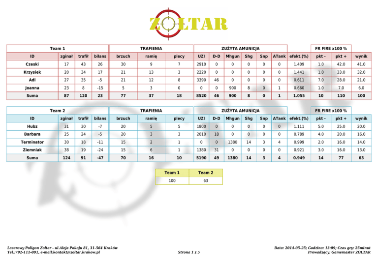 Team 1 TRAFIENIA ZUŻYTA AMUNICJA FR FIRE x100 % ID zginał trafił bilans brzuch ramię plecy UZI D-D Mhgun Shg Snp Czeski 17 43 26 30 9 7 2910 0 0 0 0 0 Krzysiek 20 34 17 21 13 3 2220 0 0 0 0 Adi 27 35 -5 21 12 8 3390 46 0 0 Joanna 23 8 -15 5 3 0 0 0 900 Suma 87 120 23 77 37 18 8520 46 900 Team 2 TRAFIENIA ATank efekt.(%) pkt - pkt + wynik 1.409 1.0 42.0 41.0 0 1.441 1.0 33.0 32.0 0 0 0.611 7.0 28.0 21.0 8 0 1 0.660 1.0 7.0 6.0 8 0 1 1.055 10 110 100 ZUŻYTA AMUNICJA FR FIRE x100 % ID zginał trafił bilans brzuch ramię plecy UZI D-D Mhgun Shg Snp Hubz 31 30 -7 20 5 5 1800 0 0 0 0 0 Barbara 25 24 -5 20 3 3 2010 18 0 0 0 Terminator 30 18 -11 15 2 1 0 0 1380 14 Ziemniak 38 19 -24 15 6 1 1380 31 0 Suma 124 91 -47 70 16 10 5190 49 1380 Laserowy Poligon Zoltar - ul.Aleja Pokoju 81, 31-564 Kraków Tel.:792-111-091, e-mail:[email protected] Team 1 Team 2 100 63 Strona 1 z 5 ATank efekt.(%) pkt - pkt + wynik 1.111 5.0 25.0 20.0 0 0.789 4.0 20.0 16.0 3 4 0.999 2.0 16.0 14.0 0 0 0 0.921 3.0 16.0 13.0 14 3 4 0.949 14 77 63 Data: 2014-05-25; Godzina: 13:09; Czas gry: 25minut Prowadzący: Gamemaster ZOLTAR Team 1 TRAFIENIA ZUŻYTA AMUNICJA FR FIRE x100 % ID zginał trafił bilans brzuch ramię plecy UZI D-D Mhgun Shg Snp Krzysiek 22 27 4 13 13 2 2610 0 0 0 0 0 Adi 26 27 -7 13 9 6 4680 13 0 0 0 Hubz 16 15 -1 10 1 4 1800 3 0 0 Terminator 29 16 -13 7 5 4 0 0 1320 Suma 93 85 -17 43 28 16 9090 16 1320 Team 2 TRAFIENIA ATank efekt.(%) pkt - pkt + wynik 0.958 1.0 26.0 25.0 0 0.362 5.0 22.0 17.0 0 0 0.721 1.0 14.0 13.0 4 0 4 0.904 2.0 14.0 12.0 4 0 4 0.642 9 76 67 ZUŻYTA AMUNICJA FR FIRE x100 % ID zginał trafił bilans brzuch ramię plecy UZI D-D Mhgun Shg Snp Ziemniak 38 30 -8 16 11 3 0 0 1260 15 16 4 Joanna 14 26 9 20 6 2 1980 0 0 0 0 Barbara 18 24 2 17 7 2 2850 0 0 0 Czeski 25 23 -14 15 4 5 3750 0 0 Suma 95 103 -11 68 28 12 8580 0 1260 Laserowy Poligon Zoltar - ul.Aleja Pokoju 81, 31-564 Kraków Tel.:792-111-091, e-mail:[email protected] Team 1 Team 2 67 65 Strona 2 z 5 ATank efekt.(%) pkt - pkt + wynik 1.853 3.0 27.0 24.0 0 0.909 4.0 22.0 18.0 0 0 0.561 4.0 20.0 16.0 0 0 0 0.187 8.0 15.0 7.0 15 16 4 0.658 19 84 65 Data: 2014-05-25; Godzina: 13:48; Czas gry: 25minut Prowadzący: Gamemaster ZOLTAR Drużyny Miejsce Laserowy Poligon Zoltar - ul.Aleja Pokoju 81, 31-564 Kraków Tel.:792-111-091, e-mail:[email protected] Nazwa Rozgrywki 1 2 Suma Team 1 100 67 167 Team 2 128 63 Strona 3 z 5 65 Data: 2014-05-25 Prowadzący: Gamemaster ZOLTAR Zestawienie wg wyniku Miejsce TRAFIENIA ZUŻYTA AMUNICJA ID zginał trafił bilans brzuch ramię plecy UZI D-D Mhgun Shg Snp aTank efekt.(%) pkt - pkt + wynik Krzysiek 50.40 73.20 18.00 40.80 31.20 6.00 5796.00 0.00 0.00 0.00 0.00 0.00 1.180 2.40 70.80 68.40 Czeski 50.40 79.20 7.20 54.00 15.60 14.40 7992.00 0.00 0.00 0.00 0.00 0.00 0.721 10.80 68.40 57.60 Adi 63.60 74.40 -18.00 40.80 25.20 16.80 9684.00 70.80 0.00 0.00 0.00 0.00 0.467 14.40 60.00 45.60 4 Ziemniak 91.20 58.80 -46.80 37.20 20.40 4.80 1656.00 37.20 1512.00 18.00 19.20 4.80 1.367 7.20 51.60 44.40 5 Hubz 56.40 54.00 -16.80 36.00 7.20 10.80 4320.00 3.60 0.00 0.00 0.00 0.00 0.916 7.20 46.80 39.60 6 Barbara 51.60 57.60 -13.20 44.40 12.00 6.00 5832.00 21.60 0.00 0.00 0.00 0.00 0.656 9.60 48.00 38.40 7 Terminator 70.80 40.80 -39.60 26.40 8.40 6.00 0.00 0.00 3240.00 21.60 3.60 9.60 0.953 4.80 36.00 31.20 8 Joanna 44.40 40.80 -15.60 30.00 10.80 2.40 2376.00 0.00 1080.00 9.60 0.00 1.20 0.831 6.00 34.80 28.80 Zestawienie wg bilansu Miejsce TRAFIENIA ZUŻYTA AMUNICJA ID zginał trafił bilans brzuch ramię plecy UZI D-D Mhgun Shg Snp aTank efekt.(%) pkt - pkt + wynik Krzysiek 50.40 73.20 18.00 40.80 31.20 6.00 5796.00 0.00 0.00 0.00 0.00 0.00 1.180 2.40 70.80 68.40 Czeski 50.40 79.20 7.20 54.00 15.60 14.40 7992.00 0.00 0.00 0.00 0.00 0.00 0.721 10.80 68.40 57.60 Barbara 51.60 57.60 -13.20 44.40 12.00 6.00 5832.00 21.60 0.00 0.00 0.00 0.00 0.656 9.60 48.00 38.40 4 Joanna 44.40 40.80 -15.60 30.00 10.80 2.40 2376.00 0.00 1080.00 9.60 0.00 1.20 0.831 6.00 34.80 28.80 5 Hubz 56.40 54.00 -16.80 36.00 7.20 10.80 4320.00 3.60 0.00 0.00 0.00 0.00 0.916 7.20 46.80 39.60 6 Adi 63.60 74.40 -18.00 40.80 25.20 16.80 9684.00 70.80 0.00 0.00 0.00 0.00 0.467 14.40 60.00 45.60 7 Terminator 70.80 40.80 -39.60 26.40 8.40 6.00 0.00 0.00 3240.00 21.60 3.60 9.60 0.953 4.80 36.00 31.20 8 Ziemniak 91.20 58.80 -46.80 37.20 20.40 4.80 1656.00 37.20 1512.00 18.00 19.20 4.80 1.367 7.20 51.60 44.40 Laserowy Poligon Zoltar - ul.Aleja Pokoju 81, 31-564 Kraków Tel.:792-111-091, e-mail:[email protected] Strona 4 z 5 Data: 2014-05-25 Prowadzący: Gamemaster ZOLTAR Zestawienie wg efektywności Miejsce TRAFIENIA ZUŻYTA AMUNICJA ID zginał trafił bilans brzuch ramię plecy UZI D-D Mhgun Shg Snp aTank efekt.(%) pkt - pkt + wynik Ziemniak 91.20 58.80 -46.80 37.20 20.40 4.80 1656.00 37.20 1512.00 18.00 19.20 4.80 1.367 7.20 51.60 44.40 Krzysiek 50.40 73.20 18.00 40.80 31.20 6.00 5796.00 0.00 0.00 0.00 0.00 0.00 1.180 2.40 70.80 68.40 Terminator 70.80 40.80 -39.60 26.40 8.40 6.00 0.00 0.00 3240.00 21.60 3.60 9.60 0.953 4.80 36.00 31.20 4 Hubz 56.40 54.00 -16.80 36.00 7.20 10.80 4320.00 3.60 0.00 0.00 0.00 0.00 0.916 7.20 46.80 39.60 5 Joanna 44.40 40.80 -15.60 30.00 10.80 2.40 2376.00 0.00 1080.00 9.60 0.00 1.20 0.831 6.00 34.80 28.80 6 Czeski 50.40 79.20 7.20 54.00 15.60 14.40 7992.00 0.00 0.00 0.00 0.00 0.00 0.721 10.80 68.40 57.60 7 Barbara 51.60 57.60 -13.20 44.40 12.00 6.00 5832.00 21.60 0.00 0.00 0.00 0.00 0.656 9.60 48.00 38.40 8 Adi 63.60 74.40 -18.00 40.80 25.20 16.80 9684.00 70.80 0.00 0.00 0.00 0.00 0.467 14.40 60.00 45.60 Laserowy Poligon Zoltar - ul.Aleja Pokoju 81, 31-564 Kraków Tel.:792-111-091, e-mail:[email protected] Strona 5 z 5 Data: 2014-05-25 Prowadzący: Gamemaster ZOLTAR