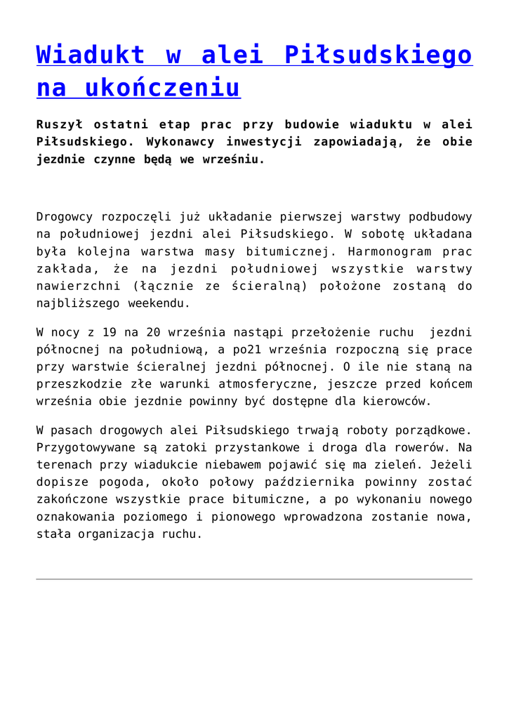 Wiadukt w alei Piłsudskiego na ukończeniu Ruszył ostatni etap prac przy budowie wiaduktu w alei Piłsudskiego. Wykonawcy inwestycji zapowiadają, że obie jezdnie czynne będą we wrześniu. Drogowcy rozpoczęli już układanie pierwszej warstwy podbudowy na południowej jezdni alei Piłsudskiego. W sobotę układana była kolejna warstwa masy bitumicznej. Harmonogram prac zakłada, że na jezdni południowej wszystkie warstwy nawierzchni (łącznie ze ścieralną) położone zostaną do najbliższego weekendu. W nocy z 19 na 20 września nastąpi przełożenie ruchu jezdni północnej na południową, a po21 września rozpoczną się prace przy warstwie ścieralnej jezdni północnej. O ile nie staną na przeszkodzie złe warunki atmosferyczne, jeszcze przed końcem września obie jezdnie powinny być dostępne dla kierowców. W pasach drogowych alei Piłsudskiego trwają roboty porządkowe. Przygotowywane są zatoki przystankowe i droga dla rowerów. Na terenach przy wiadukcie niebawem pojawić się ma zieleń. Jeżeli dopisze pogoda, około połowy października powinny zostać zakończone wszystkie prace bitumiczne, a po wykonaniu nowego oznakowania poziomego i pionowego wprowadzona zostanie nowa, stała organizacja ruchu. Istnieje życie bez Burkhardta Trzeci mecz, w którym Wisła musiała grać bez swojego niedawnego jeszcze lidera. I pierwsza wygrana. Trzy punkty za ogranie Sandecji są bardziej istotne od stylu, w jakim zostały wywalczone. Jeszcze całkiem niedawno temu wydawało się, że ekipa prowadzona przez trenera Marcina Kaczmarka jest na dobrej drodze do T-Mobile Ekstraklasy. A jednym z zawodników, którzy mieli zapewnić płocczanom awans, był Filip Burkhardt. Niestety, niespodziewanie dla wszystkich (poza nim samym) Bury przeprowadził się do Górnika Łęczna. Z jego słów wynikało jasno, że marzy o grze w najwyższej klasie rozgrywkowej, więc skoro nadarzyła się okazja, chciałby z niej czym prędzej skorzystać. Przegrany u siebie pojedynek z GKS-em Katowice oraz wyjazdowy remis z Dolcanem Ząbki mogły zasiać w płockich kibicach poważny niepokój. Wprawdzie tuż po odejściu „Burego” do Łęcznej sztab szkoleniowy Wisły zapewniał, że dotychczasowego lidera da się jakoś zastąpić, jednak ani gra, ani wyniki wcale na to nie wskazywały. Po trzecim meczu w dalszym ciągu można mieć wiele zastrzeżeń do gry. Na szczęście jednak tym razem płocczanie schodzili z boiska bogatsi o trzy punkty. Coraz lepiej czuje się w Płocku Dymitar Iliev. Bułgarski napastnik, który „wygryzł” z podstawowego składu Marcina Krzywickiego, był niezwykle aktywny w polu karnym Sandecji. Świetnie się zastawiał, grając tyłem do bramki. A co najważniejsze, zdobył bramkę, dającą Wiśle prowadzenie. Gdyby miał nieco lepiej ustawiony celownik, powinien trafić raz jeszcze, ale po jego efektownej główce piłka przeleciała obok bramki. Fabian Hiszpański, który w pierwszej połowie asystował przy bramce na 1:0, po przerwie sam wpisał się na listę strzelców. Zdobył gola, po którym ręce same składały się do oklasków. Wydawało się, że Wisła ułożyła sobie mecz i ma wszystko pod kontrolą. Tymczasem po golu kontaktowym Sandecja ostro ruszyła do przodu, licząc na wywalczenie co najmniej jednego punktu. Kilka razy była tego całkiem blisko. O ile na słowa najwyższego uznania zapracował Mitko Iliev, to Marcin Krzywicki powinien konfrontację z „Góralami” jak najszybciej wymazać z pamięci. Rosły napastnik, który w sezonie 2013/2014 był najlepszym strzelcem Wisły, teraz jest zaledwie cieniem samego siebie. Jeśli nie weźmie się do pracy i nie wróci do formy sprzed wakacji, jego przyszłość w Płocku może rysować się nie do końca różowo. A jak rysuje się przyszłość drużyny prowadzonej przez trenera Marcina Kaczmarka, powinny pokazać już najbliższe mecze. I na razie bardziej niż efektownej gry będziemy w nich oczekiwać kolejnych zdobyczy punktowych. Wisła Płock – Sandecja Nowy Sącz 2:1 (1:0) Bramki: Iliev (21.), Hiszpański (75.) dla Wisły oraz Rudolf (87.) dla Sandecji Wisła: Kiełpin – Stefańczyk, Magdoń, Radić, Hiszpański – Kostrzewa (90. Sielewski), Góralski, Janus, Wlazło, Kacprzycki (62. Stępińśki) – Iliev (73.) Sandecja: Kozioł – Szufryn, Bartków, Cicman, Słaby – Frańczak, Nather, Kuźma, Szczepański, Bębenek – Fałowski (85. Traore) Żółte kartki: Radić, Kacprzycki (Wisła) oraz Frańczak, Bębenek (Sandecja) Wszystko pod kontrolą Porażka różnicą dziewiętnastu bramek była dla wrocławskiego Śląska najniższym wymiarem kary w konfrontacji z Wisłą. Drużyna z Płocka nie zamierzała oszczędzać beniaminka, pokazując mu gdzie jest jego miejsce w szeregu. Klub ze stolicy Dolnego Śląska jest jednym z najbardziej zasłużonych dla piłki ręcznej w naszym kraju. Ale ligowych punktów nie przyznaje się za dawne zasługi, ale za to, co prezentuje się na boisku. A wrocławianie nie byli w stanie przeciwstawić nafciarzom praktycznie żadnych atutów. W uzyskaniu korzystnego rezultatu nie pomogli miejscowym Łukasz Białaszek, Arkadiusz Miszka i Zoran Radojević czyli trzej zawodnicy związani niegdyś z Wisłą Płock. Swego rodzaju paradoksem może być fakt, że jednym z najlepszych zawodników Śląska był Marcin Schodowski. Jeśli w ekipie, która straciła 40 goli wyróżnia się bramkarza, nie świadczy to dobrze o pozostałych zawodnikach. Zupełnie inną kwestią jest problem z wyróżnieniem któregoś z nafciarzy. W ich przypadku jednak wiąże się to z faktem, że Wisła niemal nie miała słabych punktów. Jedynym graczem, który zaprezentował się poniżej swoich możliwości był Adam Wiśniewski, który we Wrocławiu wyraźnie nie miał swojego dnia. Nie wszystko jednak było lekko, łatwo i przyjemnie. O wielkim pechu może mówić Marcin Wichary, który pojawił się w płockiej bramce w drugiej połowie, zastępując świetnie s