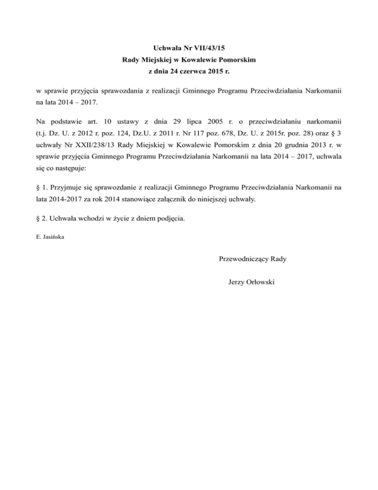 Uchwała Nr VII/43/15 Rady Miejskiej w Kowalewie Pomorskim z dnia 24 czerwca 2015 r. w sprawie przyjęcia sprawozdania z realizacji Gminnego Programu Przeciwdziałania Narkomanii na lata 2014 – 2017. Na podstawie art. 10 ustawy z dnia 29 lipca 2005 r. o przeciwdziałaniu narkomanii (t.j. Dz. U. z 2012 r. poz. 124, Dz.U. z 2011 r. Nr 117 poz. 678, Dz. U. z 2015r. poz. 28) oraz § 3 uchwały Nr XXII/238/13 Rady Miejskiej w Kowalewie Pomorskim z dnia 20 grudnia 2013 r. w sprawie przyjęcia Gminnego Programu Przeciwdziałania Narkomanii na lata 2014 – 2017, uchwala się co następuje: § 1. Przyjmuje się sprawozdanie z realizacji Gminnego Programu Przeciwdziałania Narkomanii na lata 2014-2017 za rok 2014 stanowiące załącznik do niniejszej uchwały. § 2. Uchwała wchodzi w życie z dniem podjęcia. E. Jasińska Przewodniczący Rady Jerzy Orłowski Uzasadnienie Uchwała Nr VII/43/15 Rady Miejskiej w Kowalewie Pomorskim z dnia 24 czerwca 2015 r. Podstawą prawną działań związanych z profilaktyką i rozwiązywaniem problemów związanych z narkomanią jest ustawa z dnia 29 lipca 2005 r. o przeciwdziałaniu narkomanii (t.j. Dz. U. z 2012 r. poz. 124, Dz.U. z 2011 r. Nr 117 poz. 678, Dz. U. z 2015r. poz. 28), która nakłada na gminę obowiązek podejmowania działań zmierzających do przeciwdziałania narkomanii, obejmujących: zwiększenie dostępności pomocy terapeutycznej i rehabilitacyjnej dla osób uzależnionych i osób zagrożonych uzależnieniem; udzielanie rodzinom, w których występują problemy narkomanii, pomocy psychospołecznej i prawnej; prowadzenie profilaktycznej działalności informacyjnej, edukacyjnej oraz szkoleniowej w zakresie rozwiązywania problemów narkomanii w szczególności dla dzieci i młodzieży, w tym prowadzenie zajęć sportowo – rekreacyjnych dla uczniów a także działań na rzecz dożywiania dzieci uczestniczących w pozalekcyjnych programach opiekuńczo – wychowawczych i socjoterapeutycznych; wspomaganie działań instytucji, organizacji pozarządowych i osób fizycznych, służących rozwiązywaniu problemów narkomanii; pomoc społeczną osobom uzależnionym i rodzinom osób uzależnionych dotkniętym ubóstwem i wykluczeniem społecznym i integrowanie ze środowiskiem lokalnym tych osób z wykorzystaniem pracy socjalnej i kontaktu socjalnego. W celu realizacji w/w zadań uchwałą Nr XXII/238/13 Rady Miejskiej w Kowalewie Pomorskim z dnia 20 grudnia 2013 r. przyjęto Gminny Program Przeciwdziałania Narkomanii na lata 2014 – 2017. Zgodnie z § 3 tej uchwały sprawozdanie roczne zostało sporządzone do końca I półrocza 2015 r. E. Jasińska Przewodniczący Rady Jerzy Orłowski Załącznik do Uchwały Nr VII/43/15 Rady Miejskiej w Kowalewie Pomorskim z dnia 24 czerwca 2015 r. Sprawozdanie z Gminnego Programu Przeciwdziałania Narkomanii za rok 2014 1. Zwiększenie pomocy terapeutycznej i rehabilitacyjnej dla uzależnionych i osób zagrożonych uzależnieniem, wspomaganie działań instytucji, organizacji pozarządowych oraz osób fizycznych, służących rozwiązywaniu problemów narkomanii Pedagodzy szkolni, nauczyciele oraz Miejsko-Gminny Ośrodek Pomocy Społecznej ściśle współpracowali z instytucjami zajmującymi się osobami uzależnionymi i ich rodzinami tj. : 1. Centrum Pomocy Rodzinie w Golubiu-Dobrzyniu, 2. Towarzystwo Rodzin i Przyjaciół Dzieci Uzależnionych „Powrót z U” w Toruniu, 3. Sąd Rejonowy w Golubiu-Dobrzyniu – III Wydział Rodzinny i Nieletnich, 4. Policja. W ramach zadania: 1.Pedagodzy szkolni placówek oświatowych na terenie gminy rekomendowali (podczas spotkań z rodzicami) placówki które zajmują się problematyką społeczną i profilaktyką uzależnień. 2. Sporządzano listy instytucji udzielających pomocy dzieciom i młodzieży i wywieszano je w miejscu dostępnym dla dzieci i rodziców. 3. Członkowie Zespołu Interdyscyplinarnego oraz Gminnej Komisji Rozwiązywania Problemów Alkoholowych na bieżąco informowali o pojawiających się możliwościach realizacji programów profilaktycznych. 4. Współfinansowano telefon zaufania „Niebieska Linia”. W roku 2014 swoją działalność kontynuował Punkt Informacyjno - Konsultacyjny dla osób z problemem alkoholowym i ich rodzin w Kowalewie Pomorskim. Od miesiąca października Punkt jest obsługiwany przez nowego instruktora terapii uzależnień. Wychodząc naprzeciw oczekiwaniom osób korzystających z punktu zmieniono godziny jego otwarcia – w każdy poniedziałek miesiąca ( naprzemiennie w godz. od 15.00-19.00 i od 10.00-14.00). Terapeuta pracujący w punkcie udziela również porad i rozpoznaje problemy w zakresie wszystkich uzależnień. 2. Prowadzenie profilaktycznej działalności informacyjnej, edukacyjnej oraz szkoleniowej w zakresie rozwiązywania problemów narkomanii w szczególności adresowanych do dzieci i młodzieży, w tym prowadzenie zajęć sportowo-rekreacyjnych dla uczniów, a także działań na rzecz dożywiania dzieci uczestniczących w pozalekcyjnych programach opiekuńczowychowawczych i socjoterapeutycznych: a) Finansowanie lub dofinansowanie zorganizowanych zajęć pozaszkolnych m.in.: w świetlicach środowiskowych, klubach młodzieżowych, placówkach oświatowych, a także dożywianie dzieci biorących udział w w/w zajęciach; dofinansowanie wypoczynku letniego dla dzieci i młodzieży narażonych na podejmowanie ryzykownych zachowań. W roku 2014 swoją działalność kontynuowała Świetlica Socjoterapeutyczna w Kowalewie Pomorskim, która jest placówką wsparcia dziennego. Jej celem jest zapewnienie dzieciom z rodzin dysfunkcyjnych, zagrożonych marginalizacją i wykluczeniem społecznym, odpowiednich warunków do nauki, rozwoju i zabawy oraz łagodzenie wszelkich niedostatków wychowawczych w rodzinie. Pracownicy Świetlicy Socjoterapeutycznej w ramach zadania prowadzili pracę bezpośrednio z dziećmi i młodzieżą – 62 wychowanków, jak również z ich rodzicami. Prowadzone w roku 2014 zada