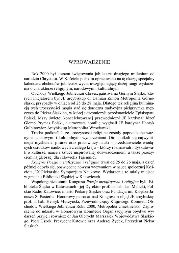 WPROWADZENIE Rok 2000 by czasem wi towania jubileuszu drugiego millenium od narodzin Chrystusa. W Ko ciele polskim opracowano na t okazj specjalny kalendarz obchodów jubileuszowych, uwzgl dniaj,cy du-ej rangi wydarzenia o charakterze religijnym, narodowym i kulturalnym. Obchody Wielkiego Jubileuszu Chrze cija0stwa na Górnym 2l,sku, których inicjatorem by JE arcybiskup dr Damian Zimo0 Metropolita Górnol,ski, przypad y w dniach od 25 do 28 maja. Dlatego te- religijn, kulminacj, tych uroczysto ci mog a sta6 si doroczna tradycyjna pielgrzymka m -czyzn do Piekar 2l,skich, w której uczestniczyli przedstawiciele Episkopatu Polski. Mszy wi tej koncelebrowanej przewodniczy JE kardyna Józef Glemp Prymas Polski, a uroczyst, homili wyg osi JE kardyna Henryk Gulbinowicz Arcybiskup Metropolita Wroc awski. Trzeba podkre li6, -e uroczysto ci religijne zosta y poprzedzone wa-nymi naukowymi i kulturalnymi wydarzeniami. Oto spotkali si najwybitniejsi my liciele, pisarze oraz pracownicy nauki – przedstawiciele wiod,cych o rodków naukowych z ca ego kraju – którzy rozmawiali i dyskutowali o kulturze, nauce i sztuce inspirowanej do wiadczeniem, a tak-e prze-yciem najg bszej dla cz owieka Tajemnicy. Kongres Poezja metafizyczna i religijna trwa od 25 do 26 maja, a dzie0 pó<niej odby o si , po wi cone nowym wyzwaniom w nauce spo ecznej Ko cio a, IX Piekarskie Sympozjum Naukowe. Wydarzenia te mia y miejsce w gmachu Biblioteki 2l,skiej w Katowicach. Wspó organizatorami Kongresu Poezja metafizyczna i religijna byli: Biblioteka 2l,ska w Katowicach i jej Dyrektor prof. dr hab. Jan Malicki, Polskie Radio Katowice, miasto Piekary 2l,skie oraz Fundacja im. Ksi dza Janusza S. Pasierba. Honorowy patronat nad Kongresem obj, JE arcybiskup prof. dr hab. Henryk Muszy0ski, Przewodnicz,cy Krajowego Komitetu Obchodów Wielkiego Jubileuszu Roku 2000, Metropolita Gnie<nie0ski. Zaproszenie do udzia u w Honorowym Komitecie Organizacyjnym obydwu wydarze0 przyj li równie-: dr Jan Olbrycht Marsza ek Województwa 2l,skiego, Piotr Uszok, Prezydent Katowic oraz Andrzej Cydek, Prezydent Piekar 2l,skich. 2 Wprowadzenie Prezentowana publikacja Kultura i religia u progu III Tysi clecia wydana jest w tradycyjnej serii wydawniczej Piekarskich Sympozjów Naukowych. Ma rang dokumentu obchodów Wielkiego Jubileuszu 2000 lat Chrzecija0stwa na Górnym 2l,sku. Ukazuje jeszcze wci,- niedoceniany obraz 2l,ska jako pr -nego obszaru nauki, kultury i sztuki, a tak-e g bokiej religijno ci, które splataj, si z trudnymi problemami restrukturyzowanego regionu przemys owego. Aleksandra Pethe Wojciech wi tkiewicz Katowice, dnia 3 maja 2001 roku