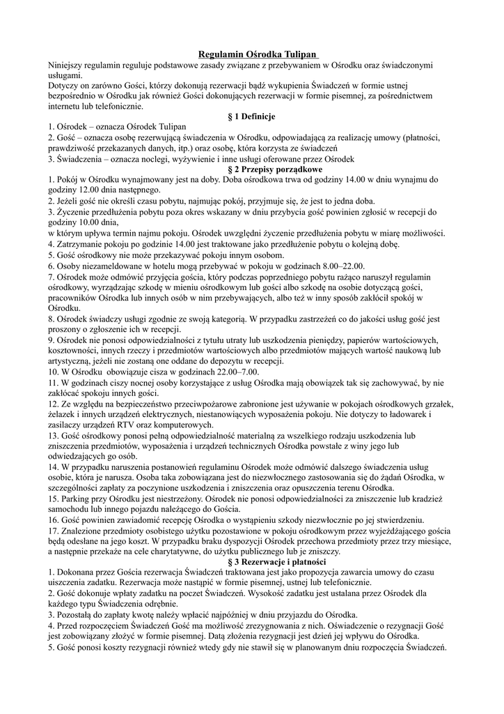 Regulamin Ośrodka Tulipan Niniejszy regulamin reguluje podstawowe zasady związane z przebywaniem w Ośrodku oraz świadczonymi usługami. Dotyczy on zarówno Gości, którzy dokonują rezerwacji bądź wykupienia Świadczeń w formie ustnej bezpośrednio w Ośrodku jak również Gości dokonujących rezerwacji w formie pisemnej, za pośrednictwem internetu lub telefonicznie. § 1 Definicje 1. Ośrodek – oznacza Ośrodek Tulipan 2. Gość – oznacza osobę rezerwującą świadczenia w Ośrodku, odpowiadającą za realizację umowy (płatności, prawdziwość przekazanych danych, itp.) oraz osobę, która korzysta ze świadczeń 3. Świadczenia – oznacza noclegi, wyżywienie i inne usługi oferowane przez Ośrodek § 2 Przepisy porządkowe 1. Pokój w Ośrodku wynajmowany jest na doby. Doba ośrodkowa trwa od godziny 14.00 w dniu wynajmu do godziny 12.00 dnia następnego. 2. Jeżeli gość nie określi czasu pobytu, najmując pokój, przyjmuje się, że jest to jedna doba. 3. Życzenie przedłużenia pobytu poza okres wskazany w dniu przybycia gość powinien zgłosić w recepcji do godziny 10.00 dnia, w którym upływa termin najmu pokoju. Ośrodek uwzględni życzenie przedłużenia pobytu w miarę możliwości. 4. Zatrzymanie pokoju po godzinie 14.00 jest traktowane jako przedłużenie pobytu o kolejną dobę. 5. Gość ośrodkowy nie może przekazywać pokoju innym osobom. 6. Osoby niezameldowane w hotelu mogą przebywać w pokoju w godzinach 8.00–22.00. 7. Ośrodek może odmówić przyjęcia gościa, który podczas poprzedniego pobytu rażąco naruszył regulamin ośrodkowy, wyrządzając szkodę w mieniu ośrodkowym lub gości albo szkodę na osobie dotyczącą gości, pracowników Ośrodka lub innych osób w nim przebywających, albo też w inny sposób zakłócił spokój w Ośrodku. 8. Ośrodek świadczy usługi zgodnie ze swoją kategorią. W przypadku zastrzeżeń co do jakości usług gość jest proszony o zgłoszenie ich w recepcji. 9. Ośrodek nie ponosi odpowiedzialności z tytułu utraty lub uszkodzenia pieniędzy, papierów wartościowych, kosztowności, innych rzeczy i przedmiotów wartościowych albo przedmiotów mających wartość naukową lub artystyczną, jeżeli nie zostaną one oddane do depozytu w recepcji. 10. W Ośrodku obowiązuje cisza w godzinach 22.00–7.00. 11. W godzinach ciszy nocnej osoby korzystające z usług Ośrodka mają obowiązek tak się zachowywać, by nie zakłócać spokoju innych gości. 12. Ze względu na bezpieczeństwo przeciwpożarowe zabronione jest używanie w pokojach ośrodkowych grzałek, żelazek i innych urządzeń elektrycznych, niestanowiących wyposażenia pokoju. Nie dotyczy to ładowarek i zasilaczy urządzeń RTV oraz komputerowych. 13. Gość ośrodkowy ponosi pełną odpowiedzialność materialną za wszelkiego rodzaju uszkodzenia lub zniszczenia przedmiotów, wyposażenia i urządzeń technicznych Ośrodka powstałe z winy jego lub odwiedzających go osób. 14. W przypadku naruszenia postanowień regulaminu Ośrodek może odmówić dalszego świadczenia usług osobie, która je narusza. Osoba taka zobowiązana jest do niezwłocznego zastosowania się do żądań Ośrodka, w szczególności zapłaty za poczynione uszkodzenia i zniszczenia oraz opuszczenia terenu Ośrodka. 15. Parking przy Ośrodku jest niestrzeżony. Ośrodek nie ponosi odpowiedzialności za zniszczenie lub kradzież samochodu lub innego pojazdu należącego do Gościa. 16. Gość powinien zawiadomić recepcję Ośrodka o wystąpieniu szkody niezwłocznie po jej stwierdzeniu. 17. Znalezione przedmioty osobistego użytku pozostawione w pokoju ośrodkowym przez wyjeżdżającego gościa będą odesłane na jego koszt. W przypadku braku dyspozycji Ośrodek przechowa przedmioty przez trzy miesiące, a następnie przekaże na cele charytatywne, do użytku publicznego lub je zniszczy. § 3 Rezerwacje i płatności 1. Dokonana przez Gościa rezerwacja Świadczeń traktowana jest jako propozycja zawarcia umowy do czasu uiszczenia zadatku. Rezerwacja może nastąpić w formie pisemnej, ustnej lub telefonicznie. 2. Gość dokonuje wpłaty zadatku na poczet Świadczeń. Wysokość zadatku jest ustalana przez Ośrodek dla każdego typu Świadczenia odrębnie. 3. Pozostałą do zapłaty kwotę należy wpłacić najpóźniej w dniu przyjazdu do Ośrodka. 4. Przed rozpoczęciem Świadczeń Gość ma możliwość zrezygnowania z nich. Oświadczenie o rezygnacji Gość jest zobowiązany złożyć w formie pisemnej. Datą złożenia rezygnacji jest dzień jej wpływu do Ośrodka. 5. Gość ponosi koszty rezygnacji również wtedy gdy nie stawił się w planowanym dniu rozpoczęcia Świadczeń. 6. W przypadku rezygnacji Ośrodek zastrzega sobie prawo żądania zapłaty niżej przedstawionych kwot będących poniesionymi kosztami i utraconymi przychodami w związku z dokonanymi już przygotowaniami. Przy obliczaniu należnych do zapłaty kwot uwzględnia się koszty jakie zostały zaoszczędzone, a także możliwość innego wykorzystania świadczeń. 7. Koszty rezygnacji wynoszą standardowo: do 31 dni przed rozpoczęciem Świadczeń 40 % ustalonej ceny od 30 do 16 dnia 60 % ustalonej ceny od 15 do 3 dnia 85 % ustalonej ceny od 2 do dnia planowanego dnia rozpoczęcia 95 % ustalonej ceny 8. W wypadkach wyjątkowych Ośrodek może zgodzić się na inne zasady, w tym w szczególności zaproponować Świadczenia w innym terminie uzgodnionym z Gościem.