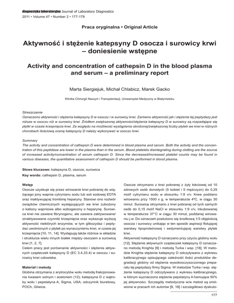 Aktywność i stężenie katepsyny D osocza i surowicy krwi