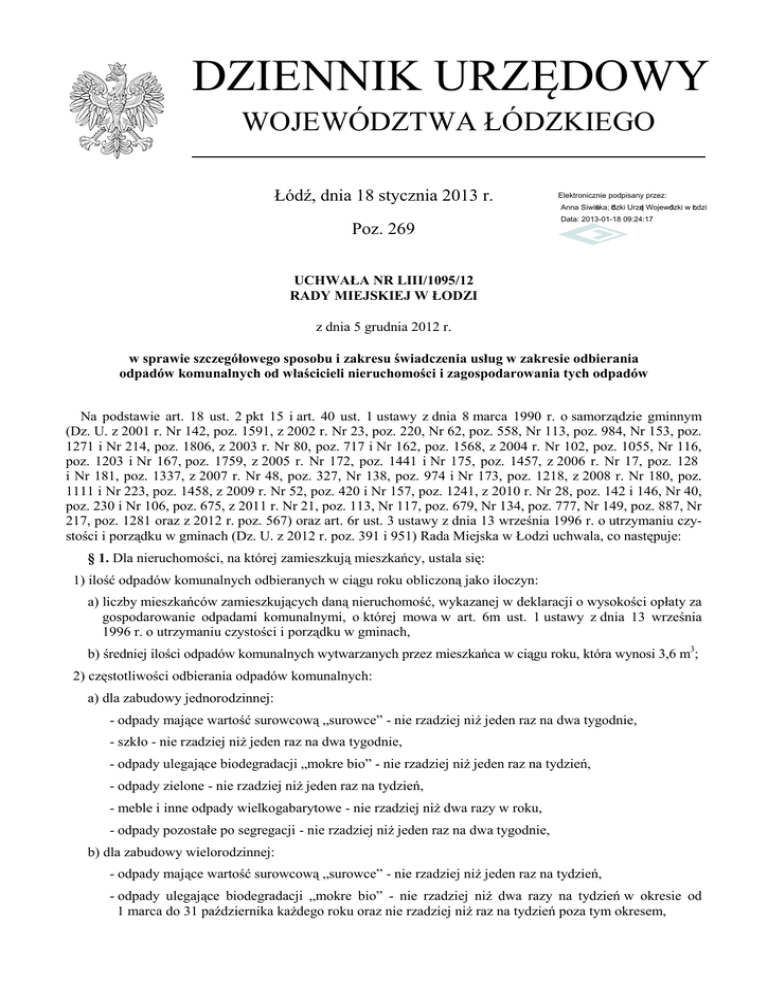 DZIENNIK URZĘDOWY WOJEWÓDZTWA ŁÓDZKIEGO Łódź, dnia 18 stycznia 2013 r. Elektronicznie podpisany przez: Anna Siwińska; Łódzki Urząd Wojewódzki w Łodzi Poz. 269 Data: 2013-01-18 09:24:17 UCHWAŁA NR LIII/1095/12 RADY MIEJSKIEJ W ŁODZI z dnia 5 grudnia 2012 r. w sprawie szczegółowego sposobu i zakresu świadczenia usług w zakresie odbierania odpadów komunalnych od właścicieli nieruchomości i zagospodarowania tych odpadów Na podstawie art. 18 ust. 2 pkt 15 i art. 40 ust. 1 ustawy z dnia 8 marca 1990 r. o samorządzie gminnym (Dz. U. z 2001 r. Nr 142, poz. 1591, z 2002 r. Nr 23, poz. 220, Nr 62, poz. 558, Nr 113, poz. 984, Nr 153, poz. 1271 i Nr 214, poz. 1806, z 2003 r. Nr 80, poz. 717 i Nr 162, poz. 1568, z 2004 r. Nr 102, poz. 1055, Nr 116, poz. 1203 i Nr 167, poz. 1759, z 2005 r. Nr 172, poz. 1441 i Nr 175, poz. 1457, z 2006 r. Nr 17, poz. 128 i Nr 181, poz. 1337, z 2007 r. Nr 48, poz. 327, Nr 138, poz. 974 i Nr 173, poz. 1218, z 2008 r. Nr 180, poz. 1111 i Nr 223, poz. 1458, z 2009 r. Nr 52, poz. 420 i Nr 157, poz. 1241, z 2010 r. Nr 28, poz. 142 i 146, Nr 40, poz. 230 i Nr 106, poz. 675, z 2011 r. Nr 21, poz. 113, Nr 117, poz. 679, Nr 134, poz. 777, Nr 149, poz. 887, Nr 217, poz. 1281 oraz z 2012 r. poz. 567) oraz art. 6r ust. 3 ustawy z dnia 13 września 1996 r. o utrzymaniu czystości i porządku w gminach (Dz. U. z 2012 r. poz. 391 i 951) Rada Miejska w Łodzi uchwala, co następuje: § 1. Dla nieruchomości, na której zamieszkują mieszkańcy, ustala się: 1) ilość odpadów komunalnych odbieranych w ciągu roku obliczoną jako iloczyn: a) liczby mieszkańców zamieszkujących daną nieruchomość, wykazanej w deklaracji o wysokości opłaty za gospodarowanie odpadami komunalnymi, o której mowa w art. 6m ust. 1 ustawy z dnia 13 września 1996 r. o utrzymaniu czystości i porządku w gminach, b) średniej ilości odpadów komunalnych wytwarzanych przez mieszkańca w ciągu roku, która wynosi 3,6 m3; 2) częstotliwości odbierania odpadów komunalnych: a) dla zabudowy jednorodzinnej: - odpady mające wartość surowcową „surowce” - nie rzadziej niż jeden raz na dwa tygodnie, - szkło - nie rzadziej niż jeden raz na dwa tygodnie, - odpady ulegające biodegradacji „mokre bio” - nie rzadziej niż jeden raz na tydzień, - odpady zielone - nie rzadziej niż jeden raz na tydzień, - meble i inne odpady wielkogabarytowe - nie rzadziej niż dwa razy w roku, - odpady pozostałe po segregacji - nie rzadziej niż jeden raz na dwa tygodnie, b) dla zabudowy wielorodzinnej: - odpady mające wartość surowcową „surowce” - nie rzadziej niż jeden raz na tydzień, - odpady ulegające biodegradacji „mokre bio” - nie rzadziej niż dwa razy na tydzień w okresie od 1 marca do 31 października każdego roku oraz nie rzadziej niż raz na tydzień poza tym okresem, Dziennik Urzędowy Województwa Łódzkiego –2– Poz. 269 - meble i inne odpady wielkogabarytowe - nie rzadziej niż jeden raz na miesiąc, - odpady pozostałe po segregacji - nie rzadziej niż dwa razy na tydzień w okresie od 1 marca do 31 października każdego roku oraz nie rzadziej niż raz na tydzień poza tym okresem. § 2. Dla nieruchomości, na której nie zamieszkują mieszkańcy, a powstają odpady komunalne, ustala się: 1) średnie ilości odpadów komunalnych odbieranych w ciągu jednego tygodnia od właściciela nieruchomości: a) 4,5 litra od osoby przebywającej na terenie szkoły każdego typu, przedszkola lub żłobka, b) 7,5 litra od osoby zatrudnionej (na podstawie jakiegokolwiek stosunku prawnego, w tym na przykład umowy cywilnoprawnej) poza handlem i usługami, c) 15 litrów od osoby zatrudnionej (na podstawie jakiegokolwiek stosunku prawnego, w tym na przykład umowy cywilnoprawnej) w handlu i usługach, d) 30 litrów od osoby przebywającej w szpitalach, sanatoriach, internatach, koszarach, zakładach karnych, itp. obiektach użyteczności publicznej, e) 3 litry w okresie od 1 marca do 31 października każdego roku oraz 0,75 litra poza tym okresem na każdą działkę w rodzinnych ogrodach działkowych; 2) częstotliwości odbierania odpadów komunalnych: a) mających wartość surowcową „surowce” - nie rzadziej niż 1 raz na 2 tygodnie, b) pozostałych po segregacji - nie rzadziej niż 1 raz na tydzień. § 3. 1. W Punktach Selektywnego Zbierania Odpadów Komunalnych lub innych punktach, których adresy znajdują się na stronie internetowej Urzędu Miasta Łodzi www.czystemiasto.uml.lodz.pl przyjmowane będą nieodpłatnie od właścicieli nieruchomości selektywnie zebrane odpady komunalne: przeterminowane leki i chemikalia, zużyte baterie i akumulatory, zużyty sprzęt elektryczny i elektroniczny, meble i inne odpady wielkogabarytowe, odpady budowlane i rozbiórkowe, zużyte opony, odpady zielone, a także papier, metale, tworzywa sztuczne, szkło i opakowania wielomateriałowe oraz odpady komunalne ulegające biodegradacji, w tym odpady opakowaniowe ulegające biodegradacji. 2. Czas otwarcia punktów, o których mowa w ust. 1, podany jest na stronie internetowej Urzędu Miasta Łodzi www.czystemiasto.uml.lodz.pl. § 4. Wykonanie uchwały powierza się Prezydentowi Miasta Łodzi. § 5. Uchwała wchodzi w życie po upływie 14 dni od dnia jej ogłoszenia w Dzienniku Urzędowym Województwa Łódzkiego. Przewodniczący Rady Miejskiej w Łodzi: Tomasz Kacprzak