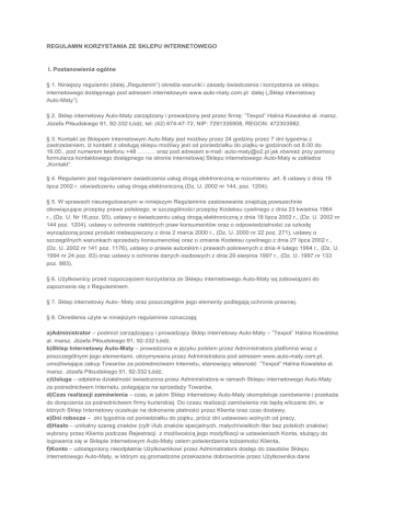 REGULAMIN KORZYSTANIA ZE SKLEPU INTERNETOWEGO I. Postanowienia ogólne § 1. Niniejszy regulamin (dalej „Regulamin”) określa warunki i zasady świadczenia i korzystania ze sklepu internetowego dostępnego pod adresem internetowym www.automaty.com.pl dalej („Sklep internetowy AutoMaty”). § 2. Sklep internetowy AutoMaty zarządzany i prowadzony jest przez firmę: ”Texpol” Halina Kowalska al. marsz. Józefa Piłsudskiego 91, 92332 Łódź, tel: (42) 6744772, NIP: 7291335908, REGON: 472303982. § 3. Kontakt ze Sklepem internetowym AutoMaty jest możliwy przez 24 godziny przez 7 dni tygodnia z zastrzeżeniem, iż kontakt z obsługą sklepu możliwy jest od poniedziałku do piątku w godzinach od 8.00 do 16.00., pod numerem telefonu +48 ……… oraz pod adresem email: auto[email protected] jak również przy pomocy formularza kontaktowego dostępnego na stronie internetowej Sklepu internetowego AutoMaty w zakładce „Kontakt”. § 4. Regulamin jest regulaminem świadczenia usług drogą elektroniczną w rozumieniu art. 8 ustawy z dnia 18 lipca 2002 r. oświadczeniu usług drogą elektroniczną (Dz. U. 2002 nr 144, poz. 1204). § 5. W sprawach nieuregulowanym w niniejszym Regulaminie zastosowanie znajdują powszechnie obowiązujące przepisy prawa polskiego, w szczególności przepisy Kodeksu cywilnego z dnia 23 kwietnia 1964 r., (Dz. U. Nr 16.poz. 93), ustawy o świadczeniu usług drogą elektroniczną z dnia 18 lipca 2002 r., (Dz. U. 2002 nr 144 poz. 1204), ustawy o ochronie niektórych praw konsumentów oraz o odpowiedzialności za szkodę wyrządzoną przez produkt niebezpieczny z dnia 2 marca 2000 r., (Dz. U. 2000 nr 22 poz. 271), ustawy o szczególnych warunkach sprzedaży konsumenckiej oraz o zmianie Kodeksu cywilnego z dnia 27 lipca 2002 r., (Dz. U. 2002 nr 141 poz. 1176), ustawy o prawie autorskim i prawach pokrewnych z dnia 4 lutego 1994 r., (Dz. U. 1994 nr 24 poz. 83) oraz ustawy o ochronie danych osobowych z dnia 29 sierpnia 1997 r., (Dz. U. 1997 nr 133 poz. 883). § 6. Użytkownicy przed rozpoczęciem korzystania ze Sklepu internetowego AutoMaty są zobowiązani do zapoznania się z Regulaminem. § 7. Sklep internetowy Auto Maty oraz poszczególne jego elementy podlegają ochronie prawnej. § 8. Określenia użyte w niniejszym regulaminie oznaczają: a)Administrator – podmiot zarządzający i prowadzący Sklep internetowy AutoMaty – ”Texpol” Halina Kowalska al. marsz. Józefa Piłsudskiego 91, 92332 Łódź, b)Sklep Internetowy AutoMaty – prowadzona w języku polskim przez Administratora platforma wraz z poszczególnymi jego elementami, utrzymywana przez Administratora pod adresem www.automaty.com.pl, umożliwiająca zakup Towarów za pośrednictwem Internetu, stanowiący własność ”Texpol” Halina Kowalska al. marsz. Józefa Piłsudskiego 91, 92332 Łódź, c)Usługa – odpłatna działalność świadczona przez Administratora w ramach Sklepu internetowego AutoMaty za pośrednictwem Internetu, polegająca na sprzedaży Towarów, d)Czas realizacji zamówienia – czas, w jakim Sklep internetowy AutoMaty skompletuje zamówienie i przekaże do doręczenia za pośrednictwem firmy kurierskiej. Do czasu realizacji zamówienia nie będą wliczane dni, w których Sklep Internetowy oczekuje na dokonanie płatności przez Klienta oraz czas dostawy, e)Dni robocze – dni tygodnia od poniedziałku do piątku, prócz dni ustawowo wolnych od pracy, d)Hasło – unikalny szereg znaków (cyfr i/lub znaków specjalnych, małych/wielkich liter bez polskich znaków) wybrany przez Klienta podczas Rejestracji z możliwością jego modyfikacji w ustawieniach Konta, służący do logowania się w Sklepie internetowym AutoMaty celem potwierdzenia tożsamości Klienta, f)Konto – udostępniony nieodpłatnie Użytkownikowi przez Administratora dostęp do zasobów Sklepu internetowego AutoMaty, w którym są gromadzone przekazane dobrowolnie przez Użytkownika dane Użytkownika oraz informacje o jego działaniach w serwisie, prowadzone przez Administratora dla Użytkownika pod unikalną nazwą Użytkownika (login); korzystanie z Konta wymaga dokonania rejestracji oraz każdorazowego podania loginu i hasła, g)Użytkownik – pełnoletnia osoba fizyczna mająca pełną zdolność do czynności prawnych, osoba prawna lub jednostka organizacyjna nieposiadająca osobowości prawnej, mogąca we własnym imieniu nabywać prawa i zaciągać zobowiązania, która założyła Konto, w tym Konsument jak i Przedsiębiorca, h)Klient – zarejestrowany użytkownik Sklepu Internetowego AutoMaty, który dokonał zakupu w sklepie internetowym AutoMaty poprzez wybór Towaru, podanie swoich danych niezbędnych do realizacji zamówienia, zatwierdzenie zamówienia i przyjęcie go do realizacji oraz zapłatę ceny; Klientem może być zarówno Konsument, jak i Przedsiębiorca, i)Konsument – osoba fizyczna dokonująca czynności prawnej niezwiązanej bezpośrednio z jej działalnością gospodarczą lub zawodową w rozumieniu art. 22¹ Kodeksu Cywilnego, j)Przedsiębiorca – osoba fizyczna, osoba prawna lub jednostka organizacyjna niebędąca osobą prawną, której ustawa przyznaje zdolność prawną, prowadząca we własnym imieniu działalność gospodarczą lub zawodową. k)Login – identyfikator Klienta w Sklepie Internetowym – szereg znaków (cyfr i/lub znaków specjalnych, małych/wielkich liter bez polskich znaków z ogonkami) przypisanych Klientowi umożliwiający jego identyfikację w Sklepie internetowym AutoMaty, wybierany przez Użytkownika podczas Rejestracji, l)Formularz zamówienia – element Sklepu Internetowego, gdzie Klient precyzuje szczegóły zamówienia takie jak: adres dostawy, dane do faktury, sposób dostawy, sposób płatności, oraz inne dane, jeżeli ich udostępnienie jest konieczne w związku z realizacją zamówienia, m)Towar artykuł, na który można złożyć zamówienie w Sklepie Internetowym AutoMaty, n)Koszty dostarczenia Towaru – koszty ponoszone 
