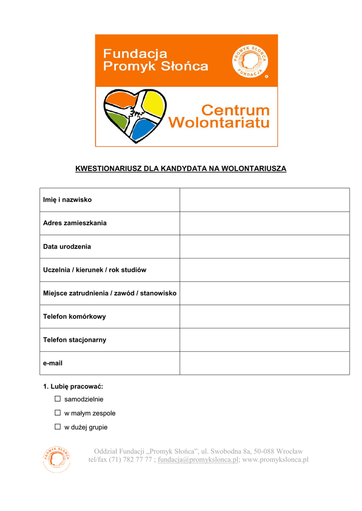 KWESTIONARIUSZ DLA KANDYDATA NA WOLONTARIUSZA Imię i nazwisko Adres zamieszkania Data urodzenia Uczelnia / kierunek / rok studiów Miejsce zatrudnienia / zawód / stanowisko Telefon komórkowy Telefon stacjonarny e-mail 1. Lubię pracować: □ samodzielnie □ w małym zespole □ w dużej grupie Oddział Fundacji „Promyk Słońca”, ul. Swobodna 8a, 50-088 Wrocław tel/fax (71) 782 77 77 ; [email protected]; www.promykslonca.pl 2. Moje zainteresowania, hobby: 3. Moje atuty, mocne strony (min. ukończone kursy, szkolenia np. pierwsza pomoc przedmedyczna , język migowy itp.) : 4. Ograniczenia w Twojej pracy wolontariusza: □ NIE □ TAK zdrowotne? czasowe? inne? (wpisz poniżej) 5. Czy pracowałaś / eś już jako wolontariusz? □ NIE □ TAK jak długo? w jakim charakterze? gdzie? (wpisz poniżej) Oddział Fundacji „Promyk Słońca”, ul. Swobodna 8a, 50-088 Wrocław tel/fax (71) 782 77 77 ; [email protected]; www.promykslonca.pl 6. Chcę zostać wolontariuszem, ponieważ: 7. Od wolontariatu oczekuję: 8. Chciałbym pracować z niepełnosprawnością: jako wolontariusz opiekując się dziećmi □ Regularnie – minimum 2 godziny w tygodniu □ Okazyjnie – akcje okolicznościowe, charytatywne, zbiórki, koncerty, konferencje itp. 9. Na wolontariat mogę poświęcić tygodniowo: □ 2-3 godziny □ 4-5 godzin □ 5-10 godzin □ 10-20 godzin □ 20-40 godzin Oddział Fundacji „Promyk Słońca”, ul. Swobodna 8a, 50-088 Wrocław tel/fax (71) 782 77 77 ; [email protected]; www.promykslonca.pl W jakie konkretnie dni tygodnia i w jakich godzinach dysponujesz czasem? Poniedziałek Wtorek Środa Czwartek Piątek Sobota Niedziela 10. O Fundacji „Promyk Słońca” dowiedziałam /em się: □ od rodziny lub znajomych □ ze szkoły □ z plakatów, ulotek □ ze strony internetowej www.promykslonca.pl □ ze strony internetowej www.pomagamydzieciom.info □ inne 11. TWOJE UWAGI LUB PYTANIA DOTYCZĄCE WOLONTARIATU: Wyrażam zgodę na przetwarzanie danych osobowych podanych w niniejszym formularzu dla potrzeb niezbędnych dla procesu rekrutacji do Centrum Wolontariatu Fundacji „Promyk Słońca” (zgodnie z Ustawą o Ochronie Danych Osobowych z dnia 29.08.1997). ………………………………………………………………………………………………….. Oddział Fundacji „Promyk Słońca”, ul. Swobodna 8a, 50-088 Wrocław tel/fax (71) 782 77 77 ; [email protected]; www.promykslonca.pl