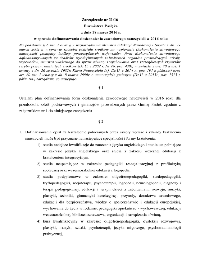 Zarządzenie nr 31/16 Burmistrza Pasłęka z dnia 18 marca 2016 r. w