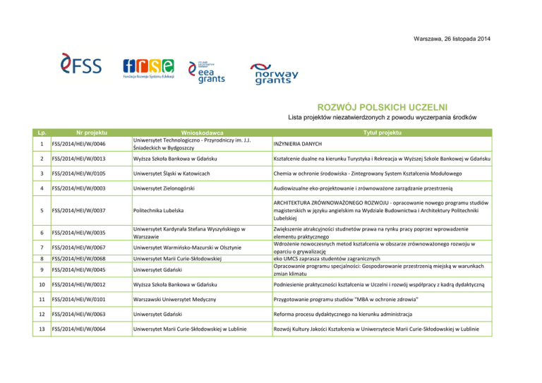 Warszawa, 26 listopada 2014 ROZWÓJ POLSKICH UCZELNI Lista projektów niezatwierdzonych z powodu wyczerpania środków Lp. Nr projektu Wnioskodawca Uniwersytet Technologiczno - Przyrodniczy im. J.J. Śniadeckich w Bydgoszczy Tytuł projektu 1 FSS/2014/HEI/W/0046 INŻYNIERIA DANYCH 2 FSS/2014/HEI/W/0013 Wyższa Szkoła Bankowa w Gdańsku Kształcenie dualne na kierunku Turystyka i Rekreacja w Wyższej Szkole Bankowej w Gdańsku 3 FSS/2014/HEI/W/0105 Uniwersytet Śląski w Katowicach Chemia w ochronie środowiska - Zintegrowany System Kształcenia Modułowego 4 FSS/2014/HEI/W/0003 Uniwersytet Zielonogórski Audiowizualne eko-projektowanie i zrównoważone zarządzanie przestrzenią 5 FSS/2014/HEI/W/0037 Politechnika Lubelska ARCHITEKTURA ZRÓWNOWAŻONEGO ROZWOJU - opracowanie nowego programu studiów magisterskich w języku angielskim na Wydziale Budownictwa i Architektury Politechniki Lubelskiej 6 FSS/2014/HEI/W/0035 Uniwersytet Kardynała Stefana Wyszyńskiego w Warszawie 7 FSS/2014/HEI/W/0067 Uniwersytet Warmińsko-Mazurski w Olsztynie 8 FSS/2014/HEI/W/0068 Uniwersytet Marii Curie-Skłodowskiej 9 FSS/2014/HEI/W/0045 Uniwersytet Gdański 10 FSS/2014/HEI/W/0012 Wyższa Szkoła Bankowa w Gdańsku Podniesienie praktyczności kształcenia w Uczelni i rozwój współpracy z kadrą dydaktyczną 11 FSS/2014/HEI/W/0101 Warszawski Uniwersytet Medyczny Przygotowanie programu studiów "MBA w ochronie zdrowia" 12 FSS/2014/HEI/W/0063 Uniwersytet Gdański Reforma procesu dydaktycznego na kierunku administracja 13 FSS/2014/HEI/W/0064 Uniwersytet Marii Curie-Skłodowskiej w Lublinie Rozwój Kultury Jakości Kształcenia w Uniwersytecie Marii Curie-Skłodowskiej w Lublinie Zwiększenie atrakcyjności studnetów prawa na rynku pracy poprzez wprowadzenie elementu praktycznego Wdrożenie nowoczesnych metod kształcenia w obszarze zrównoważonego rozwoju w oparciu o grywalizację eko UMCS zaprasza studentów zagranicznych Opracowanie programu specjalności: Gospodarowanie przestrzenią miejską w warunkach zmian klimatu 14 FSS/2014/HEI/W/0024 Wyższa Szkoła Informatyki i Zarządzania w Rzeszowie Finance and Accounting - droga do sukcesu 15 FSS/2014/HEI/W/0041 Uniwersytet Warmińsko-Mazurski w Olsztynie Dziedzictwo kulturowe i przyrodnicze- studia licencjackie w języku angielskim z elementami metody Problem Based Learning (PBL) 16 FSS/2014/HEI/W/0071 Wyższa Szkoła Przedsiębiorczości i Administracji w Lublinie Ekologiczne miasto 17 FSS/2014/HEI/W/0050 Państwowa Wyższa Szkoła Zawodowa w Tarnowie 18 FSS/2014/HEI/W/0038 Uniwersytet Jagielloński 19 FSS/2014/HEI/W/0021 Akademia Pedagogiki Specjalnej im Marii Grzegorzewskiej Utworzenie i rozwój specjalności bezpieczeństwo społeczne na kierunku praca socjalna 20 FSS/2014/HEI/W/0022 Akademia Pedagogiki Specjalnej im Marii Grzegorzewskiej 21 FSS/2014/HEI/W/0025 AKADEMIA HUMANISTYCZNO-EKONOMICZNA W ŁODZI 22 FSS/2014/HEI/W/0093 Państwowa Szkoła Wyższa im. Papieża Jana Pawła II w Białej Podlaskiej 23 FSS/2014/HEI/W/0104 Wyższa Szkoła Bankowa w Toruniu 24 FSS/2014/HEI/W/0091 25 FSS/2014/HEI/W/0042 26 FSS/2014/HEI/W/0129 27 FSS/2014/HEI/W/0039 28 29 FSS/2014/HEI/W/0073 FSS/2014/HEI/W/0080 30 FSS/2014/HEI/W/0026 31 FSS/2014/HEI/W/0097 32 FSS/2014/HEI/W/0049 Ecodesign w Studenckiej Agencji Projektowo-Reklamowej jako innowacyjna, praktyczna metoda kształcenia ekologicznie zaangażowanego na kierunkach wzornictwo i grafika z branżowym językiem angielskim Między nauką a biznesem. Przygotowanie studentów europeistyki do aktywności na rynku pracy. Zwiększenie oferty edukacyjnej o program pilotażowy studiów podyplomowych w zakresie współczesnych działań artystycznych Specjalność "Systemy produktowo–usługowe w transporcie" jako odpowiedź na współczesne wyzwania w zakresie zrównoważonej gospodarki STUDIA PODYPLOMOWE "BADANIA NAUKOWE, WDRAŻANIE I GOSPODARKA LEKOWA" Europejski standard kształcenia. Wzrost praktyczności kształcenia na kierunku LOGISTYKA i INŻYNIERIA ZARZĄDZANIA Gra biznesowa wspomagająca program studiów magisterskich Zarządzanie Portem Uniwersytet Ekonomiczny w Poznaniu Lotniczym w Uniwersytecie Ekonomicznym w Poznaniu Doskonalenie systemu zapewnienia jakości nauczania języków obcych w Jagiellońskim Uniwersytet Jagielloński Centrum Językowym "Świadoma kultura, odpowiedzialna sztuka - Rozszerzenie kompetencji - innowacyjny Uniwersytet Artystyczny w Poznaniu program dla sektora kultury Dolnośląska Wyższa Szkoła Przedsiębiorczości i Techniki w Studia podyplomowe z zarządzania projektami według metodyki TenStep Project Polkowicach Management Process Akademia Leona Koźmińskiego Edukacja medialna szansą na zwiększenie konkurencyjności ALK Wyższa Szkoła Ekonomii i Innowacji w Lublinie Gry i symulacje w ekonomii menedżerskiej Uczeń agresywny wyzwaniem dla nauczyciela- jak radzić sobie ze współczesnymi formami Akademia Pedagogiki Specjalnej im Marii Grzegorzewskiej przemocy w szkole Ochrona środowiska w zawodzie tłumacza i nauczyciela języka obcego - przygotowanie i Uniwersytet Śląski w Katowicach wdrożenie dwóch nowych modułów na kierunku filologia germańska specjalność tłumaczeniowa i nauczycielska z jezykiem szwedzkim Uniwersytet Warmińsko-Mazurski w Olsztynie Ekologiczne Praktyki i Techniki w Nowych Mediach