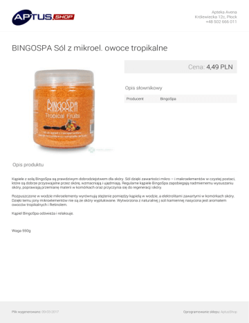 Apteka Avena Królewiecka 12c, Płock +48 502 666 011 BINGOSPA Sól z mikroel. owoce tropikalne Cena: 4,49 PLN Opis słownikowy Producent BingoSpa Opis produktu Kąpiele z solą BingoSpa są prawdziwym dobrodziejstwem dla skóry. Sól dzięki zawartości mikro – i makroelementów w czystej postaci, które są dobrze przyswajalne przez skórę, wzmacniają i ujędrniają. Regularne kąpiele BingoSpa zapobiegają nadmiernemu wysuszaniu skóry, poprawiają przemianę materii w komórkach oraz przyczynia się do regeneracji skóry. Rozpuszczone w wodzie mikroelementy wyrównują stężenie pomiędzy kąpielą w wodzie, a elektrolitami zawartymi w komórkach skóry. Dzięki temu jony mikroelementów nie są ze skóry wypłukiwane. Wytworzona z naturalnej j soli kamiennej nasycona jest aromatem owoców tropikalnych i Retinolem. Kąpiel BingoSpa odświeża i relaksuje. Waga 550g Plik wygenerowano: 09-03-2017 Powered by TCPDF (www.tcpdf.org) Oprogramowanie sklepu: AptusShop