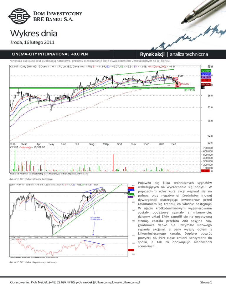 Wykres dnia środa, 16 lutego 2011 Rynek akcji | analiza techniczna CINEMA-CITY INTERNATIONAL 40.0 PLN Niniejsza publikacja jest publikacją handlową, prosimy o zapoznanie się z oświadczeniem umieszczonym na jej końcu. Rys. nr 1. CCI Wykres dzienny świecowy. Pojawiło się kilka technicznych sygnałów wskazujących na wyczerpanie się popytu. W poprzednim roku kurs akcji wspinał się na północ przy negatywnej średnioterminowej dywergencji ostrzegając inwestorów przed załamaniem się trendu, co właśnie następuje. W ujęciu krótkoterminowym wygenerowane zostały podażowe sygnały a mianowicie: dzienny układ EMA zapętlił się na negatywną stronę, została przebita 200 sesyjna MA, grudniowe denko nie utrzymało lutowego sypania akcjami, a ceny wyszły dołem z kilkumiesięcznego kanału. Dopiero powrót powyżej 46 PLN close zmieni sentyment do spółki, a tak to obowiązuje niedźwiedzi scenariusz… Rys. nr 2. CCI Wykres tygodniowy świecowy. Opracowanie: Piotr Neidek, (+48) 22 697 47 66, [email protected], www.dibre.com.pl Strona 1 Wykres dnia Prywatny Makler DIBRE | środa, 16 lutego 2011 Biuro Aktywnej Sprzedaży ul. Wspólna 47/49, 00-684 Warszawa Jarosław Banasiak dyrektor tel: (+48) 22 697 4870 fax: (+48) 22 697 4726/4923 email: [email protected] Zespół Prywatnego Maklera Zespół Wsparcia Sprzedaży Joanna Gębal Dominik Murlak kierownik tel: (+48) 22 697 4762 email: [email protected] Iwona Strzałkowska-Kominiak tel: (+48) 22 697 4853 email: [email protected] Marcin Bieguński tel: (+48) 22 697 4984 email: [email protected] Przemysław Miedziocha tel: (+48) 22 697 4768 email: [email protected] Mariusz Nowak tel: (+48) 22 697 4848 email: [email protected] tel: email: (+48) 22 697 4703 [email protected] Daniel Cegiełka infoserwis tel: email: (+48) 22 697 4914 [email protected] Dariusz Dadej analiza techniczna tel: email: (+48) 17 850 3811 [email protected] Piotr Neidek analiza techniczna tel: email: (+48) 22 697 4766 [email protected] Paweł Szczepanik analiza techniczna tel: email: (+48) 22 697 4947 [email protected] Paweł Rudowski tel: (+48) 22 697 4852 email: [email protected] Tomasz Wojna tel: (+48) 22 697 4809 email: [email protected] Niniejsza publikacja przygotowana przez Dom Inwestycyjny BRE Banku S.A. z siedzibą w Warszawie, przy ul. Wspólnej 47/49, jest publikacją handlową, została przygotowana wyłącznie w celach informacyjnych, nie stanowi rekomendacji w rozumieniu przepisów „Rozporządzenia Ministra Finansów z dnia 19 października 2005 r. w sprawie informacji stanowiących rekomendacje dotyczące instrumentów finansowych lub ich emitentów lub wystawców (Dz. U. nr 206 z 2005 r.), nie stanowi porady inwestycyjnej, nie stanowi oferty zbycia lub nabycia wymienionych w niej instrumentów finansowych, nie stanowi podstawy do zawarcia jakiejkolwiek umowy lub powstania jakiegokolwiek zobowiązania. Informacje zawarte w niniejszej publikacji oparte są na danych uzyskanych ze źródeł, które Dom Inwestycyjny BRE Banku S.A., działając w dobrej wierze, uważa za wiarygodne. Dom Inwestycyjny BRE Banku S.A. nie gwarantuje jednak dokładności, kompletności ani trafności tych informacji. Dom Inwestycyjny BRE Banku S.A., jego organy zarządcze, organy nadzorcze, ani pracownicy nie ponoszą odpowiedzialności za wszelkie skutki finansowe i niefinansowe powstałe w wyniku wykorzystania niniejszej publikacji lub zawartych w niej informacji. Wszelkie opinie, prognozy, kalkulacje i szacunki zawarte w niniejszej publikacji stanowią jedynie wyraz subiektywnej oceny autora na moment jej wydania i mogą być zmieniane bez uprzedzenia. Opinie wyrażone w niniejszej publikacji nie pozostają w jakiejkolwiek zależności od rekomendacji przygotowywanych przez Dom Inwestycyjny BRE Banku S.A.. Dom Inwestycyjny BRE Banku S.A. nie jest zobowiązany do aktualizowania ani modyfikowania niniejszej publikacji, ani do informowania jej odbiorców w przypadku, gdy jakakolwiek poruszona w niej kwestia lub zawarta w niej opinia, prognoza, kalkulacja lub szacunek ulegnie zmianie lub stanie się nieaktualne. Dom Inwestycyjny BRE Banku S.A. udostępnia niniejszą publikację nieodpłatnie. Zabronione jest powielanie i rozpowszechnianie niniejszej publikacji bez pisemnej zgody Domu Inwestycyjnego BRE Banku S.A. Opracowanie: Piotr Neidek, (+48) 22 697 47 66, [email protected], www.dibre.com.pl Strona 2