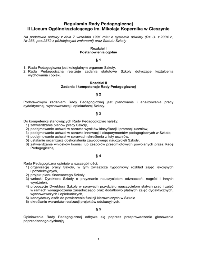 Regulamin Rady Pedagogicznej II Liceum Ogólnokształcącego im. Mikołaja Kopernika w Cieszynie Na podstawie ustawy z dnia 7 września 1991 roku o systemie oświaty (Dz. U. z 2004 r., Nr 256, poz.2572 z późniejszymi zmianami) oraz Statutu Szkoły Rozdział l Postanowienia ogólne §1 1. Rada Pedagogiczna jest kolegialnym organem Szkoły. 2. Rada Pedagogiczna realizuje zadania statutowe wychowania i opieki. Szkoły dotyczące kształcenia Rozdział II Zadania i kompetencje Rady Pedagogicznej §2 Podstawowym zadaniem Rady Pedagogicznej jest planowanie i analizowanie pracy dydaktycznej, wychowawczej i opiekuńczej Szkoły. §3 Do kompetencji stanowiących Rady Pedagogicznej należy: 1) zatwierdzanie planów pracy Szkoły, 2) podejmowanie uchwał w sprawie wyników klasyfikacji i promocji uczniów, 3) podejmowanie uchwał w sprawie innowacji i eksperymentów pedagogicznych w Szkole, 4) podejmowanie uchwał w sprawach skreślenia z listy uczniów, 5) ustalanie organizacji doskonalenia zawodowego nauczycieli Szkoły, 6) zatwierdzanie wniosków komisji lub zespołów przedmiotowych powołanych przez Radę Pedagogiczną. §4 Rada Pedagogiczna opiniuje w szczególności: 1) organizację pracy Szkoły, w tym zwłaszcza tygodniowy rozkład zajęć lekcyjnych i pozalekcyjnych, 2) projekt planu finansowego Szkoły, 3) wnioski Dyrektora Szkoły o przyznanie nauczycielom odznaczeń, nagród i innych wyróżnień, 4) propozycje Dyrektora Szkoły w sprawach przydziału nauczycielom stałych prac i zajęć w ramach wynagrodzenia zasadniczego oraz dodatkowo płatnych zajęć dydaktycznych, wychowawczych i opiekuńczych, 5) kandydatury osób do powierzenia funkcji kierowniczych w Szkole 6) określanie warunków realizacji projektów edukacyjnych. §5 Opiniowanie Rady Pedagogicznej odbywa się poprzez przeprowadzenie głosowania poprzedzonego dyskusją. 1 §6 Rada Pedagogiczna opracowuje i uchwala statut Szkoły oraz jego zmiany. §7 Rada Pedagogiczna może wystąpić z wnioskiem o odwołanie nauczyciela ze stanowiska kierowniczego w Szkole. Rozdział III Ogólne zasady działania Rady Pedagogicznej §8 1. Przewodniczącym Rady Pedagogicznej jest Dyrektor Szkoły. 2. W skład Rady Pedagogicznej wchodzą wszyscy nauczyciele zatrudnieni w Szkole. §9 1. W zebraniach Rady Pedagogicznej może brać udział przedstawiciel organu sprawującego nadzór pedagogiczny nad Szkołą oraz przedstawiciel organu prowadzącego Szkołę. 2. W zebraniach Rady Pedagogicznej mogą brać udział z głosem doradczym osoby zapraszane przez jej przewodniczącego za zgodą lub na wniosek członków Rady Pedagogicznej. 3. Osoby, o których mowa w ust. 1 i 2 uczestniczą w tej części zebrania Rady Pedagogicznej, która dotyczy ich zakresu spraw. 4. Osoby zaproszone, nie będące członkami Rady Pedagogicznej, nie biorą udziału w głosowaniach. 5. W części zebrania Rady Pedagogicznej, w której rozpatrywane są wnioski o skreślenie z listy uczniów, mogą uczestniczyć, za zgodą Rady Pedagogicznej, rodzice (opiekunowie prawni) uczniów i uczniowie, których dotyczą wnioski. Po przedstawieniu swojego stanowiska rodzice (opiekunowie prawni) uczniów i uczniowie wychodzą z zebrania. § 10 1. Zebrania Rady Pedagogicznej odbywają się zgodnie z przyjętym na początku roku harmonogramem oraz w miarę bieżących potrzeb. 2. Zebrania zwyczajne Rady Pedagogicznej organizowane są: 1) przed rozpoczęciem roku szkolnego, 2) w każdym okresie (semestrze) w związku z zatwierdzeniem wyników klasyfikowania i promowania uczniów, 3) po zakończeniu pierwszego okresu oraz rocznych zajęć szkolnych w celu przedstawienia przez Dyrektora Szkoły ogólnych wniosków wynikających ze sprawowanego nadzoru pedagogicznego oraz informacji o działalności Szkoły, 4) w miarę bieżących potrzeb. 3. Zebrania Rady Pedagogicznej mogą być organizowane również w trybie nadzwyczajnym na wniosek organu sprawującego nadzór pedagogiczny, z inicjatywy Dyrektora Szkoły, organu prowadzącego Szkołę lub co najmniej 1/3 członków Rady Pedagogicznej. 4. Wystąpienia o organizację zebrania Rady Pedagogicznej w trybie nadzwyczajnym kierowane są w formie pisemnej do przewodniczącego. 5. Wystąpienia o organizację zebrania Rady Pedagogicznej w trybie nadzwyczajnym powinny określać przyczynę zorganizowania zebrania oraz określać pożądany termin jego przeprowadzenia. 6. Zebrania Rady Pedagogicznej prowadzi jej przewodniczący. 2 7. W szczególnych przypadkach przewodniczący Rady Pedagogicznej może powierzyć prowadzenie zebrania Rady Pedagogicznej innemu nauczycielowi zatrudnionemu w Szkole. 8. W przypadku długotrwałej nieobecności Dyrektora Szkoły, funkcję przewodniczącego Rady Pedagogicznej pełni zastępca Dyrektora lub członek Rady Pedagogicznej wskazany przez organ prowadzący. 9. W przypadku nagłej choroby Dyrektora Szkoły, gdy nie ma możliwości przełożenia zebrania Rady Pedagogicznej, prowadzenie zebrania można powierzyć wybranemu członkowi Rady Pedagogicznej. Wyboru dokonuje się w drodze głosowania. 10. Propozycję kandydatury na przewodniczącego zebrania może zgłosić każdy z członków Rady Pedagogicznej. Przewodniczącym zostaje osoba, która uzyska największą liczbę głosów w głosowaniu. 11. Pod nieobecność Dyrektora Szkoły z powodu nagłej choroby, Rada Pedagogiczna nie podejmuje innych uchwał, niż te, które zostały ujęte w propozycji porządku obrad, z wyjątkiem uchwały dotyczącej wystąpienia z wnioskiem o odwołanie Dyrektora ze stanowiska, gdy Dyrektor Szkoły wyraźnie uniemożliwia Radzie Pedagogicznej podjęcie uchwały w tej sprawie. 12. O terminie i proponowanym porządku zebrania przewodniczący powiadamia wszystkich członków Rady Pedagogicznej przynajmniej z tygodniowym wyprzedzeniem. 13. Nadzwyczajne zebranie Rady Pedagogicznej może być zorganizowane w dniu powiadomienia. 14. Przewodniczący Rady Pedagogicznej podaje do wiadomości termin i proponowany porządek zebrania na