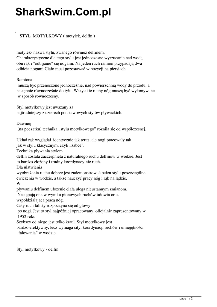 SharkSwim.Com.pl STYL MOTYLKOWY ( motylek, delfin ) motylek- nazwa stylu, zwanego również delfinem. Charakterystyczne dla tego stylu jest jednoczesne wyrzucanie nad wodą obu rąk i "odbijanie" się nogami. Na jeden ruch ramion przypadają dwa odbicia nogami.Ciało musi pozostawać w pozycji na piersiach. Ramiona muszą być przenoszone jednocześnie, nad powierzchnią wody do przodu, a następnie równocześnie do tyłu. Wszystkie ruchy nóg muszą być wykonywane w sposób równoczesny. Styl motylkowy jest uważany za najtrudniejszy z czterech podstawowych stylów pływackich. Dawniej (na początku) technika „stylu motylkowego” różniła się od współczesnej. Układ rąk wyglądał identycznie jak teraz, ale nogi pracowały tak jak w stylu klasycznym, czyli „żabce”. Technika pływania stylem delfin została zaczerpnięta z naturalnego ruchu delfinów w wodzie. Jest to bardzo złożony i trudny koordynacyjnie ruch. Dla ułatwienia wyobrażenia ruchu dobrze jest zademonstrować pełen styl i poszczególne ćwiczenia w wodzie, a także nauczyć pracy nóg i rąk na lądzie. W pływaniu delfinem ułożenie ciała ulega nieustannym zmianom. Następują one w wyniku pionowych ruchów tułowia oraz współdziałającą pracą nóg. Cały ruch falisty rozpoczyna się od głowy po nogi. Jest to styl najpóźniej opracowany, oficjalnie zaprezentowany w 1952 roku. Szybszy od niego jest tylko kraul. Styl motylkowy jest bardzo efektywny, lecz wymaga siły, koordynacji ruchów i umiejętności „falowania” w wodzie. Styl motylkowy - delfin page 1 / 2 SharkSwim.Com.pl Lekko ugięte w stawach łokciowych ramiona, z dłońmi położonymi nieco szerzej od szerokości barków, rozpoczynają chwyt wody. Dłonie kierują się w dół i na zewnątrz. Biodra są wypychane w górę, co stanowi reakcję na uderzenia nóg w dół. Duży wir wodny w końcu stóp świadczy właśnie o zakończeniu pierwszego uderzenia nóg. Uderzenie to ma ogromne znaczenie w utrzymaniu wysokiej prędkości wewnątrzcyklowej. Ugięcie ramion stopniowo pogłębia się, co umożliwia powstanie efektu tzw. wysokiego łokcia. Dłonie rozpoczynają pociągnięcie w kierunku w dół i na zewnątrz. Głowa unosi się, aby zapobiec zbyt dużemu zanurzeniu się ciała. Ciało przyjmuje bardzo korzystny opływowy kształt. page 2 / 2