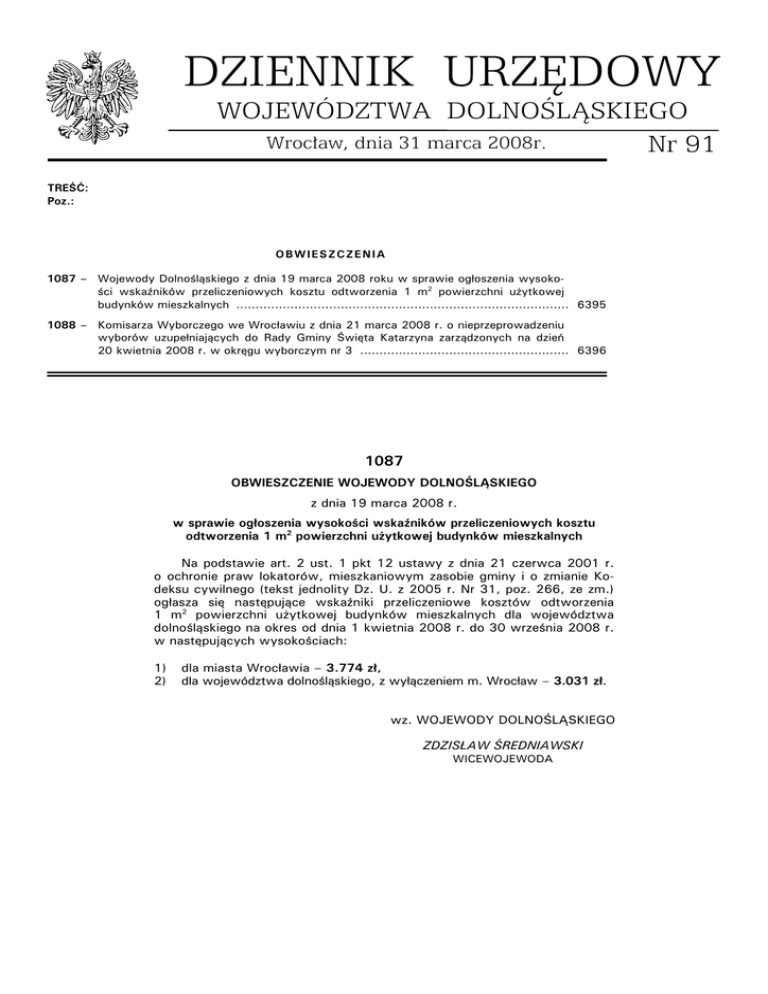 WOJEWÓDZTWA DOLNOŚLĄSKIEGO Wrocław, dnia 31 marca 2008r. Nr 91 TREŚĆ: Poz.: OBWIESZCZENIA 1087 – Wojewody Dolnośląskiego z dnia 19 marca 2008 roku w sprawie ogłoszenia wysokości wskaźników przeliczeniowych kosztu odtworzenia 1 m2 powierzchni użytkowej budynków mieszkalnych ...................................................................................... 6395 1088 – Komisarza Wyborczego we Wrocławiu z dnia 21 marca 2008 r. o nieprzeprowadzeniu wyborów uzupełniających do Rady Gminy Święta Katarzyna zarządzonych na dzień 20 kwietnia 2008 r. w okręgu wyborczym nr 3 ...................................................... 6396 1087 OBWIESZCZENIE WOJEWODY DOLNOŚLĄSKIEGO z dnia 19 marca 2008 r. w sprawie ogłoszenia wysokości wskaźników przeliczeniowych kosztu odtworzenia 1 m2 powierzchni u ytkowez hudynków mieszkalnych Na podstawie art. 2 ust. 1 pkt 12 ustawy z dnia 21 czerwca 2001 r. o ochronie praw lokatorów, mieszkaniowym zasobie gminy i o zmianie Kodeksu cywilnego (tekst jednolity Dz. U. z 2005 r. Nr 31, poz. 266, ze zm.) ogłasza się następujące wskaźniki przeliczeniowe kosztów odtworzenia 1 m2 powierzchni użytkowej budynków mieszkalnych dla województwa dolnośląskiego na okres od dnia 1 kwietnia 2008 r. do 30 września 2008 r. w następujących wysokościach: 1) 2) dla miasta Wrocławia – 3.774 zł, dla województwa dolnośląskiego, z wyłączeniem m. Wrocław – 3.031 zł. wz. WOJEWODw DOWNOŚWODK EGO ZDZISŁAW ŚREDNIAWSKI W CEWOJEWODJ Dziennik Urzędowy Województwa Dolnośląskiego Nr 91 – 6396 – Poz. 1088 1088 OBWIESZCZENIE KOMISARZA WYBORCZEGO WE WROCNAWIK z dnia 21 marca 2008 r. o nieprzeprowadzeniu wyhorów uzupełniazących do Rady Gminy Święta Katarzyna zarządzonych na dzień 20 kwietnia 2008 r. w okręgu wyhorczym nr 3 Na podstawie art. 182 ust. 1 i 2 ustawy z dnia 16 lipca 1998 r. – Ordynacja wyborcza do rad gmin, rad powiatów i sejmików województw (Dz. U. z 2003 r. Nr 159, poz. 1547, z późn. zm.) Komisarz Wyborczy we Wrocławiu podaje do publicznej wiadomości, co następuje: W wyborach uzupełniających zarządzonych na dzień 20 kwietnia 2008 r., w okręgu wyborczym nr 3, utworzonym dla wyboru Rady Gminy Święta Katarzyna, Gminna Komisja Wyborcza w Świętej Katarzynie nie zarejestrowała żadnej listy kandydatów na radnych. W związku z tym, na podstawie art. 108 ust. 2 Ordynacji wyborczej, w okręgu wyborczym nr 3 wyborów uzupełniających do Rady Gminy Święta Katarzyna nie przeprowadza się. Jednocześnie Komisarz Wyborczy we Wrocławiu informuje, że zgodnie z art. 193 ust. 2 Ordynacji wyborczej, jeżeli w wyniku wyborów uzupełniających mandat pozostaje nieobsadzony, wybory uzupełniające powtarza się między 6 a 9 miesiącem licząc od daty tych wyborów. KOM DJRI WwZORCIw WE WROCŁJW U MARIAN GRUSZCZYŃSKI Egzemplarze bieżące i z lat ubiegłych oraz załączniki można nabywać: 1) 2) w punktach sprzedaży: – Dolnośląskiego Urzędu Wojewódzkiego we Wrocławiu, 50-951 Wrocław, pl. Powstańców Warszawy 1, tel. 0-71/340-64-74, – Dolnośląskiego Urzędu Wojewódzkiego we Wrocławiu Delegatura w Jeleniej Górze, 58-506 Jelenia Góra, ul. Wiejska 29, tel. 0-75/764-72-99, – Dolnośląskiego Urzędu Wojewódzkiego we Wrocławiu Delegatura w Wegnicy, 59-220 Wegnica, ul. F. Dkarbka 3, tel. 0-76/856-08-00 w. 401, – Dolnośląskiego Urzędu Wojewódzkiego we Wrocławiu Delegatura w Wałbrzychu, 58-300 Wałbrzych, ul. Dłowackiego 23a–24, tel. 0-74/849-40-70, w przypadku prenumeraty, na podstawie nadesłanego zamówienia w Dolnośląskim Urzędzie Wojewódzkim we Wrocławiu – Iakładzie Obsługi Urzędu, 50-951 Wrocław, pl. Powstańców Warszawy 1, tel. 0-71/340-62-02. Ibiory Dziennika Urzędowego wraz ze skorowidzami wyłożone są do powszechnego wglądu w Zibliotece Urzędowej Dolnośląskiego Urzędu Wojewódzkiego, pl. Powstańców Warszawy 1, 50-951 Wrocław, tel. 0-71/340-62-54. Treść wydawanych dzienników dostępna jest w nternecie na stronie: http://www.duw.pl//dzienn.htm Wydawca: Wojewoda Dolnośląski Redakcza: Wydział Nadzoru i Kontroli Dolnośląskiego Urzędu Wojewódzkiego, Redakcja Dziennika Urzędowego Województwa Dolnośląskiego, 50-951 Wrocław, pl. Powstańców Warszawy 1, tel. 0-71/340-66-21 Skład, druk i rozpowszechnianie: Dolnośląski Urząd Wojewódzki we Wrocławiu – Iakład Obsługi Urzędu, 50-951 Wrocław, pl. Powstańców Warszawy 1 Dystryhucza: tel. 0-71/340-62-02 Tłoczono z polecenia Wojewody Dolnośląskiego w Dolnośląskim Urzędzie Wojewódzkim we Wrocławiu – Iakładzie Obsługi Urzędu 50-951 Wrocław, pl. Powstańców Warszawy 1 nakład 40 egz. PW DDN 0239-8362 Cena: na CD 3,33 zł 3,33 zł (w tym 7% VJT) (w tym 7% VJT)