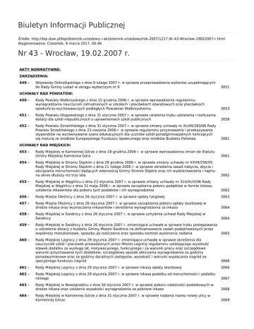 Biuletyn Informacji Publicznej Źródło: http://bip.duw.pl/bip/dziennik-urzedowy-i-ak/dziennik-urzedowy/rok-2007/1217,Nr-43-Wroclaw-19022007-r.html Wygenerowano: Czwartek, 9 marca 2017, 00:46 Nr 43 - Wrocław, 19.02.2007 r. AKTY NORMATYWNE: ZARZĄDZENIA: 449 - Wojewody Dolnośląskiego z dnia 9 lutego 2007 r. w sprawie przeprowadzenia wyborów uzupełniających do Rady Gminy Lubań w okręgu wyborczym nr 6 3051 UCHWAŁY RAD POWIATÓW: 450 - 451 452 - Rady Powiatu Wałbrzyskiego z dnia 15 grudnia 2006 r. w sprawie wprowadzenia regulaminu wynagradzania nauczycieli zatrudnionych w szkołach i placówkach oświatowych oraz placówkach opiekuńczo-wychowawczych podległych Powiatowi Wałbrzyskiemu 3053 Rady Powiatu Głogowskiego z dnia 31 stycznia 2007 r. w sprawie ustalenia trybu udzielania i rozliczania dotacji dla szkół niepublicznych o uprawnieniach szkół publicznych 3058 Rady Powiatu Strzelińskiego z dnia 31 stycznia 2007 r. w sprawie zmiany uchwały nr XLVIII/283/06 Rady Powiatu Strzelińskiego z dnia 23 sierpnia 2006 r. w sprawie regulaminu przyznawania i przekazywania stypendiów na wyrównywanie szans edukacyjnych dla uczniów szkół ponadgimnazjalnych kończących się maturą ze środków Europejskiego Funduszu Społecznego oraz środków Budżetu Państwa 3061 UCHWAŁY RAD MIEJSKICH: 453 - Rady Miejskiej w Kamiennej Górze z dnia 18 grudnia 2006 r. w sprawie wprowadzenia zmian do Statutu Gminy Miejskiej Kamienna Góra 3061 Rady Miejskiej w Stroniu Śląskim z dnia 28 grudnia 2006 r. w sprawie zmiany uchwały nr XXVII/256/05 Rady Miejskiej w Stroniu Śląskim z dnia 21 lutego 2005 r. w sprawie określenia zasad nabycia, zbycia i obciążania nieruchomości będących własnością Gminy Stronie Śląskie oraz ich wydzierżawiania i najmu na okres dłuższy niż trzy lata 3062 Rady Miejskiej w Węglińcu z dnia 23 stycznia 2007 r. w sprawie zmiany uchwały nr 314/XLIV/06 Rady Miejskiej w Węglińcu z dnia 31 maja 2006 r. w sprawie zarządzenia poboru podatków w formie inkasa, ustalenia inkasentów dla poboru tych podatków i ich wynagrodzenia 3062 456 - Rady Miasta Oleśnicy z dnia 26 stycznia 2007 r. w sprawie opłaty targowej 3063 457 - Rady Miasta Oleśnicy z dnia 26 stycznia 2007 r. w sprawie zarządzenia poboru opłaty skarbowej w drodze inkasa oraz wyznaczenia inkasentów i określenia wynagrodzenia za inkaso 3064 Rady Miejskiej w Świdnicy z dnia 26 stycznia 2007 r. w sprawie uchylenia uchwał Rady Miejskiej w Świdnicy 3064 454 - 455 - 458 459 - Rady Miejskiej w Świdnicy z dnia 26 stycznia 2007 r. zmieniająca uchwałę w sprawie trybu postępowania o udzielenie dotacji z budżetu Gminy Miasto Świdnica na dofinansowanie zadań podejmowanych przez wspólnoty mieszkaniowe, sposobu jej rozliczania oraz sposobu kontroli wykonania zadania 3065 460 - Rady Miejskiej Legnicy z dnia 29 stycznia 2007 r. zmieniająca uchwałę w sprawie określenia dla nauczycieli szkół i placówek prowadzonych przez Miasto Legnicę regulaminu ustalającego wysokość stawek dodatku za wysługę lat, motywacyjnego, funkcyjnego i za warunki pracy oraz szczegółowe warunki przyznawania tych dodatków, szczegółowy sposób obliczania wynagrodzenia za godziny ponadwymiarowe oraz za godziny doraźnych zastępstw, wysokość i warunki wypłacania nagród ze specjalnego funduszu nagród 3066 461 - Rady Miejskiej Legnicy z dnia 29 stycznia 2007 r. w sprawie inkasa opłaty skarbowej 3066 462 - Rady Miejskiej Legnicy z dnia 29 stycznia 2007 r. w sprawie inkasa podatku od nieruchomości i podatku rolnego 3067 Rady Miejskiej w Nowogrodźcu z dnia 30 stycznia 2007 r. w sprawie poboru należności podatkowych w drodze inkasa oraz ustalenia wysokości wynagrodzenia za pobrane inkaso 3068 Rady Miejskiej w Kamiennej Górze z dnia 31 stycznia 2007 r. w sprawie nadania nazwy nowej ulicy w Kamiennej Górze 3069 463 464 - 465 - Rady Miejskiej w Kamiennej Górze z dnia 31 stycznia 2007 r. w sprawie zmiany uchwały nr XLIX/A/333/06 Rady Miejskiej Kamienna Góra z dnia 6 września 2006 r. w sprawie ustalenia regulaminu określającego kryteria i tryb przyznawania nauczycielom zatrudnionym w przedszkolach i szkołach prowadzonych przez Gminę Miejską Kamienna Góra nagród ze specjalnego funduszu na nagrody dla nauczycieli 3071 466 - Rady Miejskiej Kudowy Zdroju z dnia 31 stycznia 2007 r. w sprawie zmiany uchwały nr XLVI/279/05 Rady Miejskiej Kudowy Zdroju z dnia 30 grudnia 2005 r. w sprawie nadania Statutu Muzeum Kultury Ludowej Pogórza Sudeckiego w Kudowie Zdroju 3071 467 - Rady Miejskiej Kudowy Zdroju z dnia 31 stycznia 2007 r. w sprawie zarządzenia poboru opłaty skarbowej w drodze inkasa oraz wyznaczenia inkasentów i określenia wysokości wynagrodzenia za inkaso 3072 468 - Rady Miejskiej Mieroszowa z dnia 31 stycznia 2007 r. w sprawie określenia inkasenta opłaty skarbowej oraz wynagrodzenia za inkaso 3072 UCHWAŁY RAD GMIN: 469 470 - 471 472 473 - 474 - Rady Gminy Lubin z dnia 28 sierpnia 2006 r. w sprawie uchwalenia regulaminu dostarczania wody i odprowadzania ścieków 3073 Rady Gminy Lubin z dnia 30 stycznia 2007 r. w sprawie zmiany uchwały nr XLV/193/2006 Rady Gminy Lubin z dnia 28 sierpnia 2006 r. w sprawie uchwalenia regulaminu dostarczania wody i odprowadzania ścieków 3077 Rady Gminy w Warcie Bolesławieckiej z dnia 18 stycznia 2007 r. w sprawie zmian Statutu Gminy Warta Bolesławiecka 3077 Rady Gminy Mietków z dnia 26 stycznia 2007 r. w sprawie utworzenia Gminnego Ośrodka Kultury w Mietkowie i nadania mu statutu 3078 Rady Gminy Długołęka z dnia 30 stycznia 2007 r. w sprawie zasad i trybu udzielania dotacji na prace konserwatorskie, restauratorskie lub roboty budowlane przy zabytkach, sposobu jej rozliczenia i kontroli wykonania zleconego zadania 3080 Rady Gminy Złotoryja z dnia 31 stycznia 2007 r. w sprawie ustalenia wysokości stawki podatku od posiadania psów, określenia zasad jego ustalania i poboru, terminów płatności oraz określenia inkasentów 3082 INNE AKTY PRAWNE: ZARZ