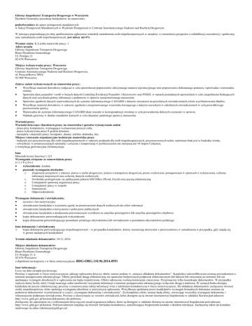 Główny Inspektorat Transportu Drogowego w Warszawie Dyrektor Generalny poszukuje kandydatów na stanowisko: podreferendarz do spraw postępowań mandatowych w Sekcji Postępowań Mandatowych w Wydziale Postępowań w Centrum Automatycznego Nadzoru nad Ruchem Drogowym. W miesiącu poprzedzającym datę upublicznienia ogłoszenia wskaźnik zatrudnienia osób niepełnosprawnych w urzędzie, w rozumieniu przepisów o rehabilitacji zawodowej i społecznej oraz zatrudnianiu osób niepełnosprawnych, jest niższy niż 6%. Wymiar etatu: 1; Liczba stanowisk pracy: 1 Adres urzędu Główny Inspektorat Transportu Drogowego Biuro Dyrektora Generalnego Ul. Postępu 21 02-676 Warszawa Miejsce wykonywania pracy: Warszawa Główny Inspektorat Transportu Drogowego Centrum Automatycznego Nadzoru nad Ruchem Drogowym, ul. Przyczółkowa 109A, 02-968 Warszawa. Zakres zadań wykonywanych na stanowisku pracy: Weryfikuje materiał dowodowy (zdjęcia) w celu sprawdzenia poprawności odczytanego numeru rejestracyjnego oraz poprawności dokonanego pomiaru, wprowadza i zatwierdza zmiany. Sprawdza dane pojazdów i osób w bazach danych Centralnej Ewidencji Pojazdów i Kierowców oraz PESEL w ramach posiadanych upoważnień w celu uzupełnienia brakujących danych oraz uzyskania pełnej informacji o podmiocie w sprawie zarejestrowanego naruszenia. Sprawdza zgodność danych wprowadzonych do systemu informatycznego CANARD z danymi zawartymi na przesłanych oświadczeniach celem wyeliminowania błędów. Weryfikuje materiał dowodowy w zakresie zgodności zarejestrowanego wizerunku kierującego z danymi zawartymi w odesłanych oświadczeniach w celu prawidłowego procesowania sprawy. Wprowadza do systemu informatycznego CANARD dane zawarte w korespondencji zwrotnej w celu prowadzenia dalszych czynności w sprawie. Nakłada grzywny w drodze mandatów karnych w celu ukarania ustalonego sprawcy naruszenia. Warunki pracy Warunki dotyczące charakteru pracy na stanowisku i sposobu wykonywania zadań - praca przy komputerze, wymagająca wymuszonej pozycji ciała; - praca wykonywana przez 8 godzin dziennie, - narzędzia i materiały pracy: komputer, skaner, telefon, drukarka, fax; Miejsce i otoczenie organizacyjno-techniczne stanowiska pracy - budynek jest przystosowany dla osób niepełnosprawnych w zakresie podjazdu dla osób niepełnosprawnych, przystosowanych toalet, natomiast brak jest w budynku windy; - oświetlenie w pomieszczeniach naturalne i sztuczne z temperaturą w pomieszczeniu nie mniejszą niż 18 stopni Celsjusza, z wentylacją grawitacyjną i klimatyzacją; Inne Mnożnik kwoty bazowej 1.121 Wymagania związane ze stanowiskiem pracy niezbędne wykształcenie: średnie pozostałe wymagania niezbędne: o Znajomość przepisów z zakresu: prawo o ruchu drogowym; ustawa o transporcie drogowym; prawo wykroczeń; postępowania w sprawach o wykroczenia; ochrony informacji niejawnych oraz ochrony danych osobowych. o Swobodne posługiwanie się aplikacjami pakietu MS Office (Word, Excel) oraz pocztą elektroniczną. o Umiejętność sprawnej organizacji pracy. o Umiejętność pracy w zespole. o Sumienność. o Odpowiedzialność. Wymagane dokumenty i oświadczenia: życiorys i list motywacyjny oświadczenie kandydata o wyrażeniu zgody na przetwarzanie danych osobowych do celów rekrutacji oświadczenie kandydata o korzystaniu z pełni praw publicznych oświadczenie kandydata o nieskazaniu prawomocnym wyrokiem za umyślne przestępstwo lub umyślne przestępstwo skarbowe kopie dokumentów potwierdzających wykształcenie kopia dokumentu potwierdzającego posiadanie polskiego obywatelstwa lub oświadczenie o posiadaniu obywatelstwa polskiego Inne dokumenty i oświadczenia o kopia dokumentu potwierdzającego niepełnosprawność - w przypadku kandydatów, którzy zamierzają skorzystać z pierwszeństwa w zatrudnieniu w przypadku, gdy znajdą się w gronie najlepszych kandydatów Termin składania dokumentów: 19-11-2014 Miejsce składania dokumentów: Główny Inspektorat Transportu Drogowego Biuro Dyrektora Generalnego Ul. Postępu 21 A 02-676 Warszawa z dopiskiem na kopercie i w liście motywacyjnym: BDG-ORG.110.96.2014.0951 Inne informacje: Liczy się data stempla pocztowego. Prosimy o napisanie w liście motywacyjnym, jakiego ogłoszenia dotyczy oferta–numer podany w „miejscu składania dokumentów”. Kandydaci zakwalifikowani zostaną powiadomieni o terminie postępowania rekrutacyjnego. Oferty przesłane drogą elektroniczną nie opatrzone bezpiecznym podpisem elektronicznym lub faksem lub otrzymane po terminie lub nie spełniające wymagań określonych w ogłoszeniu nie będą rozpatrywane. Oferty odrzucone zostaną komisyjnie zniszczone. Przyjmujemy tylko kserokopie dokumentów. W przypadku wpływu dużej liczby ofert, Urząd zastrzega sobie możliwość rozsyłania informacji o terminie postępowania rekrutacyjnego wyłącznie drogą e-mailową. W sytuacji braku dostępu kandydata do poczty elektronicznej, prosimy o zamieszczenie takiej informacji wraz z telefonem kontaktowym w liście motywacyjnym. Do składania dokumentów zachęcamy również osoby niepełnosprawne, które spełniają wymagania określone w powyższym ogłoszeniu. Weryfikacja spełniania przez kandydatów wymagań formalnych dokonana zostanie na podstawie dokumentów wymienionych w części „wymagane dokumenty i oświadczenia”. Za kompletne oferty uznane będą oferty, zawierając wszystkie wymagane dokumenty i własnoręcznie podpisane oświadczenia. Prosimy o skorzystanie ze wzorów oświadczeń, które dostępne są na stronie internetowej Inspektoratu w zakładce Kariera pod adresem http://www.gitd.gov.pl/kariera/dokumenty-do-pobrania. Zachęcamy do zapoznania się z informacjami dotyczącymi zasad organizacji naboru, które są dostępne w zakładce Kariera na stronie internetowej Inspektoratu pod adresem http://www.gitd.gov.pl/kariera. Pod tym adresem znajduję się również formularz kontaktowy, umożliwiający bezpośre