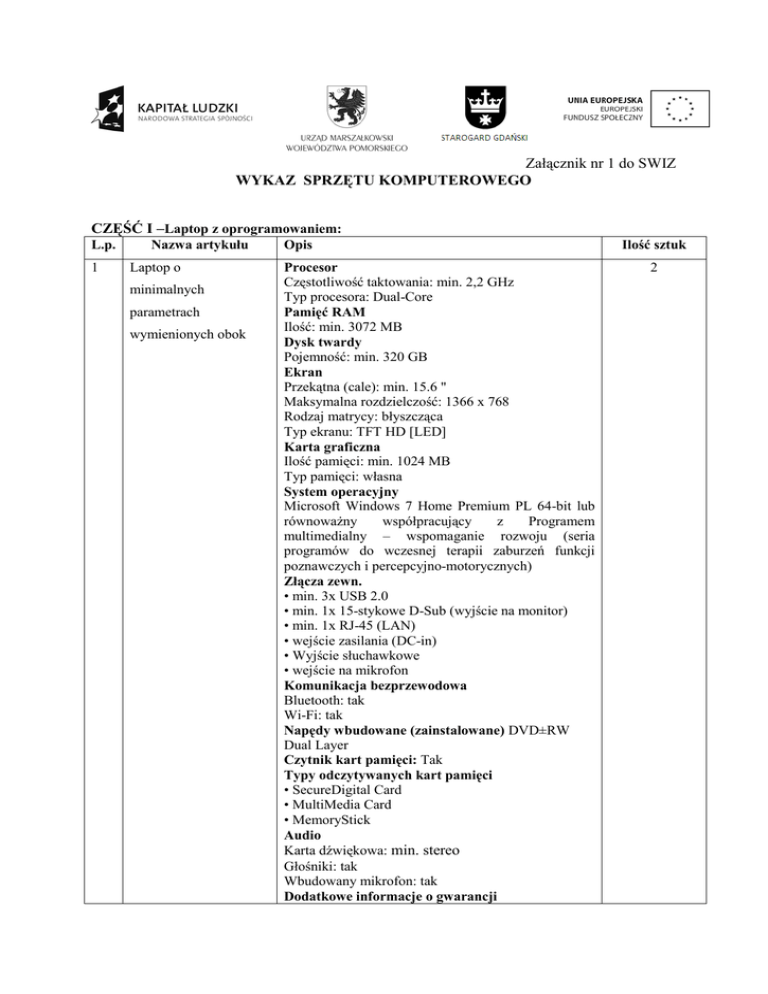 Załącznik nr 1 do SWIZ WYKAZ SPRZĘTU KOMPUTEROWEGO CZĘŚĆ I –Laptop z oprogramowaniem: L.p. 1 Nazwa artykułu Laptop o minimalnych parametrach wymienionych obok Opis Procesor Częstotliwość taktowania: min. 2,2 GHz Typ procesora: Dual-Core Pamięć RAM Ilość: min. 3072 MB Dysk twardy Pojemność: min. 320 GB Ekran Przekątna (cale): min. 15.6 " Maksymalna rozdzielczość: 1366 x 768 Rodzaj matrycy: błyszcząca Typ ekranu: TFT HD [LED] Karta graficzna Ilość pamięci: min. 1024 MB Typ pamięci: własna System operacyjny Microsoft Windows 7 Home Premium PL 64-bit lub równoważny współpracujący z Programem multimedialny – wspomaganie rozwoju (seria programów do wczesnej terapii zaburzeń funkcji poznawczych i percepcyjno-motorycznych) Złącza zewn. • min. 3x USB 2.0 • min. 1x 15-stykowe D-Sub (wyjście na monitor) • min. 1x RJ-45 (LAN) • wejście zasilania (DC-in) • Wyjście słuchawkowe • wejście na mikrofon Komunikacja bezprzewodowa Bluetooth: tak Wi-Fi: tak Napędy wbudowane (zainstalowane) DVD±RW Dual Layer Czytnik kart pamięci: Tak Typy odczytywanych kart pamięci • SecureDigital Card • MultiMedia Card • MemoryStick Audio Karta dźwiękowa: min. stereo Głośniki: tak Wbudowany mikrofon: tak Dodatkowe informacje o gwarancji Ilość sztuk 2 2 lata / door-to door/ Dodatkowe informacje Zintegrowana kamera Urządzenia wskazujące Touchpad Mysz Torba na laptopa Dokumentacja techniczna CZĘŚĆ II –Rzutnik multimedialny L.p. Nazwa artykułu Opis 1 Rzutnik o minimalnych parametrach wymienionych obok Jasność: 2200 ANSI Lumenów w trybie pełnej jasności Rozdzielczość podstawowa: XGA 1024x768 Podstawowy format obrazu: 4:3 Technologia: LCD Kontrast: 500:1 Żywotność lampy: 4000 godzin w trybie ekonomicznym Stosunek odległości do szerokości obrazu: 1,5 - 1,8:1 Głośnik: 1W mono Wejście audio: 1 x miniJack Wyjście audio: 1 x miniJack Wejście komputerowe analogowe: 1 x 15-pin Mini Dsub Wyjście komputerowe analogowe: 1 x 15-pin Mini Dsub Wejścia Video: 1 x Composite 1 x S-video: 1 x Component (współdzielone z Dsub) USB typ B: nie RS-232C: nie Waga: 2,2kg Wymiary: 310x80x225mm Poziom hałasu: 35dB w trybie pełnej jasności Korekcja efektu trapezowego: Automatyczna w pionie +/-30 stopni Przycisk na obudowie projektora któremu można przypisać dowolną funkcję: Tak Wydmuchiwanie ciepłego powietrza: Do przodu Obiektyw: Ręczna regulacja Zoom, Ręczna regulacja ostrości Czujnik zmiany położenia: Tak Szablony obrazów zapisane w pamięci projektora: Linie, kratki Możliwość zmiany nazw źródeł sygnału z poziomu menu: Tak Gwarancja producenta na projektor: 36 miesięcy Gwarancja producenta na lampę: 36 miesięcy Ilość sztuk 2