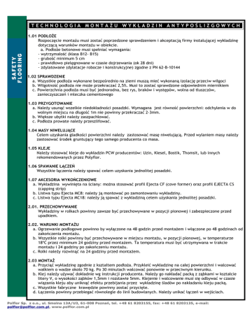 TECHNOLOGIA MONTAŻU WYKŁADZIN ANTYPOŚLIZGOWYCH 1.01 PODŁOŻE Rozpoczęcie montażu musi zostać poprzedzone sprawdzeniem i akceptacją firmy instalującej wykładzinę dotyczącą warunków montażu w obiekcie. a. Podłoże betonowe musi spełniać wymagania: - wytrzymałość (klasa B12- B15) - grubość minimum 5 cm - prawidłowo pielęgnowane w czasie dojrzewania (ok 28 dni) - zdylatowane (dylatacje robocze i konstrukcyjne) zgodne z PN 62-B-10144 – – – – 1.02 SPRAWDZENIE a. Wszystkie podłoża wykonane bezpośrednio na ziemi muszą mieć wykonaną izolację przeciw wilgoci b. Wilgotność podłoża nie może przekraczać 2,5%. Musi to zostać sprawdzone odpowiednim miernikiem c. Powierzchnia podłoża musi być jednorodna, bez rys, braków i występów, wolna od tłuszczów, zanieczyszczeń i mleczka cementowego 1.03 PRZYGOTOWANIE a. Należy usunąć wszelkie niedokładności posadzki. Wymagana jest równość powierzchni: odchylenia w do wolnym miejscu na długość 1m nie powinny przekraczać 2-3mm. b. Większe ubytki należy zaszpachlować. c. Podłoża prowate należy przeszlifować. 1.04 MASY NIWELUJĄCE Celem uzyskania gładkości powierzchni należy zastosować masę niwelującą. Przed wylaniem masy należy zastosować środek gruntujący tego samego producenta co masa. 1.05 KLEJE Należy stosować kleje do wykładzin PCW producentów: Uzin, Kiesel, Bostik, Thomsit, lub innych rekomendowanych przez Polyflor. 1.06 SPAWANIE ŁĄCZEŃ Wszystkie łączenia należy spawać celem uzyskania jednolitej posadzki. 1.07 AKCESORIA WYKOŃCZENIOWE a. Wykładzina wywinięta na ściany: można stosować profil Ejecta CF (cove former) oraz profil EJECTA CS (capping strip) b. Listwa typu Ejecta MC8: należy ją montować po zamontowaniu wykładziny. c. Listwa typu Ejecta MC18: należy ją spawać z wykładziną celem uzyskania jednolitej posadzki. 2.01. PRZECHOWYWANIE Wykładziny w rolkach powinny zawsze być przechowywane w pozycji pionowej i zabezpieczone przed upadkiem. 2.02. WARUNKI MONTAŻU a. Ogrzewanie podłogowe powinno by wyłączone na 48 godzin przed montażem i włączone po 48 godzinach od zakończenia montażu. b. Wszystkie rolki powinny być przechowywane w miejscu montażu, w pozycji pionowej, w temperaturze 18ºC przez minimum 24 godziny przed montażem. Ta temperatura musi być utrzymywana w trakcie montażu i 24 godziny po zakończeniu montażu. c. Rolki należy rozwinąć na 24 godziny przed montażem. 2.03 MONTAŻ a. Przyciąć wykładzinę zgodnie z kształtem podłoża. Przykleić wykładzinę na całej powierzchni i walcować wałkiem o wadze około 70 kg. Po 30 minutach walcować ponownie w przeciwnym kierunku. b. Klej należy używać dokładnie wg instrukcji producenta. Należy go nakładać packą z ząbkami w kształcie litery V, o wysokości ząbków 1,5mm i rozstawie 5mm. Klejenie i walcowanie musi się odbywać w czasie wiązania kleju aby uniknąć efektu przebijania przez wykładzinę śladów po nakładaniu kleju packą. c. Wszystkie fabryczne krawędzie powinny zostać przycięte. d. Łączenia powinny przebiegać równolegle do linii budowlanych. Należy unikać łączeń w wejściach. Polflor Sp. z o.o., ul. Smolna 13A/U3, 61-008 Poznań, tel. +48 61 8203155, fax: +48 61 8203135, e-mail: [email protected], www.polflor.com.pl TECHNOLOGIA MONTAŻU WYKŁADZIN ANTYPOŚLIZGOWYCH e. Wszystkie łączenia należy frezować na 2/3 grubości a następnie spawać sznurem Ejecta weld rod. Po spawaniu ściąć nadmiar sznura: zgrubienie po spawaniu, dokładnie po wystygnięciu. f. Przy wywijaniu wykładzin na ściany należy używać profili Ejecta CF (cove former). Do klejenia powierzchni pionowych należy używać klejów kontaktowych. Wszystkie łączenia pionowe należy spawać. 3.01 ZAKOŃCZENIE MONTAŻU Zamieść i odkurzyć wykładzinę. Usunąć wszystkie zabrudzenia i klej z wykładziny po 24 godzinach od zakończenia montażu używając środka Bendurol Forte firmy Henkel- Ecolab (wg instrukcji producenta). Większe zabrudzenia doczyścić padami ściernymi tej samej firmy. Spłukać czystą wodą i odczekać do wyschnięcia. Usunąć nadmiar wody, który może uszkodzić klej. 3.02 ZABEZPIECZENIE Oddanie do użytku powinno nastąpić nie wcześniej niż po 48 godzinach od zakończenia instalacji. 3.03 ODPAD Odpad o wielkości 4m² powinien być przekazany klientowi na ewentualne naprawy. 3.04. KONSERWACJA Wykładzinę należy czyścić i konserwować wg dokumentu „Utrzymanie w Czystości i Konserwacja Obiektowych Wykładzin Polyflor”. Polflor Sp. z o.o., ul. Smolna 13A/U3, 61-008 Poznań, tel. +48 61 8203155, fax: +48 61 8203135, e-mail: [email protected], www.polflor.com.pl