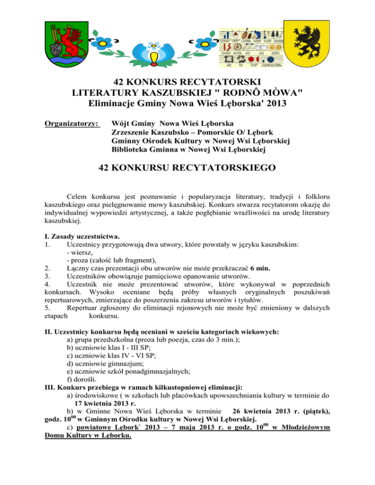 42 KONKURS RECYTATORSKI LITERATURY KASZUBSKIEJ " RODNÔ MÒWA" Eliminacje Gminy Nowa Wieś Lęborska' 2013 Organizatorzy: Wójt Gminy Nowa Wieś Lęborska Zrzeszenie Kaszubsko – Pomorskie O/ Lębork Gminny Ośrodek Kultury w Nowej Wsi Lęborskiej Biblioteka Gminna w Nowej Wsi Lęborskiej 42 KONKURSU RECYTATORSKIEGO Celem konkursu jest poznawanie i popularyzacja literatury, tradycji i folkloru kaszubskiego oraz pielęgnowanie mowy kaszubskiej. Konkurs stwarza recytatorom okazję do indywidualnej wypowiedzi artystycznej, a także pogłębianie wrażliwości na urodę literatury kaszubskiej. I. Zasady uczestnictwa. 1. Uczestnicy przygotowują dwa utwory, które powstały w języku kaszubskim: - wiersz, - proza (całość lub fragment), 2. Łączny czas prezentacji obu utworów nie może przekraczać 6 min. 3. Uczestników obowiązuje pamięciowe opanowanie utworów. 4. Uczestnik nie może prezentować utworów, które wykonywał w poprzednich konkursach. Wysoko oceniane będą próby własnych oryginalnych poszukiwań repertuarowych, zmierzające do poszerzenia zakresu utworów i tytułów. 5. Repertuar zgłoszony do eliminacji rejonowych nie może być zmieniony w dalszych etapach konkursu. II. Uczestnicy konkursu będą oceniani w sześciu kategoriach wiekowych: a) grupa przedszkolna (proza lub poezja, czas do 3 min.); b) uczniowie klas I - III SP; c) uczniowie klas IV - VI SP; d) uczniowie gimnazjum; e) uczniowie szkół ponadgimnazjalnych; f) dorośli. III. Konkurs przebiega w ramach kilkustopniowej eliminacji: a) środowiskowe ( w szkołach lub placówkach upowszechniania kultury w terminie do 17 kwietnia 2013 r. b) w Gminne Nowa Wieś Lęborska w terminie 26 kwietnia 2013 r. (piątek), godz. 1000 w Gminnym Ośrodku kultury w Nowej Wsi Lęborskiej. c) powiatowe Lębork` 2013 – 7 maja 2013 r. o godz. 1000 w Młodzieżowym Domu Kultury w Lęborku. d) Turniej Finałowy w Chmielnie w dniach 25 - 26 maja 2013 r. IV. Eliminacje gminne mają na celu wyłonienie reprezentacji do turnieju powiatowego. Ilość startujących w eliminacjach gminnych z eliminacji szkolnych i środowiskowych ustalone są przez organizatorów konkursu gminnego. V. Organizator eliminacji powiatowych w uzgodnieniu z organizatorami gminnymi ustalają ilość startujących w eliminacjach powiatowych. VI. Komisja eliminacji powiatowych typuje do udziału w Turnieju Finałowym po jednym recytatorze z każdej kategorii wiekowej. Limit miejsc nie może być przenoszony na inne kategorie. Pierwsze miejsca ex quo nie będą uwzględniane. VII. Komisje oceniające wszystkich szczebli dokonują oceny, uwzględniając następujące kryteria: - dobór repertuaru; - interpretacja utworów; - kultura słowa; - ogólny wyraz artystyczny prezentacji. VIII. Laureaci otrzymują: a) w eliminacjach środowiskowych - nagrody rzeczowe ufundowane przez organizatorów eliminacji, b) w eliminacjach gminnych - nagrody rzeczowe ufundowane przez organizatorów eliminacji, c) w eliminacjach powiatowych - nagrody i dyplomy przygotowane przez organizatorów eliminacji, d) w Turnieju Finałowym - nagrody rzeczowe i dyplomy. IX. Koszty uczestnictwa w eliminacjach środowiskowych, gminnych i powiatowych recytatorów pokrywają instytucje delegujące. Organizatorzy Turnieju Finałowego pokrywają koszty pobytu uczestników finału i ich opiekunów oraz koszty organizacyjne. X. Organizatorzy dopuszczą do Turnieju Gminnego laureatów konkursu Środowiskowego odbywającego się na terenie Gminy Nowej Wsi Lęborskiej. XI. Gminny Ośrodek Kultury powołuje Komisję Oceniającą Eliminacje, której decyzje są ostateczne. XII. W sprawach nie objętych regulaminem decyzje podejmują i informacji udzielą: - Krzysztof Pruszak – Dyrektor Gminnego Ośrodka Kultury w Nowej Wsi Lęborskiej, tel. (059) 8612 253, e-mail: [email protected] - Stanisława Dawidowicz –tel. (059) 8612 253 Adres do korespondencji: Gminny Ośrodek Kultury ul. Lęborska 20 84 -351 Nowa Wieś Lęborska Karta uczestnika 42 Konkursu Recytatorskiego Literatury Kaszubskiej" RODNO MOWA" Eliminacje Gminy Nowa Wieś Lęborska' 2013 26 kwietnia 2013 r. godz. 1000 Zgłaszam swój udział do konkursu 1. Imię i nazwisko ………………………………………………………………………… 2. Data urodzenia …………………………………………………………………………. 3. Kategoria wiekowa …………………………………………………………………….. 4. Miejsce zamieszkania ………………………………………………………………….. 5. Instytucja macierzysta (szkoła lub placówka) tel. e-mail: …………………………….. ………………………………………………………………………………………….. ………………………………………………………………………………………….. 6. Utwory przygotowane na konkurs Poezja autor …………………………………………………………………………… tytuł ……………………………………………………………………………. Proza autor ……………………………………………………………………………. tytuł …………………………………………………………………………….. 7. Imię i nazwisko nauczyciela lub instruktora …………………………………………………………………………………………... 8. Telefon kontaktowy lub adres e-mail …………………………………………….……... ………………………………………………… Data i pieczęć placówki ……………………… /pieczątka instytucji/ ………………………………………………… podpis uczestnika ………………………………… /miejscowość, data/ Protokół eliminacji gminnych / miejskich w ramach 42 Konkursu Recytatorskiego Literatury Kaszubskiej "RODNO MOWA" 2013 Komisja Konkursowa w skła