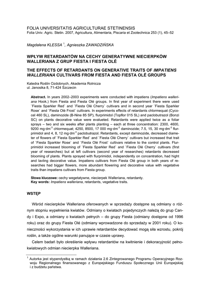 FOLIA UNIVERSITATIS AGRICULTURAE STETINENSIS Folia Univ. Agric. Stetin. 2007, Agricultura, Alimentaria, Piscaria et Zootechnica 253 (1), 45–52 Magdalena KLESSA 1, Agnieszka ZAWADZIŃSKA WPŁYW RETARDANTÓW NA CECHY GENERATYWNE NIECIERPKÓW WALLERIANA Z GRUP FIESTA I FIESTA OLÉ THE EFFECTS OF RETARDANTS ON GENERATIVE TRAITS OF IMPATIENS WALLERIANA CULTIVARS FROM FIESTA AND FIESTA OLÉ GROUPS Katedra Roślin Ozdobnych, Akademia Rolnicza ul. Janosika 8, 71-424 Szczecin Abstract. In years 2002–2003 experiments were conducted with impatiens (Impatiens walleriana Hook.) from Fiesta and Fiesta Olé groups. In first year of experiment there were used `Fiesta Sparkler Red` and `Fiesta Olé Cherry` cultivars and in second year `Fiesta Sparkler Rose` and `Fiesta Olé Frost` cultivars. In experiments effects of retardants chlormequat (Cycocel 460 SL), daminozide (B-Nine 85 SP), flurprimidol (Topflor 015 SL) and paclobutrazol (Bonzi SC) on plants decorative value were evalueted. Retardants were applied twice as a foliar sprays – two and six weeks after plants planting – each at three concentration: 2300, 4600, -3 -3 -3 9200 mg·dm chlormequat; 4250, 8500, 17 000 mg·dm daminozide; 7.5, 15, 30 mg·dm flur-3 primidol and 4, 8, 12 mg·dm paclobutrazol. Retardants, except daminozide, decreased diameter of flowers of `Fiesta Sparkler Red` and `Fiesta Olé Cherry` cultivars but increased that trait of `Fiesta Sparkler Rose` and `Fiesta Olé Frost` cultivars relative to the control plants. Flurprimidol increased blooming of `Fiesta Sparkler Red` and `Fiesta Olé Cherry` cultivars (first year of researches) but at left cultivars (second year of researches) retardants decreased blooming of plants. Plants sprayed with flurprimidol, independently on concentration, had hight and lavling decorative value. Impatiens cultivars from Fiesta Olé group in both years of researches had bigger flowers, more abundant flowering and decorative value with vegetative traits than impatiens cultivars from Fiesta group. Słowa kluczowe: cechy wegetatywne, niecierpek Walleriana, retardanty. Key words: Impatiens walleriana, retardants, vegetative traits. WSTĘP Wśród niecierpków Walleriana oferowanych w sprzedaży dostępne są odmiany o różnym stopniu wypełnienia kwiatów. Odmiany o kwiatach pojedynczych należą do grup Candy i Expo, a odmiany o kwiatach pełnych – do grupy Fiesta (odmiany dostępne od 1996 roku) oraz do grupy Fiesta Olé (odmiany wprowadzone do sprzedaży w 2001 roku). O konieczności wykorzystania w ich uprawie retardantów decydować mogą siła wzrostu, pokrój roślin, a także ogólne warunki panujące w czasie uprawy. Celem badań było określenie wpływu retardantów na kwitnienie i dekoracyjność pełnokwiatowych odmian niecierpka Walleriana. 1 Autorka jest stypendystką w ramach działania 2.6 Zintegrowanego Programu Operacyjnego Rozwoju Regionalnego finansowanego z Europejskiego Funduszu Społecznego Unii Europejskiej i z budżetu państwa. 46 M. Klessa i A. Zawadzińska MATERIAŁ I METODY Przeprowadzono dwuletnie badania z następującymi odmianami niecierpka Walleriana (Impatiens walleriana Hook.) z grup Fiesta i Fiesta Olé: w doświadczeniu I (w roku 2002) materiał roślinny stanowiły odmiany `Fiesta Sparkler Red` i `Fiesta Olé Cherry`, w doświadczeniu II (w roku 2003) – `Fiesta Sparkler Rose` i `Fiesta Olé Frost`. Oceniano wpływ retardantów chloromekwat (Cycocel 460 SL), daminozyd (B-Nine 85 SP), fluropirimidol (Topflor 015 SL) i paklobutrazol (Bonzi SC) na wartość dekoracyjną roślin. Retardanty stosowano dwukrotnie – 2 i 6 tygodni po posadzeniu roślin w następujących stężeniach: 2300, 4600 i 9200 mg·dm-3 chloromekwatu; 4250, 8500 i 17 000 mg·dm-3 daminozydu; 7,5, 15 i 30 mg·dm-3 fluropirimidolu; 4, 8, 12 mg·dm-3 paklobutrazolu. Kontrolę stanowiły rośliny nieopryskiwane retardantami. Sadzonki niecierpków posadzono w pierwszej połowie kwietnia do doniczek, o średnicy 10 cm i pojemności 0,45 dm3, w których rosły do początku lipca. Podłoże dla roślin stanowił torf wysoki Kronen, odkwaszony do pH 6,2, z dodatkiem 5 g·dm-3 Osmocote Plus 5/6 (15+10+12). Szczegółową metodykę doświadczeń przedstawiono w I części pracy. W trakcie doświadczeń od początku kwitnienia (trzeciej dekady maja) liczono kwiaty, usuwając je co dwa tygodnie. W pełni kwitnienia (1.07) zmierzono średnicę kwiatów i wykonano ocenę bonitacyjną w skali 9-stopniowej, uwzględniając zarówno cechy wegetatywne, jak i generatywne roślin. Średnicę kwiatów, średnią liczbę kwiatów na roślinie w pełni kwitnienia (pomiary wykonano 2.07.2002 roku i 3.07.2003 roku) oraz ogólną ich liczbę zweryfikowano statystycznie za pomocą analizy wariancji, przy poziomie istotności α=0,05, oraz za pomocą testu Tukeya i przedstawiono w tab. 1–3. W tabeli 4 przedstawiono średnie z wyników pomiarów cech morfologicznych dla poszczególnych grup hodowlanych, a ocenę bonitacyjną – na rys. 1, 2. WYNIKI Jak wynika z analizy statystycznej (tab. 1), w pierwszym roku badań tylko daminozyd u obydwu badanych odmian nie powodował zmniejszenia średnicy kwiatów. Po opryskiwaniu pozostałymi retardantami średnica kwiatów była mniejsza o 4–12% od roślin kontrolnych, nieopryskiwanych żadnym retardantem. W drugim roku doświadczeń każdy z retardantów powodował zwiększenie średnicy kwiatów. Odmiany reagowały jednak różnie – rośliny odmiany `Fiesta Sparkler Rose` nie różniły się średnicą kwiatów, rośliny `Fiesta Olé Frost` największe kwiaty miały po opryskiwaniu chloromekwatem w stężeniu 2300 mg·dm-3 najmniejsze – u roślin kontrolnych, a także po opryskiwaniu chloromekwatem w stężeniu 9200 mg·dm-3 i fluropirimidolem w stężeniu 7,5 mg·dm-3. Większą średnicę kwiatów w pierwszym roku badań miała odmiana `Fiesta Olé Cherry` niż `Fiesta Sparkler Red`, w drugim – `Fiesta Olé Frost` niż `Fiesta Sparkler Rose`. Ogólnie odmiany z g
