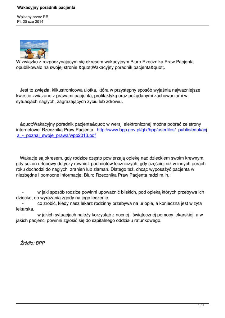 Wakacyjny poradnik pacjenta Wpisany przez RR Pt, 20 cze 2014 W związku z rozpoczynającym się okresem wakacyjnym Biuro Rzecznika Praw Pacjenta opublikowało na swojej stronie "Wakacyjny poradnik pacjenta". Jest to zwięzła, kilkustronicowa ulotka, która w przystępny sposób wyjaśnia najważniejsze kwestie związane z prawami pacjenta, profilaktyką oraz pożądanymi zachowaniami w sytuacjach nagłych, zagrażających życiu lub zdrowiu. "Wakacyjny poradnik pacjenta" w wersji elektronicznej można pobrać ze strony internetowej Rzecznika Praw Pacjenta: http://www.bpp.gov.pl/gfx/bpp/userfiles/_public/edukacj a_-_poznaj_swoje_prawa/wpp2013.pdf Wakacje są okresem, gdy rodzice często powierzają opiekę nad dzieckiem swoim krewnym, gdy sezon urlopowy dotyczy również podmiotów leczniczych, gdy częściej niż w innych porach roku dochodzi do nagłych zranień lub złamań. Dlatego też, chcąc wyposażyć pacjenta w niezbędne i pomocne informacje, Biuro Rzecznika Praw Pacjenta radzi m.in.: w jaki sposób rodzice powinni upoważnić bliskich, pod opieką których przebywa ich dziecko, do wyrażania zgody na jego leczenie, co zrobić, kiedy nasz lekarz rodzinny przebywa na urlopie, a konieczna jest wizyta lekarska, w jakich sytuacjach należy korzystać z nocnej i świątecznej pomocy lekarskiej, a w jakich pacjenci powinni zgłosić się do szpitalnego oddziału ratunkowego. Źródło: BPP 1/1