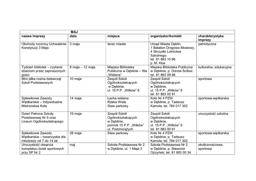 MAJ nazwa imprezy data miejsce organizator/kontakt