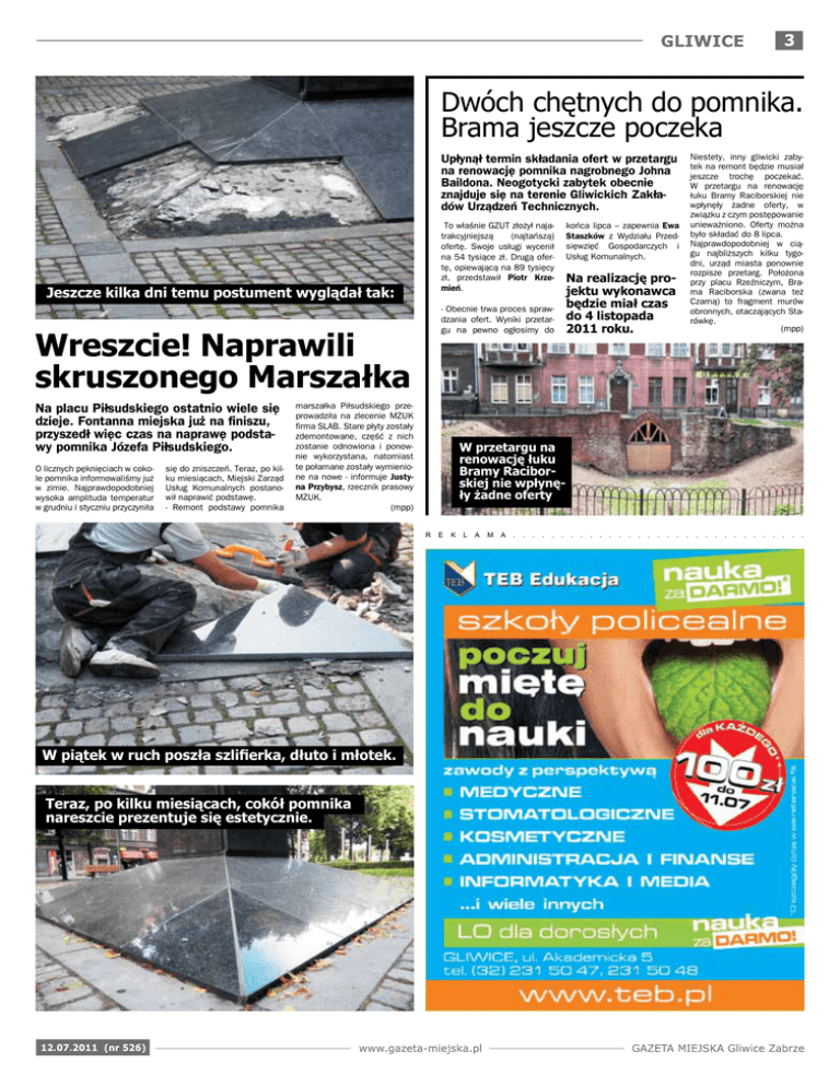 Dwóch chętnych do pomnika. Brama jeszcze poczeka Upłynął termin składania ofert w przetargu na renowację pomnika nagrobnego Johna Baildona. Neogotycki zabytek obecnie znajduje się na terenie Gliwickich Zakładów Urządzeń Technicznych. O licznych pęknięciach w cokole pomnika informowaliśmy już w zimie. Najprawdopodobniej wysoka amplituda temperatur w grudniu i styczniu przyczyniła się do zniszczeń. Teraz, po kilku miesiącach, Miejski Zarząd Usług Komunalnych postanowił naprawić podstawę. - Remont podstawy pomnika marszałka Piłsudskiego przeprowadziła na zlecenie MZUK firma SLAB. Stare płyty zostały zdemontowane, część z nich zostanie odnowiona i ponownie wykorzystana, natomiast te połamane zostały wymienione na nowe - informuje Justyna Przybysz, rzecznik prasowy MZUK. (mpp) W przetargu na renowację łuku Bramy Raciborskiej nie wpłynęły żadne oferty R W piątek w ruch poszła szlifierka, dłuto i młotek. Teraz, po kilku miesiącach, cokół pomnika nareszcie prezentuje się estetycznie. Na realizację projektu wykonawca będzie miał czas do 4 listopada 2011 roku. - Obecnie trwa proces sprawdzania ofert. Wyniki przetargu na pewno ogłosimy do Wreszcie! Naprawili skruszonego Marszałka Na placu Piłsudskiego ostatnio wiele się dzieje. Fontanna miejska już na finiszu, przyszedł więc czas na naprawę podstawy pomnika Józefa Piłsudskiego. końca lipca – zapewnia Ewa Staszków z Wydziału Przedsięwzięć Gospodarczych i Usług Komunalnych. To właśnie GZUT złożył najatrakcyjniejszą (najtańszą) ofertę. Swoje usługi wycenił na 54 tysiące zł. Drugą ofertę, opiewającą na 89 tysięcy zł, przedstawił Piotr Krzemień. Jeszcze kilka dni temu postument wyglądał tak: Niestety, inny gliwicki zabytek na remont będzie musiał jeszcze trochę poczekać. W przetargu na renowację łuku Bramy Raciborskiej nie wpłynęły żadne oferty, w związku z czym postępowanie unieważniono. Oferty można było składać do 8 lipca. Najprawdopodobniej w ciągu najbliższych kilku tygodni, urząd miasta ponownie rozpisze przetarg. Położona przy placu Rzeźniczym, Brama Raciborska (zwana też Czarną) to fragment murów obronnych, otaczających Starówkę. (mpp) E K L A M A . . . . . . . . . . . . . . . . . . . . . . . . . . . . . . .