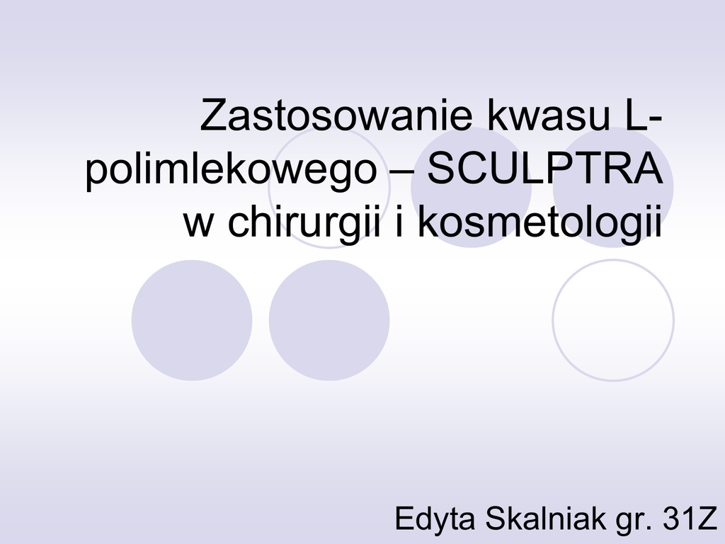 Zastosowanie kwasu Lpolimlekowego – SCULPTRA w chirurgii i kosmetologii Edyta Skalniak gr. 31Z Co to jest Sculptra ? Sculptra jest preparatem medycznym przeznaczonym do wstrzyknięć zawierającym mikrocząsteczki kwasu L-polimlekowego , który jest naturalnym budulcem naszych tkanek. Jest to zatem preparat bezpieczny, którego nasza skóra nie potraktuje jako ciało obce, gdyż podlega on naturalnym procesom biodegradacji w skórze. O jego wysokim profilu bezpieczeństwa świadczy fakt, że kwas Lpolikmelkowy jest od 30 lat wykorzystywany w medycynie do produkcji implantów i szwów. Działa stopniowo, pobudzając skórę do samodzielnej produkcji kolagenu. W jakim celu się go stosuje ? Z upływem czasu skóra traci swój jędrny i młody wygląd. Tkanka tłuszczowa ulega zanikowi, sprawiając, że twarz staje się wychudzona co dodatkowo ją postarza. Skóra staje się coraz cieńsza co prowadzi do pojawienia się zmarszczek i bruzd. Preparat Sculptra wygładza głębokie bruzdy i zmarszczki ponadto przywraca utraconą objętość twarzy będące następstwem procesu starzenia. Sculptra służy do bez operacyjnego liftingu twarzy. Efektem działania substancji jest stymulacja fibroblastów i produkcja własnego kolagenu, który uzupełnia niedobory w skórze. Zapewnia to naturalnie wyglądający efekt. Preparat działa stopniowo przywracając to co zostało utracone. Efekty leczenia mogą utrzymywać się przez ponad 2 lata. Zastosowanie preparatu : Preparat Sculptra można stosować do korekcji różnych partii twarzy: zmarszczek nosowo – wargowych, bruzd w kącikach ust (zmarszczek marionetkowych), zapadniętych policzków, zmarszczek na policzkach i podbródku, okolic kości policzkowych Schemat działania preparatu Sculptra : POD ISTNIEJĄCE ZAGŁĘBIENIE SKÓRY, ZMARSZCZKĘ LUB BRUZDĘ (1) WSTRZYKIWANY JEST KWAS POLIMLEKOWY (2). POCZĄTKOWY EFEKT WYPEŁNIENIA JEST ZWIĄZANY Z OBECNOŚCIĄ W ROZTWORZE WODY ORAZ DELIKATNYM OBRZĘKIEM TKANEK. WSTRZYKNIĘTY KWAS POLIMLEKOWY STYMULUJE FIBROBLASTY DO PRODUKCJI KOLAGENU (3). W WYNIKU TEGO ZAGŁĘBIENIE ULEGA SPŁYCENIU (4), UZYSKUJEMY EFEKT KOSMETYCZNY. Zdjęcia przed i po zabiegu : Przeciwskazania do zabiegu : ciąża i okres karmienia, zmiany zapalne w obrębie skóry, skłonność do występowania blizn przerostowych. Efekty Rezultaty działania preparatu Sculptra nie są natychmiastowe. Pojawiają się w czasie całej serii i związane są z naturalnym pobudzeniem fibroblastów i stopniową odbudową nowych włókien kolagenowych. Sculptra nadaje pełniejsze kontury twarzy, naturalny efekt odmłodzenia, działa długotrwale. Bibliografia http://www.klinikasfera.pl/sculptra http://www.dermamed.com.pl/SCULPTRA_( kwas_polimlekowy)_a101.html http://ona.juwena.pl/sculptra.html