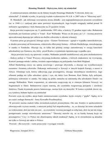 Henning Mankell - Mężczyzna, który się uśmiechał Z zainteresowaniem zabrałam się do lektury książki Henninga Mankella "Człowiek, który się uśmiechał". Z okładki wynika, że pozycję wydało wydawnictwo W.A.B. w 2007 roku w "Mrocznej serii". H. Mannkell - jak informuje wewnętrzna strona okładki - jest najpopularniejszym pisarzem szwedzkim (ur. w 1948 r.) i zasłynął jako autor powieści kryminalnych. Jego książki osiągnęły nakład ponad 16 milionów egzemplarzy i były tłumaczone na 25 języków świata. Akcja powieści rozpoczyna się 11 października 1993 roku, a kończy 23 grudnia tegoż roku. Bohaterem kryminału jest komisarz policji w Ystad - Kurt Wallander. Wraca on do pracy po 1,5 - rocznej przerwie spowodowanej depresją (po zabiciu na służbie człowieka w obronie własnej). O pomoc prosi go przyjaciel, którego ojciec - Gustaw Torstenssen - zginął w wypadku samochodowym, w drodze powrotnej od biznesmsna, właściciela olbrzymiej fortuny - Alfreda Harderberga, mieszkującego w zamku w Farnholm. Okazuje się, że kilka dni później zostaje zamordowany w swojej kancelarii adwokackiej syn Gustawa, ten, który prosił Kurta o wyjaśnienie tajemniczego wypadku ojca. Akcja powieści toczy się sprawnie i wartko, Wallander potrafił zmobilizować cały pion dochodzeniowo - śledczy policji w Ystad. Wszyscy otrzymują konkretne zadania, z których znakomicie się wywiązują. Kurtowi pomaga młoda i zdolna, świetnie zapowiadająca się policjantka Ann-Britt Höglund. Alfred Harderberg cieszy się opinią uczciwego i prawego obywatela, a okazuje się wyrafinowanym oszustem i kreaturą człowieka. Dokonuje malwersacji w Szwecji w innych krajach Europy, a nawet w Afryce. Eliminuje tych, którzy odkrywają jego przestępstwa, zlecając skrytobójcze morderstwa. Jego ofiarami padają nie tylko adwokaci ojciec i syn, ale także Lars Borman, Kurt Ström, były policjant, późniejszy ochroniarz w zamku. Nie udają się próby zamachu na sekretarkę obu adwokatów Dunër i na samego Wallandera. Warto wspomnieć, że zdarzenia rozgrywają się w zimnym klimacie Szwecji, we fragmentach w Danii. Bohaterowie często marzną, ale czytelnika rozgrzewają perypetie i zawiłości śledztwa. Finału kryminału prawie baśniowego, można było się domyślić. W końcu czytelnik dowie się, czy tytułowy bohater będzie się uśmiechał Powieść czyta się szybko, akcja budzi zainteresowanie czytelnika. Język zwięzły i "giętki". Sądzę, że to po części zasługa tłumaczki - Ireny Kowadło-Przedmojskiej. W powieści można znaleźć kilka stwierdzeń,wartych przemyślenia. Oto one: Kiedyś..w społeczeństwie obowiązywało wyższe morale, a autorytet policji był niepodważalny... to, co dziesięć lat temu uchodziło za wykroczenie, dziś już nim nie jest... za czyn,który wczoraj pociągał za sobą karę, dziś się już nie ściga, postępowanie zostaje niezwłocznie umorzone." "Dawniej mówiło się, że za każdą fortuną kryje się przestępstwo." Czy i w Polsce nie obserwujemy takich tendencji? Sądzę, że te stwierdzenia są aktualne nie tylko w Szwecji ale także w Polsce. Powieść - dla rozrywki - warto przeczytać i wyciągać wnioski. Wagrowiec, listopad 2014 r. Elżbieta Muszyńska