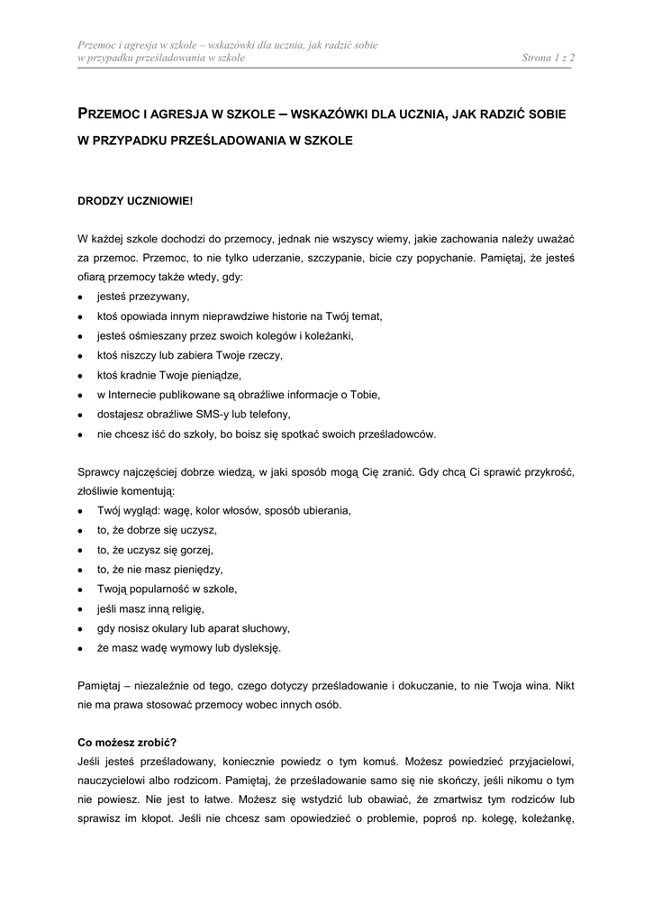 Przemoc i agresja w szkole – wskazówki dla ucznia, jak radzić sobie w przypadku prześladowania w szkole Strona 1 z 2 PRZEMOC I AGRESJA W SZKOLE – WSKAZÓWKI DLA UCZNIA, JAK RADZIĆ SOBIE W PRZYPADKU PRZEŚLADOWANIA W SZKOLE DRODZY UCZNIOWIE! W każdej szkole dochodzi do przemocy, jednak nie wszyscy wiemy, jakie zachowania należy uważać za przemoc. Przemoc, to nie tylko uderzanie, szczypanie, bicie czy popychanie. Pamiętaj, że jesteś ofiarą przemocy także wtedy, gdy: jesteś przezywany, ktoś opowiada innym nieprawdziwe historie na Twój temat, jesteś ośmieszany przez swoich kolegów i koleżanki, ktoś niszczy lub zabiera Twoje rzeczy, ktoś kradnie Twoje pieniądze, w Internecie publikowane są obraźliwe informacje o Tobie, dostajesz obraźliwe SMS-y lub telefony, nie chcesz iść do szkoły, bo boisz się spotkać swoich prześladowców. Sprawcy najczęściej dobrze wiedzą, w jaki sposób mogą Cię zranić. Gdy chcą Ci sprawić przykrość, złośliwie komentują: Twój wygląd: wagę, kolor włosów, sposób ubierania, to, że dobrze się uczysz, to, że uczysz się gorzej, to, że nie masz pieniędzy, Twoją popularność w szkole, jeśli masz inną religię, gdy nosisz okulary lub aparat słuchowy, że masz wadę wymowy lub dysleksję. Pamiętaj – niezależnie od tego, czego dotyczy prześladowanie i dokuczanie, to nie Twoja wina. Nikt nie ma prawa stosować przemocy wobec innych osób. Co możesz zrobić? Jeśli jesteś prześladowany, koniecznie powiedz o tym komuś. Możesz powiedzieć przyjacielowi, nauczycielowi albo rodzicom. Pamiętaj, że prześladowanie samo się nie skończy, jeśli nikomu o tym nie powiesz. Nie jest to łatwe. Możesz się wstydzić lub obawiać, że zmartwisz tym rodziców lub sprawisz im kłopot. Jeśli nie chcesz sam opowiedzieć o problemie, poproś np. kolegę, koleżankę, Przemoc i agresja w szkole – wskazówki dla ucznia, jak radzić sobie w przypadku prześladowania w szkole Strona 2 z 2 rodzeństwo, babcię lub dziadka, aby pomogli Ci o wszystkim opowiedzieć rodzicom. Jeśli zamiast mówić o problemie, wolisz o tym napisać – przygotuj list do rodziców i opisz, jak się czujesz. Pamiętaj, że w szkole zawsze jest Twój wychowawca lub inny nauczyciel, który powinien wiedzieć, jeśli dzieje się coś złego. Spróbuj znaleźć taki moment, kiedy będzie można powiedzieć mu o tym tak, aby nikt się nie zorientował. Możesz np. zostać po lekcji, prosząc o wyjaśnienie jakiegoś tematu. Jeśli masz większe zaufanie do innego nauczyciela lub pracownika szkoły (pedagog lub psycholog szkolny, pielęgniarka), porozmawiaj z wybraną przez Ciebie osobą. Masz prawo do tego, aby czuć się bezpiecznie. Możesz wybrać także inną dorosłą osobę, której ufasz, np. lekarza. Osoba taka powinna znaleźć odpowiedni sposób, aby skontaktować się ze szkołą i Twoimi rodzicami, by Ci pomóc. Jak sobie radzić z prześladowaniem? Sprawcy przemocy najczęściej działają bez świadków i dlatego potrafią przez dłuższy czas unikać konsekwencji. Podczas przerw staraj się przebywać w bezpiecznych miejscach w szkole, gdzie jest wiele innych osób. Sprawcy nie lubią świadków. Jeśli pobiją Cię w szkole, natychmiast powiedz o tym nauczycielowi. Powiedz też rodzicom. Nie staraj się im oddawać – możesz zostać pobity lub wpaść w kłopoty. Bicie to napaść. W trudnej sytuacji zawsze proś o pomoc i wsparcie; nie obawiaj się wołać o pomoc postronnych osób, mówiąc np. „oni mi grożą”. Jeśli spotkasz osoby, które prześladują Cię, staraj się przede wszystkim spokojnie opuścić to miejsce tak szybko, jak to jest możliwe. W kontakcie ze sprawcami przemocy staraj się zachowywać pewnie i spokojnie, patrz im w oczy, stój prosto, unikaj gestów lub min, które mogłyby ich sprowokować. Gdy ktoś zachowuje się wobec Ciebie w sposób, jakiego sobie nie życzysz, powiedz mu o tym jasno i wprost np. „Nie lubię, gdy to robisz. Chcę, żebyś przestał”. Próbuj opierać się, gdy Ci grożą lub namawiają do czegoś, czego nie chcesz zrobić. Stosuj w tym celu technikę „zdartej płyty”, powtarzając przez cały czas jedno zdanie, np. „Nie, nie zrobię tego”. Gdy Ci dokuczają lub przezywają Cię, możesz reagować na to za pomocą jakiegoś zdania, które ma pokazać, że to Cię nie dotyka w sposób, w jaki by chcieli np. „tak? no to co?” lub „możesz tak uważać” czy „to możliwe”.