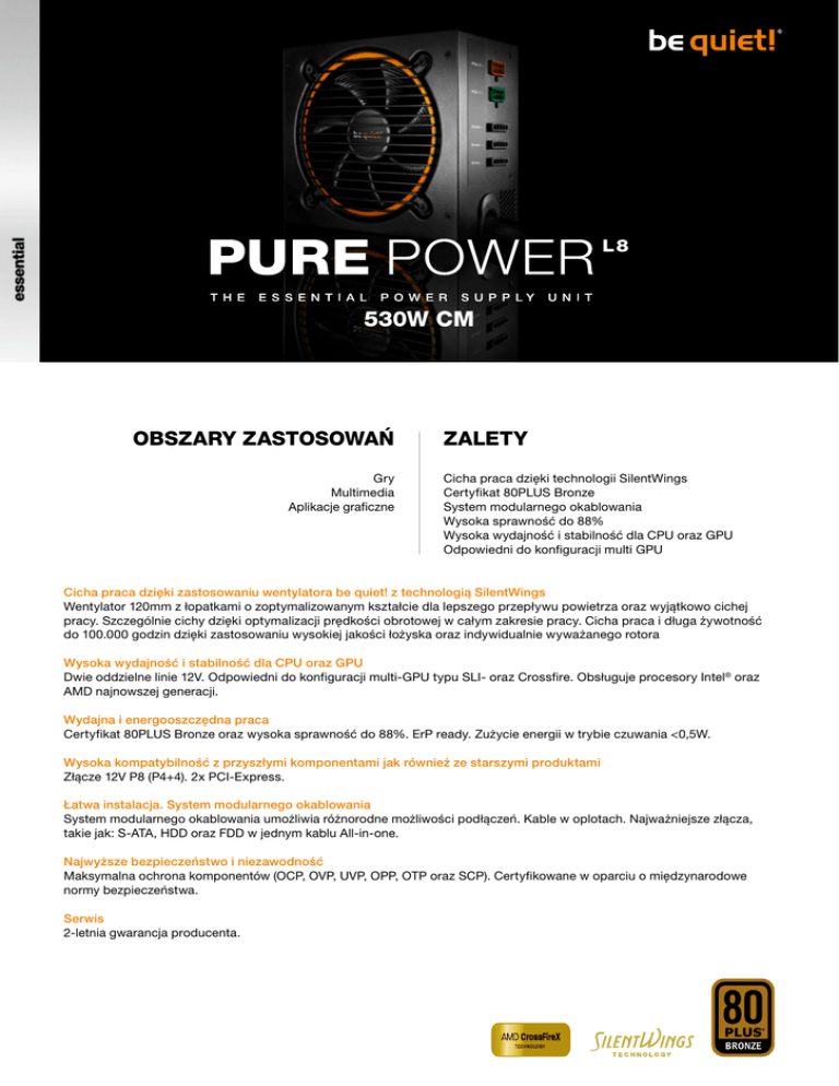 530W 400W CM OBSZARY ZASTOSOWAŃ Gry Multimedia Aplikacje graficzne ZALETY Cicha praca dzięki technologii SilentWings Certyfikat 80PLUS Bronze System modularnego okablowania Wysoka sprawność do 88% Wysoka wydajność i stabilność dla CPU oraz GPU Odpowiedni do konfiguracji multi GPU Cicha praca dzięki zastosowaniu wentylatora be quiet! z technologią SilentWings Wentylator 120mm z łopatkami o zoptymalizowanym kształcie dla lepszego przepływu powietrza oraz wyjątkowo cichej pracy. Szczególnie cichy dzięki optymalizacji prędkości obrotowej w całym zakresie pracy. Cicha praca i długa żywotność do 100.000 godzin dzięki zastosowaniu wysokiej jakości łożyska oraz indywidualnie wyważanego rotora Wysoka wydajność i stabilność dla CPU oraz GPU Dwie oddzielne linie 12V. Odpowiedni do konfiguracji multi-GPU typu SLI- oraz Crossfire. Obsługuje procesory Intel® oraz AMD najnowszej generacji. Wydajna i energooszczędna praca Certyfikat 80PLUS Bronze oraz wysoka sprawność do 88%. ErP ready. Zużycie energii w trybie czuwania <0,5W. Wysoka kompatybilność z przyszłymi komponentami jak również ze starszymi produktami Złącze 12V P8 (P4+4). 2x PCI-Express. Łatwa instalacja. System modularnego okablowania System modularnego okablowania umożliwia różnorodne możliwości podłączeń. Kable w oplotach. Najważniejsze złącza, takie jak: S-ATA, HDD oraz FDD w jednym kablu All-in-one. Najwyższe bezpieczeństwo i niezawodność Maksymalna ochrona komponentów (OCP, OVP, UVP, OPP, OTP oraz SCP). Certyfikowane w oparciu o międzynarodowe normy bezpieczeństwa. Serwis 2-letnia gwarancja producenta. ZŁĄCZA OKABLOWANIE OGÓLNE 530W CM Efektywna moc ciągła (W) 430W 530W 630W 730W Model BN180 BN181 BN182 BN183 Napięcie/ Częstotliwość 100–240Vac / 50–60Hz 100–240Vac / 50–60Hz 100–240Vac / 50–60Hz 100–240Vac / 50–60Hz ATX 12V 2.31 / EPS 12V 2.92 • / – • / • • / • • / • Wymiary (D x S x W mm) 160 x 150 x 86 160 x 150 x 86 160 x 150 x 86 160 x 150 x 86 Wysokiej jakości wentylator 120mm 120mm 120mm 120mm Poziom hałasu przy obciążeniu 0-100%, dB(A) 15-20 15-23 15-25 15-29 Sprawność % (230V) aż do 88% aż do 88% aż do 88% aż do 88% Linie 12V 2 2 2 2 Aktywne PFC • • • • OCP, OVP, UVP, SCP, OPP, OTP • • • • Certyfkaty 80PLUS Bronze 80PLUS Bronze, AMD CrossFireX 80PLUS Bronze, AMD CrossFireX 80PLUS Bronze, AMD CrossFireX Kompatybilne z Energy Star 5.0 • • • • Zgodne z ErP • • • • Żywotność przy 25°C aż do 100.000h aż do 100.000h aż do 100.000h aż do 100.000h Cable management • • • • Liczba kabli 5 7 7 7 Maksymalna długość kabli 90cm 90cm 90cm 90cm Długość kabla ATX 45cm 45cm 45cm 45cm Oploty na kablach • • • • ATX-Mainboard (20+4-pin) 1x 20+4-pin 1x 20+4-pin 1x 20+4-pin 1x 20+4-pin PCI-Express (6-pin/6+2-pin) 1 / 1 0 / 2 2 / 2 2 / 2 Złącze P8/P4 P8 (P4+4) P8 (P4+4) P8 (P4+4) P8 (P4+4) S-ATA (5-pin) 4 5 5 5 IDE (4-pin Molex) 3 4 4 4 FDD (Floppy) 1 1 1 1 Dane wyjściowe Okablowanie i złącza 450mm 150mm 150mm AC Input 150mm 100–240Vac DC Output Max. Current 4-Pin 24-Pin 12V P4-connector 24A 15A Max. Combined Power 20-Pin 50–60Hz 10–5A 3.3V 5V 12V1 12V2 12V3 12V4 –12V 5VSB 28A 20A - - 40A 120W 480W 0.3A 3A 3.6W 15W 530W 12V P8-connector 12V P4-connector S-ATA S-ATA Dane logistyczne HDD FDD HDD S-ATA HDD HDD S-ATA S-ATA PCIe 1 (6+2-Pin) PCIe 2 (6+2-Pin) Model BQT L8-CM-530W Kod produktu BN181 Wymiary opakowania (D x S x W mm) 280 x 105 x 230 Waga z opakowaniem (kg) 2.55 Szt. w op. zbiorczym 6 Waga op. zbiorczego (kg) 16.14 Kod EAN 4260052182475 Cena (€) 99,90 450mm Infolinia: 22 664 80 22 (pon-pt 9:00-17:00) Wersja 08/2011 Nie ponosimy odpowiedzialności za poprawność powyższych danych. Zdjęcie ma charakter poglądowy i może się różnić od produktu. www.be-quiet.pl