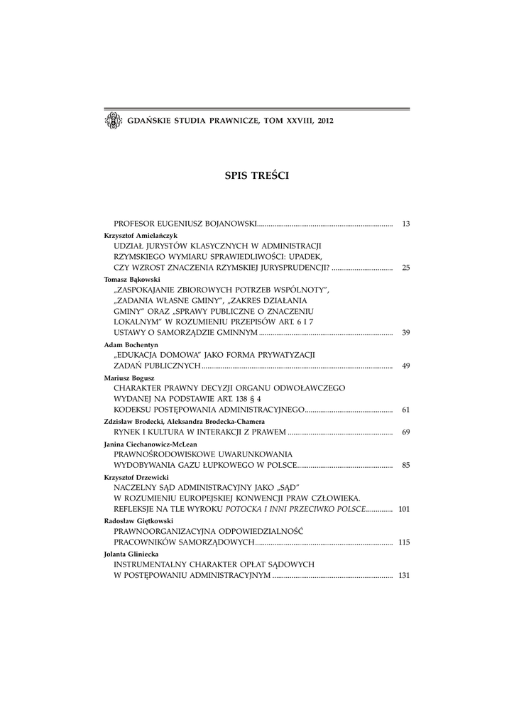 SPIS TREŚCI PROFESOR EUGENIUSZ BOJANOWSKI....................................................................... 13 Krzysztof Amielańczyk UDZIAŁ JURYSTÓW KLASYCZNYCH W ADMINISTRACJI RZYMSKIEGO WYMIARU SPRAWIEDLIWOŚCI: UPADEK, CZY WZROST ZNACZENIA RZYMSKIEJ JURYSPRUDENCJI? ................................ 25 Tomasz Bąkowski „ZASPOKAJANIE ZBIO RO WYCH POTRZEB WSPÓLNOTY”, „ZADANIA WŁASNE GMINY”, „ZAKRES DZIAŁANIA GMINY” ORAZ „SPRAWY PUBLICZNE O ZNACZENIU LOKALNYM” W ROZUMIENIU PRZEPISÓW ART. 6 I 7 USTAWY O SAMORZĄDZIE GMINNYM ...................................................................... 39 Adam Bochentyn „EDUKACJA DOMOWA” JAKO FORMA PRYWATYZACJI ZADAŃ PUB LICZNYCH .................................................................................................... 49 Mariusz Bogusz CHARAKTER PRAWNY DECYZJI ORGANU ODWOŁAWCZEGO WYDANEJ NA PODSTAWIE ART. 138 § 4 KO DEKSU POSTĘPOWA NIA ADMINISTRACYJNEGO.............................................. 61 Zdzisław Brodecki, Aleksandra Brodecka- Chamera RYNEK I KULTURA W INTERAKCJI Z PRAWEM ....................................................... 69 Janina Ciechanowicz-McLean PRAWNOŚRODOWISKOWE UWARUNKOWANIA WYDOBYWANIA GAZU ŁUPKO WEGO W POLSCE.................................................. 85 Krzysztof Drzewicki NACZELNY SĄD ADMINISTRACYJNY JAKO „SĄD” W ROZUMIENIU EUROPEJSKIEJ KONWENCJI PRAW CZŁOWIEKA. REFLEKSJE NA TLE WYRO KU POTOCKA I INNI PRZECIWKO POLSCE.............. 101 Radosław Giętko wski PRAWNOORGANIZACYJNA ODPOWIEDZIALNOŚĆ PRACOWNIKÓW SA MORZĄDOWYCH........................................................................ 115 Jolanta Gliniecka INSTRUMENTALNY CHARAKTER OPŁAT SĄDOWYCH W POSTĘPOWANIU ADMINISTRACYJNYM ............................................................... 131 6 Spis treści Anna Jurkowska-Zeidler STATUS PRAWNY KOMISJI NADZORU FINANSOWEGO JAKO ORGANU ADMINISTRACJI PUBLICZNEJ W ŚWIETLE WYROKU TRYBUNAŁU KONSTYTUCYJNEGO Z DNIA 15 CZERWCA 2011 ROKU ................................................................................. 145 Krzysztof Kaszubowski WYMOGI FORMALNE SKARGI DO WOJEWÓDZKIEGO SĄDU ADMINISTRACYJNEGO (WYBRA NE ZAGADNIENIA) ................................. 157 Magdalena Laskowska ZASADA TRWAŁOŚCI DECYZJI ADMINISTRACYJNEJ A „SŁUSZNY INTERES STRO NY” W RO ZUMIENIU ART. 155 K.P.A. ..................... 171 Anna Machnikowska ORZECZNICTWO TRYBUNAŁU KONSTYTUCYJNEGO ORAZ SĄDÓW W SPRAWACH O CHARAKTERZE REPRYWATYZACYJNYM .... 191 Tadeusz Maciejewski WYBITNI ADMINISTRATYWIŚCI W II RZECZYPOSPOLITEJ.................................. 203 Dorota Maśniak INTERES SPOŁECZNY A PRZYMUS W UBEZPIECZENIACH ROLNYCH I EKOLOGICZNYCH .......................................................................................................... 219 Witold Mikułowski WPŁYW PRAWA NA SPRAWNOŚĆ DZIAŁANIA ADMINISTRACJI PUBLICZNEJ ........................................................................................ 237 Michał Miłosz ZASTOSOWANIE INSTYTUCJI MILCZENIA DO ORGANU WSPÓŁDZIAŁAJĄCEGO W WYDAWANIU DECYZJI ADMINISTRACYJNEJ W OGÓLNYM POSTĘPOWANIU ADMINISTRACYJNYM ........................................ 253 An drzej Powałowski CENTRALNA EWIDENCJA I INFO RMACJA O DZIAŁALNOŚCI GO SPODARCZEJ – OCENA REGULACJI PRAWNEJ ............. 271 An drzej Pułło ZASADA OCHRONY SPOŁECZEŃSTWA OBYWATELSKIEGO W SYSTEMIE ZASAD KONSTYTUCYJNYCH................................................................ 281 Mikołaj Pułło O „PO ZIOMYM” TOKU INSTANCJI W OGÓ LNYM PO STĘPOWANIU ADMINISTRACYJNYM ....................................................................................................... 293 An drzej Sylwestrzak SAMORZĄD TERYTORIALNY NA TLE PODZIAŁU WŁADZ W KONSTYTUCJI RZECZYPOSPOLITEJ POLSKIEJ Z 1997 ROKU .............................. 307 Spis treści 7 Zbigniew Szczurek ZBIEG EGZEKUCJI ADMINISTRACYJNEJ Z EGZEKUCJĄ SĄDOWĄ, ZBIEG EGZEKUCJI ADMINISTRACYJNEJ I SĄDOWEGO ZABEZPIECZENIA, ZBIEG ZABEZPIECZENIA ADMINISTRACYJNEGO Z EGZEKUCJA SĄDOWĄ ORAZ ZBIEG ZABEZPIECZENIA SĄDOWEGO Z ZABEZPIECZENIEM ADMINISTRACYJNYM ........................................................... 323 An drzej Szmyt W SPRAWIE OCHRONY DANYCH OSO BO WYCH ................................................... 339 Dominika Tykwiń ska-Rutkowska UREGULOWA NIA UNII EUROPEJSKIEJ W ZAKRESIE MEDYCYNY TRANSPLANTACYJNEJ ................................................... 351 Lubomira Wengler PRAKTYKI NARUSZAJĄCE ZBIOROWE PRAWA PACJENTÓW. WPRO WADZENIE DO PROBLEMATYKI ...................................................................... 367 Adam Wiśniewski O STANDARDACH EUROPEJSKICH DOTYCZĄCYCH UZNANIA ADMINISTRACYJNEGO ............................................... 387 Alina Wypych-Żywicka KILKA UWAG W KWESTII PODZIAŁU ŚRO DKÓW ZGROMADZONYCH NA RACHUNKU ZMARŁEGO CZŁONKA OTWARTEGO FUNDUSZU EMERYTALNEGO....................................... 399 Jerzy Zajadło PRAWNICZA TEODYCEA ................................................................................................. 409 Krzysztof Żukowski O KONCEPTUALIZACJI, INSTYTUCJO NALIZACJI I SYSTEMATYZACJI PROBLEMATYKI PRAWA ADMINISTRACYJNEGO (TEZY DO DYSKUSJI NAD STRUKTURĄ WYKŁADU I PODRĘCZNIKA) ..................................................... 425 KALENDARIUM WYDZIAŁU PRAWA I ADMINISTRACJI UNIWERSYTETU GDAŃSKIEGO W ŚWIETLE PROTOKOŁÓW POSIEDZEŃ RADY WYDZIAŁU ZA OKRES SPRAWOWANIA FUNKCJI DZIEKANA PRZEZ JAROSŁAWA WARYLEWSKIEGO (LATA 2004–2012)..................................... 455