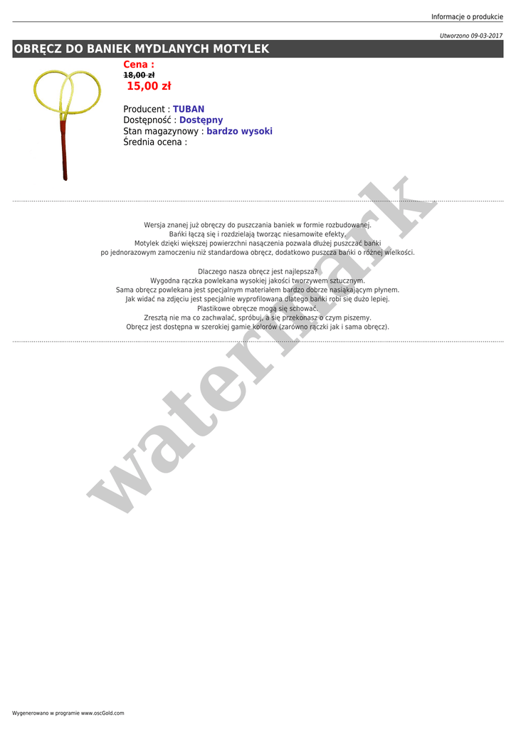 Informacje o produkcie Utworzono 09-03-2017 OBRĘCZ DO BANIEK MYDLANYCH MOTYLEK Cena : 18,00 zł 15,00 zł er m ar k Producent : TUBAN Dostępność : Dostępny Stan magazynowy : bardzo wysoki Średnia ocena : Wersja znanej już obręczy do puszczania baniek w formie rozbudowanej. Bańki łączą się i rozdzielają tworząc niesamowite efekty. Motylek dzięki większej powierzchni nasączenia pozwala dłużej puszczać bańki po jednorazowym zamoczeniu niż standardowa obręcz, dodatkowo puszcza bańki o różnej wielkości. w at Dlaczego nasza obręcz jest najlepsza? Wygodna rączka powlekana wysokiej jakości tworzywem sztucznym. Sama obręcz powlekana jest specjalnym materiałem bardzo dobrze nasiąkającym płynem. Jak widać na zdjęciu jest specjalnie wyprofilowana dlatego bańki robi się dużo lepiej. Plastikowe obręcze mogą się schować. Zresztą nie ma co zachwalać, spróbuj, a się przekonasz o czym piszemy. Obręcz jest dostępna w szerokiej gamie kolorów (zarówno rączki jak i sama obręcz). Wygenerowano w programie www.oscGold.com