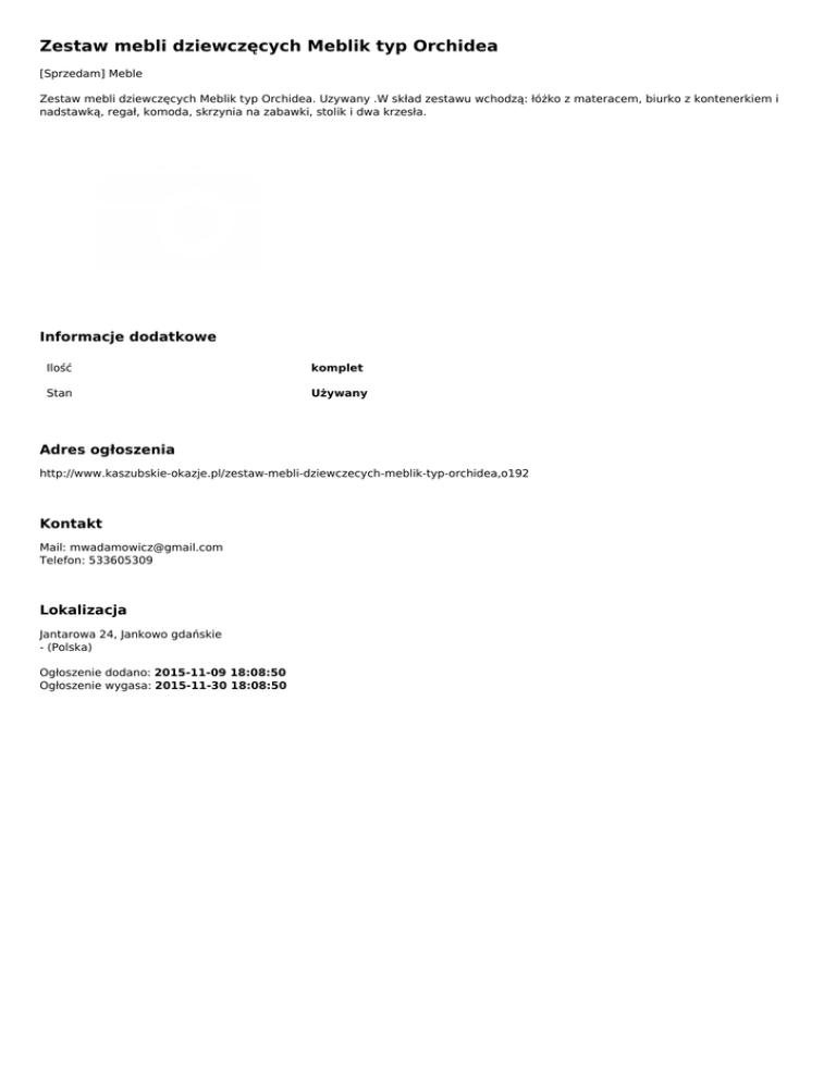Zestaw mebli dziewczęcych Meblik typ Orchidea [Sprzedam] Meble Zestaw mebli dziewczęcych Meblik typ Orchidea. Uzywany .W skład zestawu wchodzą: łóżko z materacem, biurko z kontenerkiem i nadstawką, regał, komoda, skrzynia na zabawki, stolik i dwa krzesła. Informacje dodatkowe Ilość komplet Stan Używany Adres ogłoszenia http://www.kaszubskie-okazje.pl/zestaw-mebli-dziewczecych-meblik-typ-orchidea,o192 Kontakt Mail: [email protected] Telefon: 533605309 Lokalizacja Jantarowa 24, Jankowo gdańskie - (Polska) Ogłoszenie dodano: 2015-11-09 18:08:50 Ogłoszenie wygasa: 2015-11-30 18:08:50 Powered by TCPDF (www.tcpdf.org)