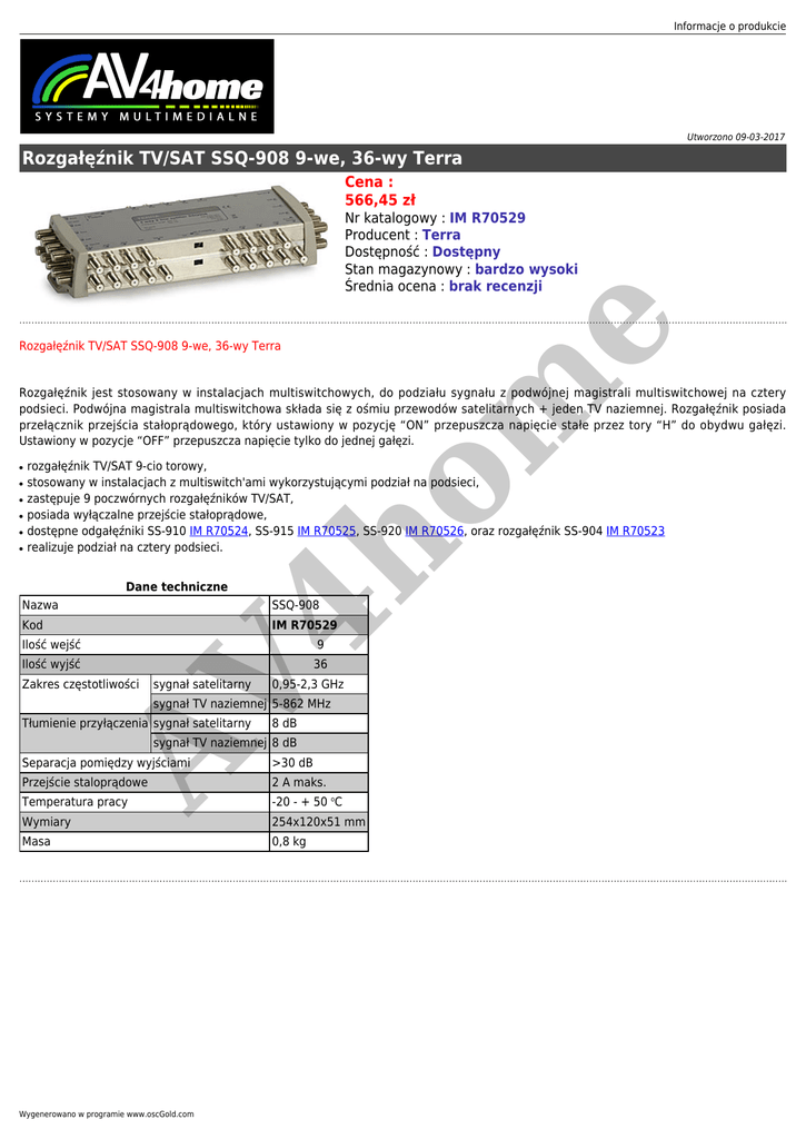 Rozgałęźnik TV/SAT SSQ-908 9-we, 36-wy Terra