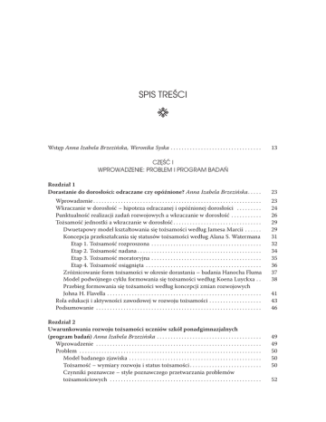 SPIS TREŚCI Wstęp Anna Izabela Brzezińska, Weronika Syska . . . . . . . . . . . . . . . . . . . . . . . . . . . . . . . . . . 13 CZĘŚĆ I WPROWADZENIE: PROBLEM I PROGRAM BADAŃ Rozdział 1 Dorastanie do dorosłości: odraczane czy opóźnione? Anna Izabela Brzezińska . . . . . 23 Wprowadzenie . . . . . . . . . . . . . . . . . . . . . . . . . . . . . . . . . . . . . . . . . . . . . . . . . . . . . . . . . . . . . 23 Wkraczanie w dorosłość – hipoteza odraczanej i opóźnionej dorosłości . . . . . . . . . . 24 Punktualność realizacji zadań rozwojowych a wkraczanie w dorosłość . . . . . . . . . . . . 26 Tożsamość jednostki a wkraczanie w dorosłość . . . . . . . . . . . . . . . . . . . . . . . . . . . . . . . . 29 Dwuetapowy model kształtowania się tożsamości według Jamesa Marcii . . . . . . . 29 Koncepcja przekształcania się statusów tożsamości według Alana S. Watermana .31 Etap 1. Tożsamość rozproszona . . . . . . . . . . . . . . . . . . . . . . . . . . . . . . . . . . . . . . . . . 32 Etap 2. Tożsamość nadana . . . . . . . . . . . . . . . . . . . . . . . . . . . . . . . . . . . . . . . . . . . . . 34 Etap 3. Tożsamość moratoryjna . . . . . . . . . . . . . . . . . . . . . . . . . . . . . . . . . . . . . . . . . 35 Etap 4. Tożsamość osiągnięta . . . . . . . . . . . . . . . . . . . . . . . . . . . . . . . . . . . . . . . . . . . 36 Zróżnicowanie form tożsamości w okresie dorastania – badania Hanocha Fluma 37 Model podwójnego cyklu formowania się tożsamości według Koena Luyckxa . . . 38 Przebieg formowania się tożsamości według koncepcji zmian rozwojowych Johna H. Flavella . . . . . . . . . . . . . . . . . . . . . . . . . . . . . . . . . . . . . . . . . . . . . . . . . . . . . . . . . 41 Rola edukacji i aktywności zawodowej w rozwoju tożsamości . . . . . . . . . . . . . . . . . . . . 43 Podsumowanie . . . . . . . . . . . . . . . . . . . . . . . . . . . . . . . . . . . . . . . . . . . . . . . . . . . . . . . . . . . . 46 Rozdział 2 Uwarunkowania rozwoju tożsamości uczniów szkół ponadgimnazjalnych (program badań) Anna Izabela Brzezińska . . . . . . . . . . . . . . . . . . . . . . . . . . . . . . . . . . . . . . . 49 Wprowadzenie . . . . . . . . . . . . . . . . . . . . . . . . . . . . . . . . . . . . . . . . . . . . . . . . . . . . . . . . . . . . . 49 Problem . . . . . . . . . . . . . . . . . . . . . . . . . . . . . . . . . . . . . . . . . . . . . . . . . . . . . . . . . . . . . . . . . . 50 Model badanego zjawiska . . . . . . . . . . . . . . . . . . . . . . . . . . . . . . . . . . . . . . . . . . . . . . . . . 50 Tożsamość – wymiary rozwoju i status tożsamości . . . . . . . . . . . . . . . . . . . . . . . . . . 50 Czynniki poznawcze – style poznawczego przetwarzania problemów tożsamościowych . . . . . . . . . . . . . . . . . . . . . . . . . . . . . . . . . . . . . . . . . . . . . . . . . . . . . . . . 52 6 Spis treści Czynniki emocjonalne – poczucie wstydu i poczucie winy . . . . . . . . . . . . . . . . . . . . 53 Czynniki społeczne – orientacja życiowa i typ partycypacji społecznej . . . . . . . . . 55 Problemy badawcze . . . . . . . . . . . . . . . . . . . . . . . . . . . . . . . . . . . . . . . . . . . . . . . . . . . . . 57 Plan badań . . . . . . . . . . . . . . . . . . . . . . . . . . . . . . . . . . . . . . . . . . . . . . . . . . . . . . . . . . . . . . . . . 58 Badania pilotażowe . . . . . . . . . . . . . . . . . . . . . . . . . . . . . . . . . . . . . . . . . . . . . . . . . . . . . . 58 Badania właściwe . . . . . . . . . . . . . . . . . . . . . . . . . . . . . . . . . . . . . . . . . . . . . . . . . . . . . . . 59 Organizacja badań . . . . . . . . . . . . . . . . . . . . . . . . . . . . . . . . . . . . . . . . . . . . . . . . . . . . . . . . . 61 Uczestnicy badań . . . . . . . . . . . . . . . . . . . . . . . . . . . . . . . . . . . . . . . . . . . . . . . . . . . . . . . . . . 61 Dobór i liczba badanych uczniów . . . . . . . . . . . . . . . . . . . . . . . . . . . . . . . . . . . . . . . . . . 61 Płeć i wiek (klasa) badanych uczniów . . . . . . . . . . . . . . . . . . . . . . . . . . . . . . . . . . . . . . 62 Wykształcenie rodziców badanych uczniów . . . . . . . . . . . . . . . . . . . . . . . . . . . . . . . . 63 Narzędzia badań . . . . . . . . . . . . . . . . . . . . . . . . . . . . . . . . . . . . . . . . . . . . . . . . . . . . . . . . . . . 63 Narzędzia stosowane w kolejnych etapach badań . . . . . . . . . . . . . . . . . . . . . . . . . . . 63 Opis narzędzi badawczych . . . . . . . . . . . . . . . . . . . . . . . . . . . . . . . . . . . . . . . . . . . . . . . . 65 Skala Wymiarów Rozwoju Tożsamości – DIDS/PL . . . . . . . . . . . . . . . . . . . . . . . 65 Historia i polska adaptacja narzędzia . . . . . . . . . . . . . . . . . . . . . . . . . . . . . . . . . 65 Konstrukcja kwestionariusza i obliczanie wyników . . . . . . . . . . . . . . . . . . . . 65 Kwestionariusz Stylów Przetwarzania Problemów Tożsamościowych – wersja ISI-4/PL . . . . . . . . . . . . . . . . . . . . . . . . . . . . . . . . . . . . . . . . . . . . . . . . . . . . . . . 67 Historia i polska adaptacja narzędzia . . . . . . . . . . . . . . . . . . . . . . . . . . . . . . . . . 67 Konstrukcja kwestionariusza i obliczanie wyników . . . . . . . . . . . . . . . . . . . . 68 Kwestionariusz Uczuć Osobistych – PFQ-2/PL . . . . . . . . . . . . . . . . . . . . . . . . . . 68 Historia i polska adaptacja narzędzia . . . . . . . . . . . . . . . . . . . . . . . . . . . . . . . . . 68 Konstrukcja kwestionariusza i obliczanie wyników . . . . . . . . . . . . . . . . . . . . . 69 Kwestionariusz Partycypacji Społecznej – KPS-S . . . . . . . . . . . . . . . . . . . . . . . . . 69 Historia narzędzia . . . . . . . . . . . . . . . . . . . . . . . . . . . . . . . . . . . . . . . . . . . . . . . . . 69 Konstrukcja kwestionariusza w wersji skróconej i obliczanie wyników . . . 70 Rzetelność narzę