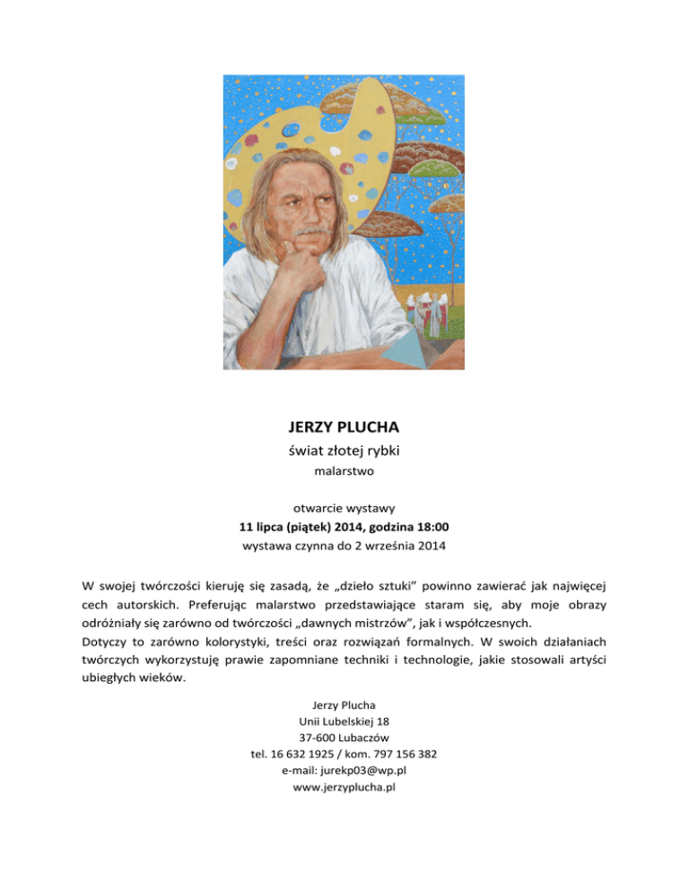 JERZY PLUCHA świat złotej rybki malarstwo otwarcie wystawy 11 lipca (piątek) 2014, godzina 18:00 wystawa czynna do 2 września 2014 W swojej twórczości kieruję się zasadą, że „dzieło sztuki” powinno zawierać jak najwięcej cech autorskich. Preferując malarstwo przedstawiające staram się, aby moje obrazy odróżniały się zarówno od twórczości „dawnych mistrzów”, jak i współczesnych. Dotyczy to zarówno kolorystyki, treści oraz rozwiązań formalnych. W swoich działaniach twórczych wykorzystuję prawie zapomniane techniki i technologie, jakie stosowali artyści ubiegłych wieków. Jerzy Plucha Unii Lubelskiej 18 37-600 Lubaczów tel. 16 632 1925 / kom. 797 156 382 e-mail: [email protected] www.jerzyplucha.pl Urodzony w 1951 r., w Lubaczowie. W 1980 r. ukończył studia na Wydziale Sztuk Pięknych Uniwersytetu Mikołaja Kopernika w Toruniu, specjalizacja konserwacja malarstwa i rzeźby polichromowanej. Obok pracy konserwatorskiej zajmuje się twórczością artystyczną. Uprawia malarstwo ścienne, sztalugowe oraz pastel. Bezpośrednio po studiach wykonywał głównie kopie dzieł dawnych mistrzów. Na przełomie lat 90. zajmował się własną twórczością artystyczną. Malował obrazy w konwencji realistycznej oraz abstrakcje. W latach 90. zarzucił całkowicie sztukę nieprzedstawiającą, by poświęcić się malarstwu realistycznemu. Malował martwe natury, pejzaże, sceny mitologiczne i alegorie. Z końcem lat 90. pojawił się w jego twórczości nowy temat – anioły. Cykl ten kontynuuje do dziś. W swoim dorobku ma szereg wystaw indywidualnych i zbiorowych, zarówno w kraju jak i poza granicami m.in. w Warszawie, Rzeszowie, Jarosławiu, Przemyślu, Sandomierzu, Baranowie Sandomierskim, Tostedt /Niemcy i Erd /Węgry. Od początku lat 90. do 2003 r. wielokrotnie wystawiał swoje prace w Miejskim Domu Kultury oraz w Muzeum w Lubaczowie. W latach 2005-2006 brał udział w wielu wystawach i aukcjach charytatywnych m.in. w wystawie „Bliźniemu swemu” / Warszawa, Poznań, Katowice, Kraków, Wrocław, Rzeszów. Ważniejsze wystawy zbiorowe: Artefakty – 5 / I jeszcze raz o człowieku / Przemyśl / Sandomierz, 2005, 2006; międzynarodowa wystawa „Wyznanie Europy”, Erd / Węgry, 2006; Stulecie ZPAP Rzeszów 2012, Pałac Sztuki we Lwowie. Wystawy indywidualne: BWA Przemyśl; Budapeszt „Dom Polski” 2009; Jarosław – Galeria u Attavantich 2010; Zamek w Krasiczynie / Baszta Królewska 2011. Wiele prac znajduje się w kolekcjach państwowych i prywatnych w kraju i za granicą. zapraszamy www.bwaprzemysl.pl
