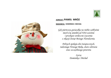 ADRESAT: PAWEŁ MRÓZ NADAWCA: DOMINIKA i MICHAŁ Gdy pierwsza gwiazdka na niebie zabłyśnie niech Cię aniołek od NAS uściśnie i przekaże serdeczne życzenia z okazji Świąt Bożego Narodzenia. Pełnych spokoju dni świątecznych, radosnego Nowego Roku, dużo zdrowia oraz szczęśliwego powrotu życzą Dominika i Michał