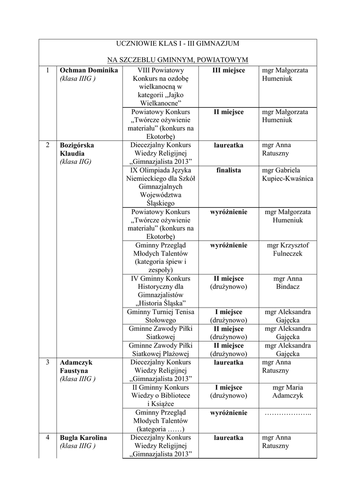 UCZNIOWIE KLAS I - III GIMNAZJUM 1 2 3 4 NA SZCZEBLU GMINNYM, POWIATOWYM VIII Powiatowy Ochman Dominika III miejsce (klasa IIIG ) Konkurs na ozdobę wielkanocną w kategorii „Jajko Wielkanocne” Powiatowy Konkurs II miejsce „Twórcze ożywienie materiału” (konkurs na Ekotorbę) Diecezjalny Konkurs Bozigórska laureatka Wiedzy Religijnej Klaudia (klasa IIG) „Gimnazjalista 2013” IX Olimpiada Języka finalista Niemieckiego dla Szkół Gimnazjalnych Województwa Śląskiego Powiatowy Konkurs wyróżnienie „Twórcze ożywienie materiału” (konkurs na Ekotorbę) Gminny Przegląd wyróżnienie Młodych Talentów (kategoria śpiew i zespoły) IV Gminny Konkurs II miejsce Historyczny dla (drużynowo) Gimnazjalistów „Historia Śląska” Gminny Turniej Tenisa I miejsce Stołowego (drużynowo) Gminne Zawody Piłki II miejsce Siatkowej (drużynowo) Gminne Zawody Piłki II miejsce Siatkowej Plażowej (drużynowo) Diecezjalny Konkurs Adamczyk laureatka Wiedzy Religijnej Faustyna (klasa IIIG ) „Gimnazjalista 2013” II Gminny Konkurs I miejsce Wiedzy o Bibliotece (drużynowo) i Książce Gminny Przegląd wyróżnienie Młodych Talentów (kategoria ……) Diecezjalny Konkurs Bugla Karolina laureatka (klasa IIIG ) Wiedzy Religijnej „Gimnazjalista 2013” mgr Małgorzata Humeniuk mgr Małgorzata Humeniuk mgr Anna Ratuszny mgr Gabriela Kupiec-Kwaśnica mgr Małgorzata Humeniuk mgr Krzysztof Fulneczek mgr Anna Bindacz mgr Aleksandra Gajęcka mgr Aleksandra Gajęcka mgr Aleksandra Gajęcka mgr Anna Ratuszny mgr Maria Adamczyk ……………….. mgr Anna Ratuszny 5 Fulneczek Magdalena (klasa IIIG ) 6 Pawlik Patryk (klasa IIG ) 7 Gębska Dorota (klasa IIIG ) 8 Karnówka Anna 9 Luleczka D 10 Luleczka L 11 Matuszek K 12 Biczysko Sabina 13 Pytel Paula Powiatowy Konkurs „Twórcze ożywienie materiału” (konkurs na Ekotorbę) II Gminny Konkurs Wiedzy o Bibliotece i Książce VIII Powiatowy Konkurs na ozdobę wielkanocną w kategorii „Jajko wielkanocne” Powiatowy Konkurs Twórczości Artystycznej (kategoria: recytacja) IV Gminny Konkurs Historyczny dla Gimnazjalistów „Historia Śląska” Gminny Przegląd Młodych Talentów (kategoria śpiew, zespoły) Gminny Konkurs Recytatorski Gminny Konkurs Ortograficzny Akcje charytatywne organizowane na terenie szkoły Powiatowy Konkurs „Twórcze ożywienie materiału” (konkurs na Ekotorbę) Powiatowy Konkurs Pożarniczy „Młodzież Zapobiega Pożarom” Gminne Zawody – Biegi Przełajowe Gminne Zawody Piłki Siatkowej Gminne Zawody – Biegi Przełajowe Gminne Zawody – Biegi Przełajowe Gminne Zawody – Biegi Przełajowe Gminne Zawody – Biegi Przełajowe Gminne Zawody Piłki Siatkowej Gminne Zawody – Biegi Przełajowe III miejsce mgr Małgorzata Humeniuk I miejsce (drużynowo) mgr Maria Adamczyk wyróżnienie mgr Małgorzata Humeniuk III miejsce mgr Renata Gołąbek II miejsce (drużynowo) mgr Anna Bindacz wyróżnienie mgr Krzysztof Fulneczek I miejsce mgr Renata Gołąbek mgr Renata Gołąbek mgr Sabina Nowak I miejsce udział I miejsce mgr Małgorzata Humeniuk III miejsce mgr Piotr Hluchnik II miejsce (drużynowo) II miejsce (drużynowo) II miejsce (drużynowo) II miejsce (drużynowo) II miejsce (drużynowo) II miejsce (drużynowo) II miejsce (drużynowo) II miejsce (drużynowo) mgr Aleksandra Gajęcka mgr Aleksandra Gajęcka mgr Aleksandra Gajęcka mgr Aleksandra Gajęcka mgr Aleksandra Gajęcka mgr Aleksandra Gajęcka mgr Aleksandra Gajęcka mgr Aleksandra Gajęcka 14 Bulenda Aron 15 Ciuberek Kamil 16 Jureczka Kamil 17 Sbeczka Dawid 18 Kwaśnica Julia 19 Lasak Anna 20 Mikołajek Monika 21 Pradela Patrycja 22 Natalia Jęczmionka ( klasa IIa) 23 24 Fichna Natalia Oczadły Katarzyna Gminny Przegląd Młodych Talentów (kategoria zespoły) Gminne Zawody Piłki Siatkowej Plażowej Gminny Przegląd Młodych Talentów (kategoria zespoły) Gminny Przegląd Młodych Talentów (kategoria zespoły) Gminny Przegląd Młodych Talentów (kategoria zespoły) wyróżnienie mgr Krzysztof Fulneczek II miejsce (drużynowo) wyróżnienie Mgr Krzysztof Popławski mgr Krzysztof Fulneczek wyróżnienie mgr Krzysztof Fulneczek wyróżnienie mgr Krzysztof Fulneczek Gminny Przegląd Młodych Talentów (kategoria śpiew) Gminny Przegląd Młodych Talentów (kategoria śpiew) Gminny Przegląd Młodych Talentów (kategoria śpiew) Gminny Przegląd Młodych Talentów (kategoria śpiew) Gminny Przegląd Młodych Talentów (kategoria recytacja) Gminny Przegląd Młodych Talentów (kategoria śpiew i zespoły) Gminny Przegląd Młodych Talentów (kategoria śpiew, zespoły) Gminne Zawody Piłki Siatkowej Gminne Zawody Piłki Siatkowej Plażowej Gminny Przegląd Młodych Talentów (kategoria śpiew i zespoły) Gminne Zawody Piłki Siatkowej Gminny Przegląd Młodych Talentów (kategoria śpiew i zespoły) Gminny Turniej Tenisa wyróżnienie mgr Krzysztof Fulneczek wyróżnienie mgr Krzysztof Fulneczek wyróżnienie mgr Krzysztof Fulneczek wyróżnienie mgr Krzysztof Fulneczek wyróżnienie mgr Renata Gołąbek wyróżnienie mgr Krzysztof Fulneczek wyróżnienie mgr Krzysztof Fulneczek II miejsce (drużynowo) II miejsce (drużynowo) wyróżnienie mgr Aleksandra Gajęcka mgr Aleksandra Gajęcka mgr Krzysztof Fulneczek II miejsce (drużynowo) wyróżnienie mgr Aleksandra Gajęcka mgr Krzysztof Fulneczek I miejsce mgr Aleksandra 25 Tkaczyk Adrianna 26 Minkina Karolina 27 Pientka Bożena 28 Wolny Kamil ( klasa IIb) 29 Cwik Marcin 30 Taborski Kacper 31 Fichna Rafał 32 Pradela Patryk 33 Biły Dominik 34 Furtok Maciej 35 Kamczyk Simona 36 Tlon Kamil Stołowego Gminne Zawody Piłki Siatkowej Gminny Przegląd Młodych Talentów (kategoria śpiew i zespoły) Gminny Przegląd Młodych Talentów (kategoria śpiew) Gminny Przegląd Młodych Talentów (kategoria śpiew) VIII Powiatowy Konkurs na ozdobę wielkanocną w kategorii „Kartka wielkanocna” Gminne Zawody – Biegi Przełajowe IV Gminny Konkurs Historyczny dla Gimnazjalistów „Historia Śląska” Gminny 