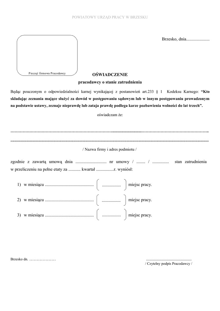 POWIATOWY URZĄD PRACY W BRZESKU Brzesko, dnia..................... P ieczęć firmowa Pracodawcy OŚWIADCZENIE pracodawcy o stanie zatrudnienia Będąc pouczonym o odpowiedzialności karnej wynikającej z postanowień art.233 § 1 Kodeksu Karnego: “Kto składając zeznania mające służyć za dowód w postępowaniu sądowym lub w innym postępowaniu prowadzonym na podstawie ustawy, zeznaje nieprawdę lub zataja prawdę podlega karze pozbawienia wolności do lat trzech”. oświadczam że: ………………………………………………………………….............................………………………………………….. ................................................................................................................................................................................................... / Nazwa firmy i adres podmiotu / zgodnie z zawartą umową dnia ............................ nr umowy / ........ / ............... stan zatrudnienia w przeliczeniu na pełne etaty za ........... kwartał ................r. wyniósł: 1) w miesiącu ............................................ ................. miejsc pracy. 2) w miesiącu ............................................ ................. miejsc pracy. 3) w miesiącu ............................................ ................. miejsc pracy. Brzesko dn. ……………… ......................................... / Czytelny podpis Pracodawcy /